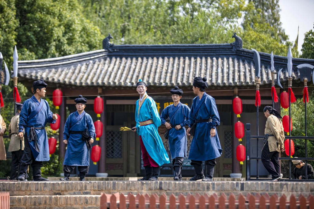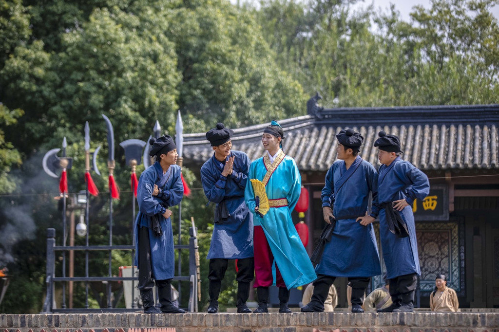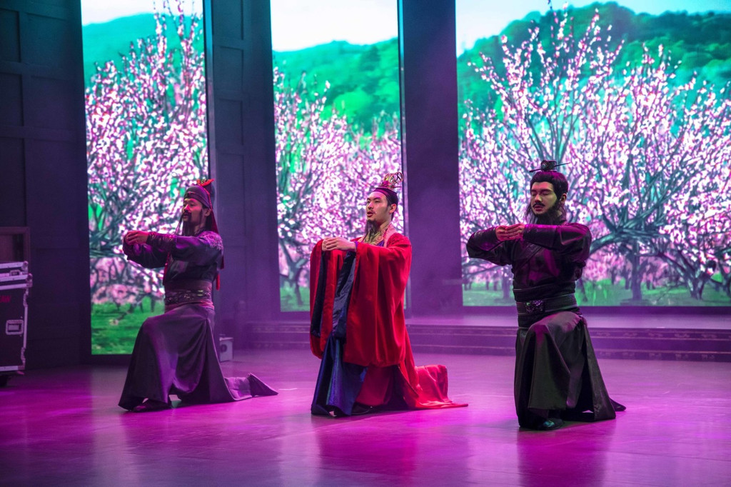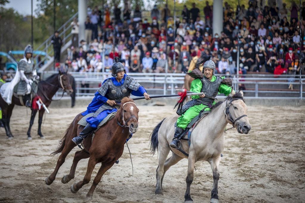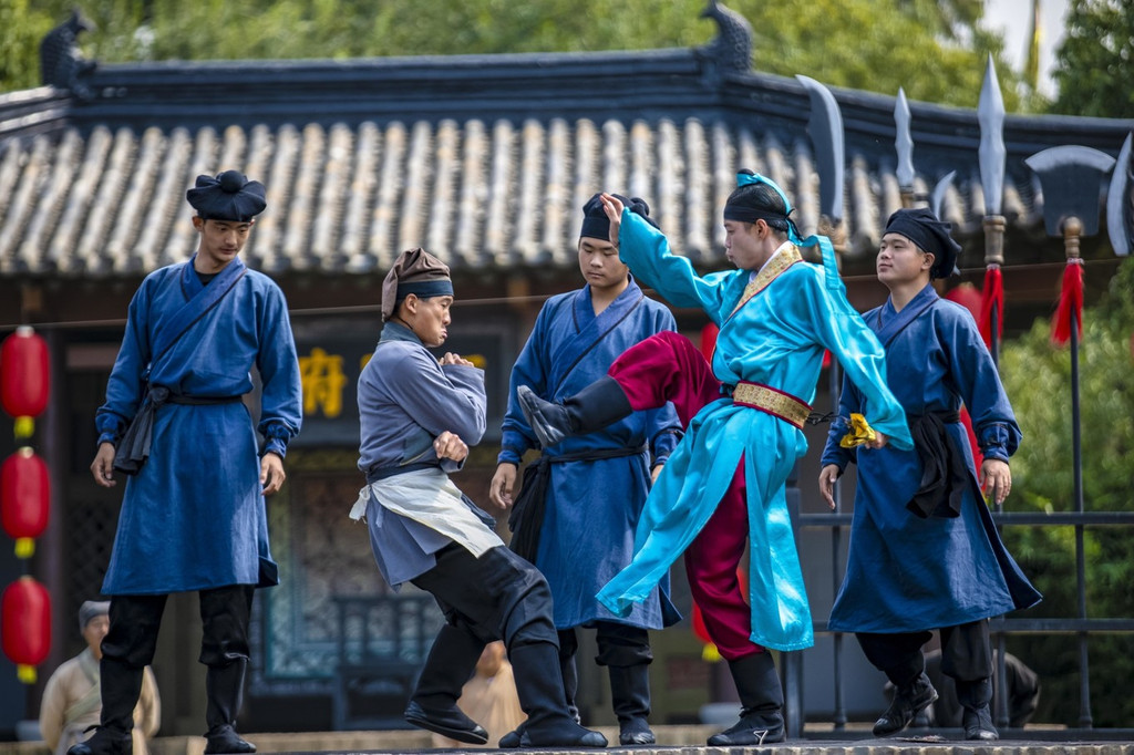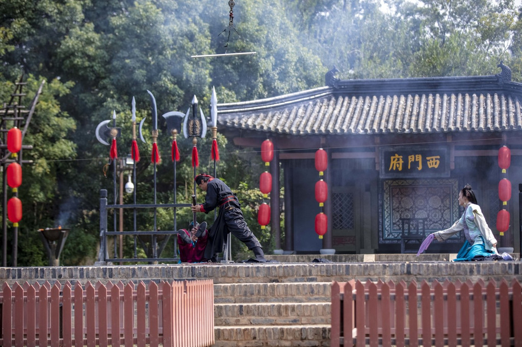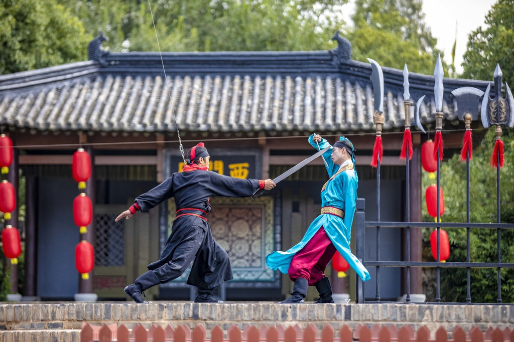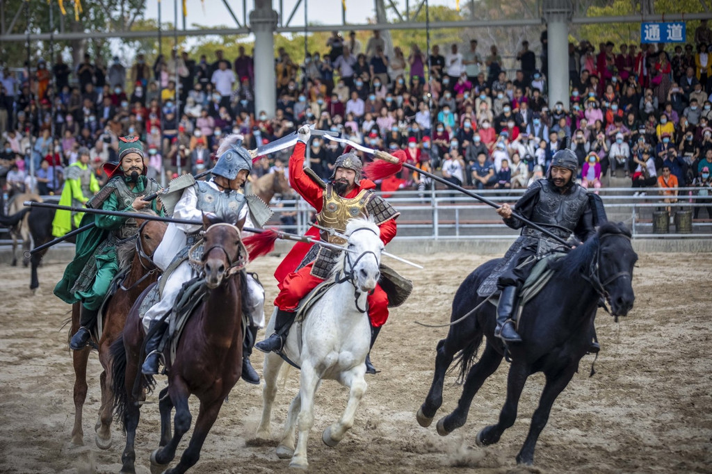 《三英战吕布》,再现真实战争场景,演员们骑在马背上刀枪剑戟打斗的正酣,其场面宏阔,真实生动,演员们入戏很深,一招一式都展示着扎实的武术功底和表演实力,引得现场观看演出的游客发出连连的欢呼声和感叹声。