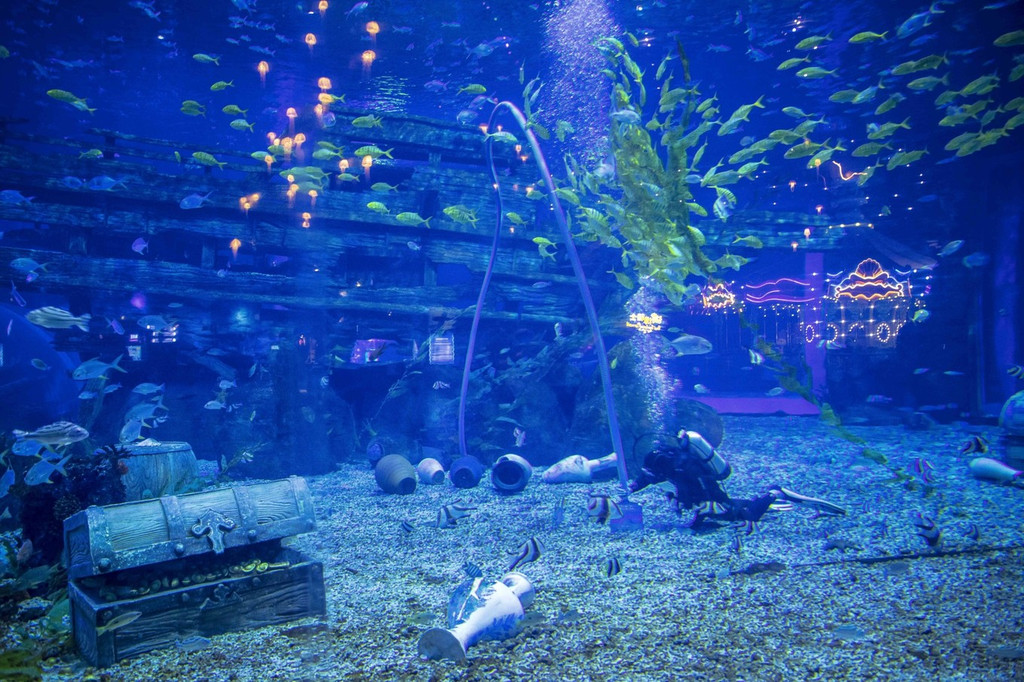 穿梭在海底隧道中,这里有着千姿百态的海洋生物,在水下礁石的'岩缝之中和缠绕的海藻之间穿梭,站在隧道下抬头看,仿佛身临其境与各种鱼儿、海龟一同遨游,仿佛置身于海洋中,其乐无穷。