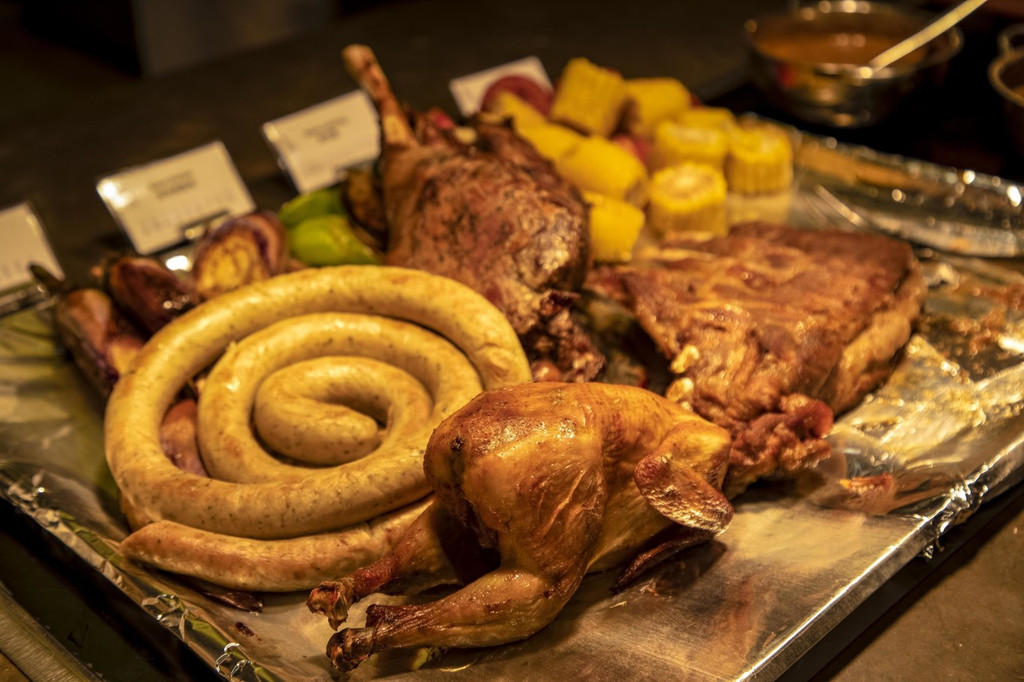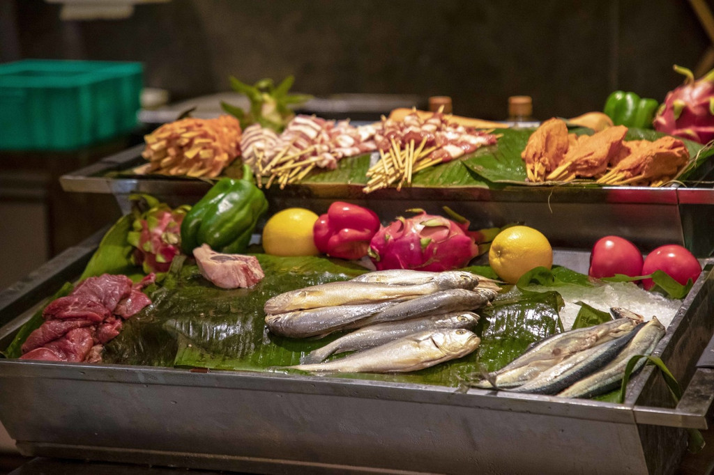 烧烤类的菜品,想吃什么可以叫厨师帮你烤,过一会自己来拿就可以了,烤串、烤肉、烤鱼总有一款能够满足你。