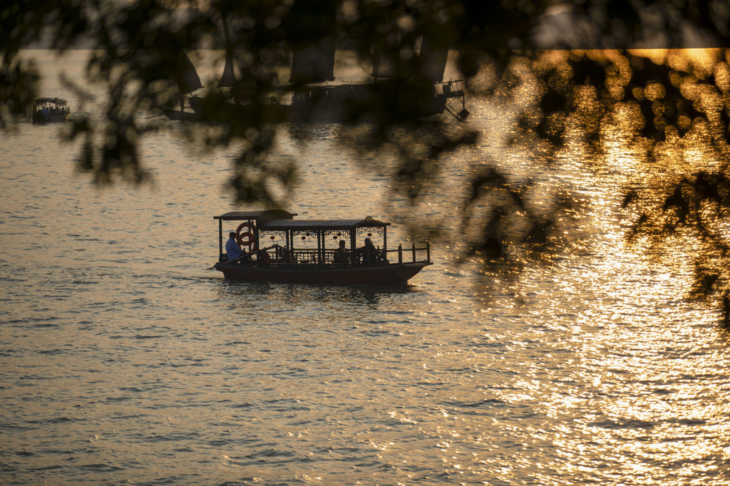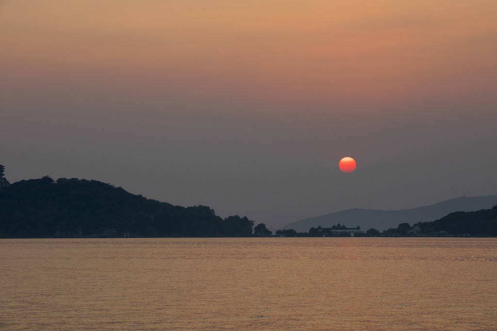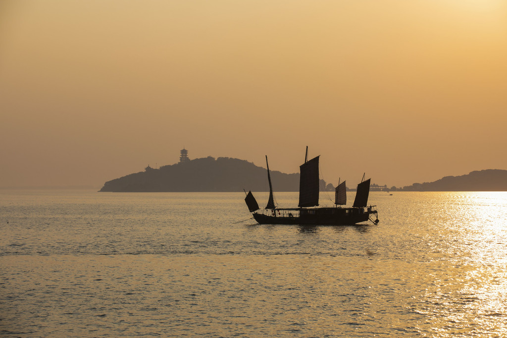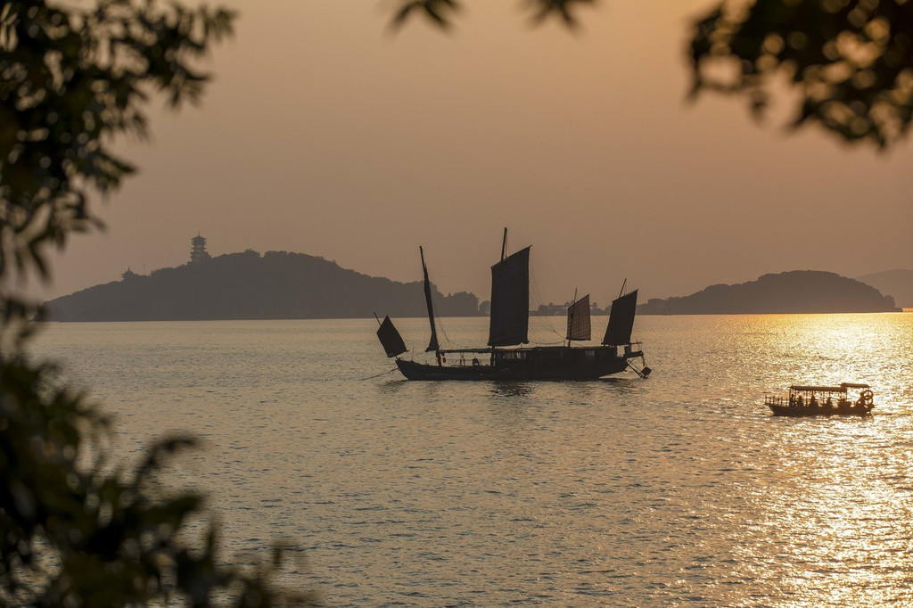 在 无锡 ,鼋头渚的日落是绝对不可错过的美景,傍晚时分的湖面,渔船点点,落日从容平静的坠入地平线,给每一处风景都染上了余晖。