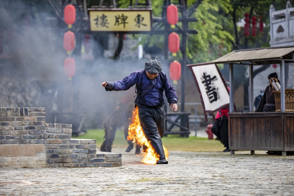 武大郎被杀害后,武松与西门庆缠斗,吊威亚空中飞人,真人浴火,这些影视剧中的特殊场景,一一展现我们面前,虽说只是一场小小的表演,但剧中的演员真的是十分的敬业。