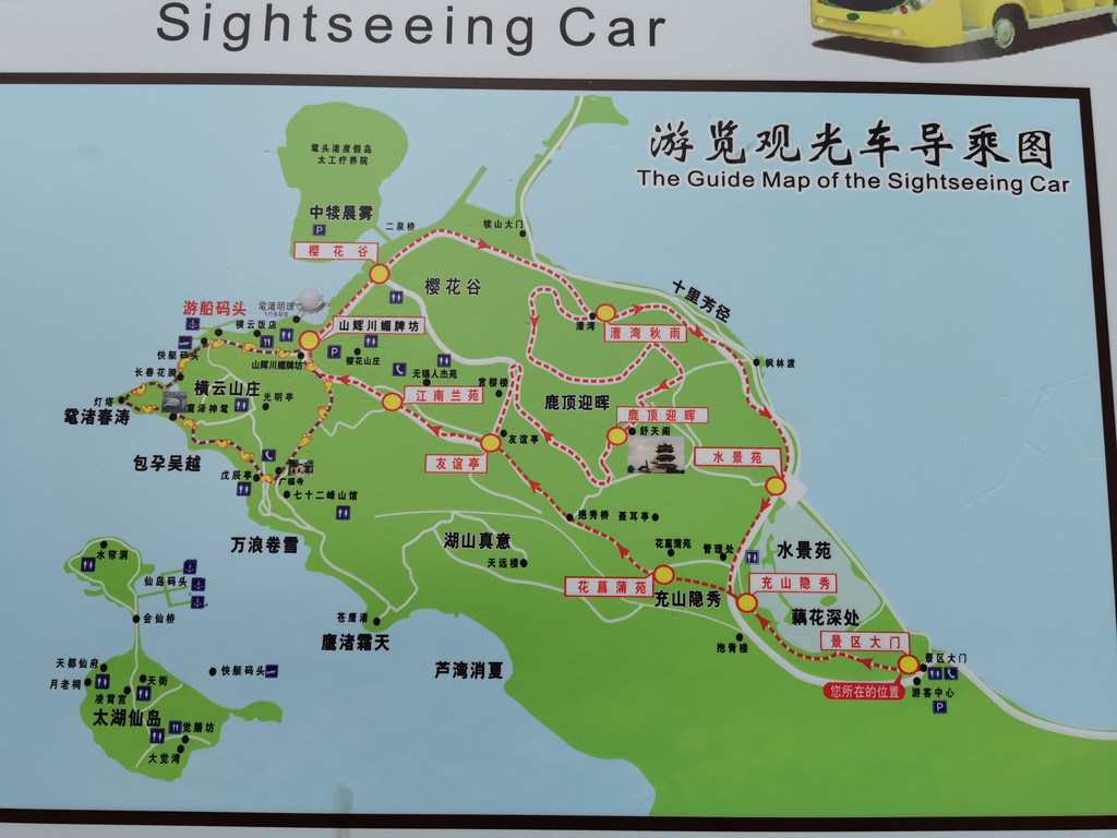 鼋头渚景区有两个进出的大门,一个是充山大门,另外个是犊山大门,建议还是从充山大门进景区,正大门旁有接送游客的电瓶车,且都是行驶于景区的主要景点,景区比较大,建议还是乘坐景区内的电瓶车比较方便些。