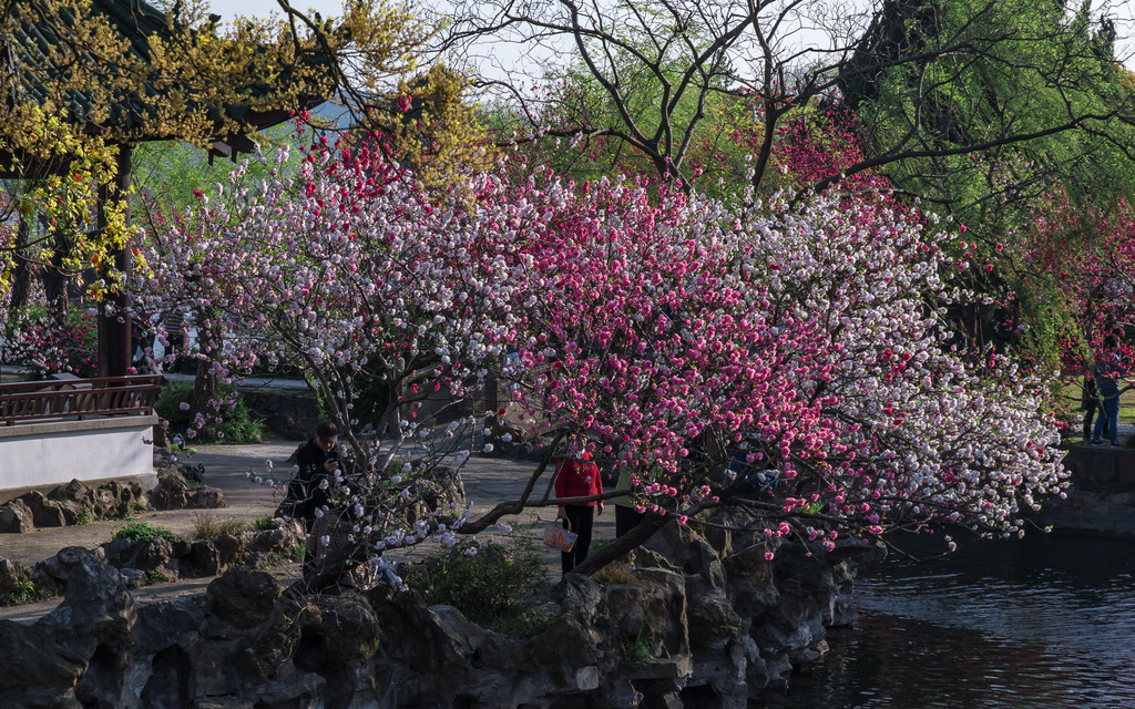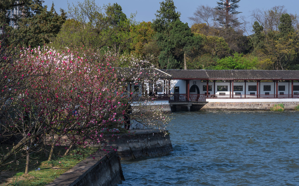 在无锡园林界,一直有种说法:鼋头渚景区的特点是“真山真水”,锡惠公园的特点是“真山假水”,而蠡园的特点是“假山真水”。因为蠡园内除了有太湖石垒砌的假山,整座园林并没有依傍山体,而亲近的蠡湖,却赋予蠡园“真水”的自然条件。其实去蠡园游玩,赏蠡湖的自然风光,才是最主要的。蠡园的春天,是一幅江南的水墨画,那堤岸上的一抹绿、一点红,便是这幅画中的点睛之笔。