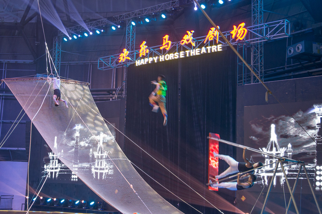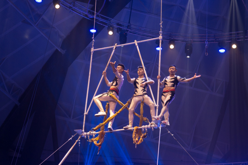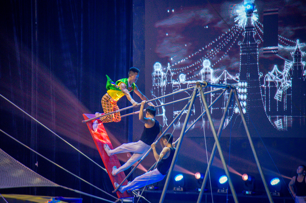 此次的夏季狂欢夜,大马戏里还有一场特别的杂技《浪桥飞人》,“浪桥”看似与荡秋千相似,但是演员们借助摆动的“浪桥”的惯性,会选择最佳时机向前“飞行”,并在空中做出高难度的翻转动作,最高的时候可将演员抛掷9米高。最后,在这场紧张的飞人中结束了这场精彩的大马戏。