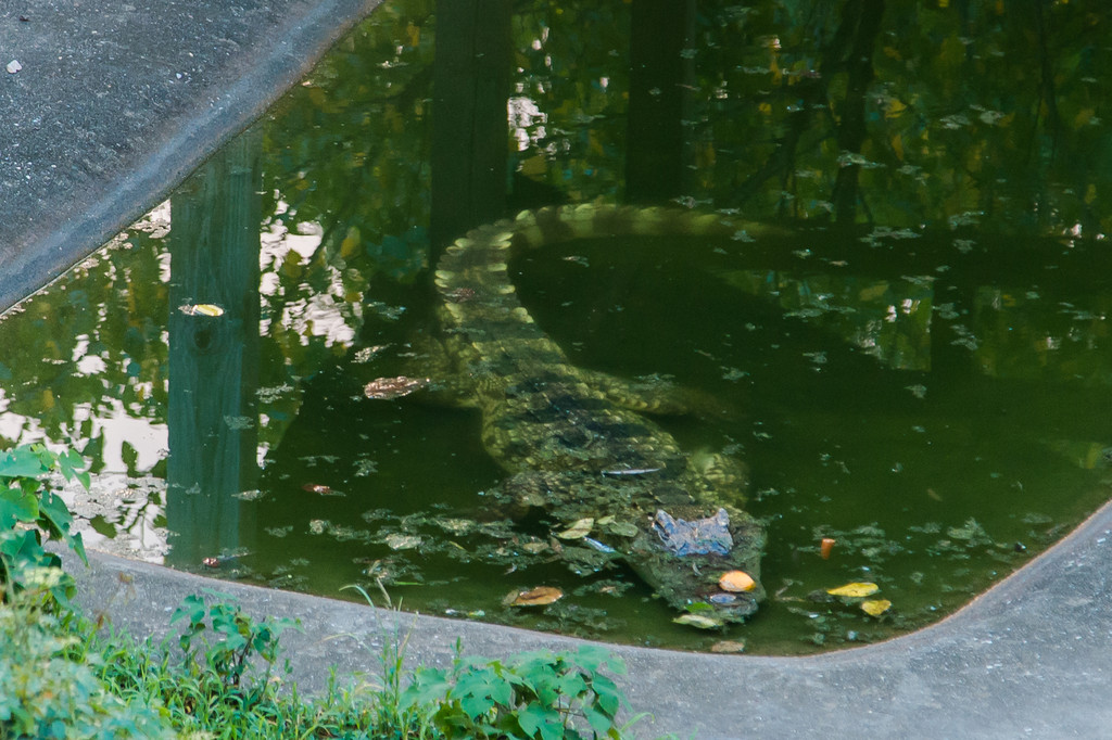 一个不规则形状的池子里,一条鳄鱼正懒洋洋地趴着,与水的青色快融合在一起了,要不是仔细的寻找,还真的看不到。
