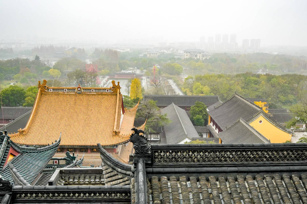 金山寺,又名江天禅寺,还有龙游寺等曾用名,山门的牌匾上“江天禅寺”四字,为康熙所书,大雄宝殿周围围着雕花白石柱,金色琉璃瓦覆顶,在周围一片黑色、青色的屋顶间格外显眼,非常气派。