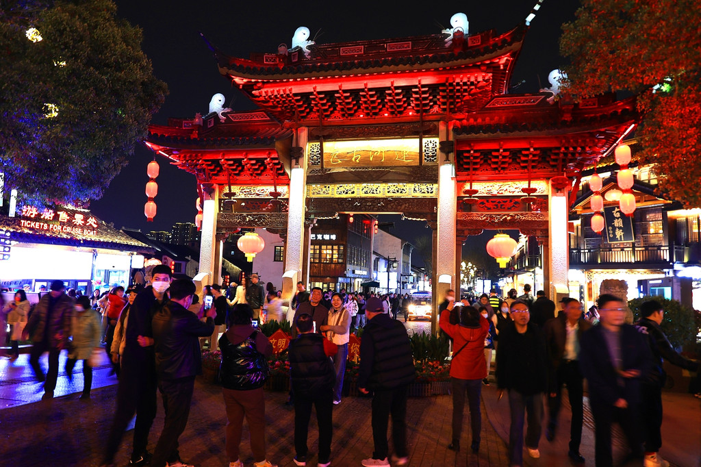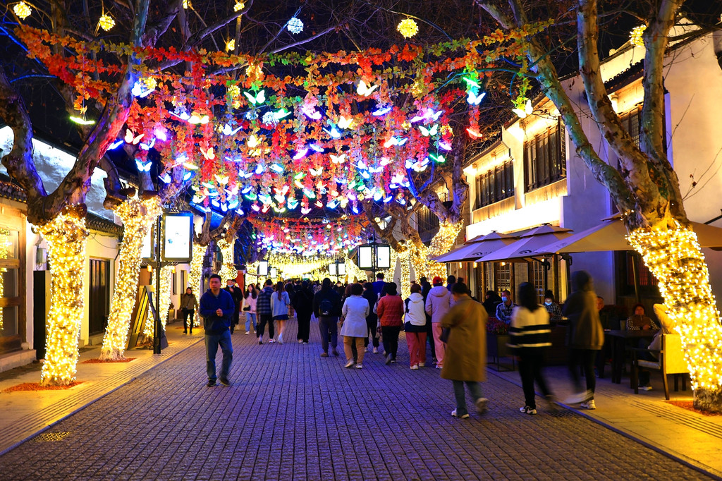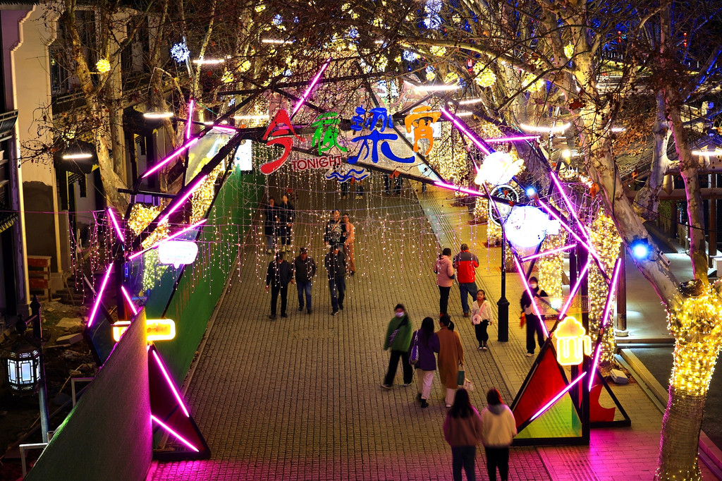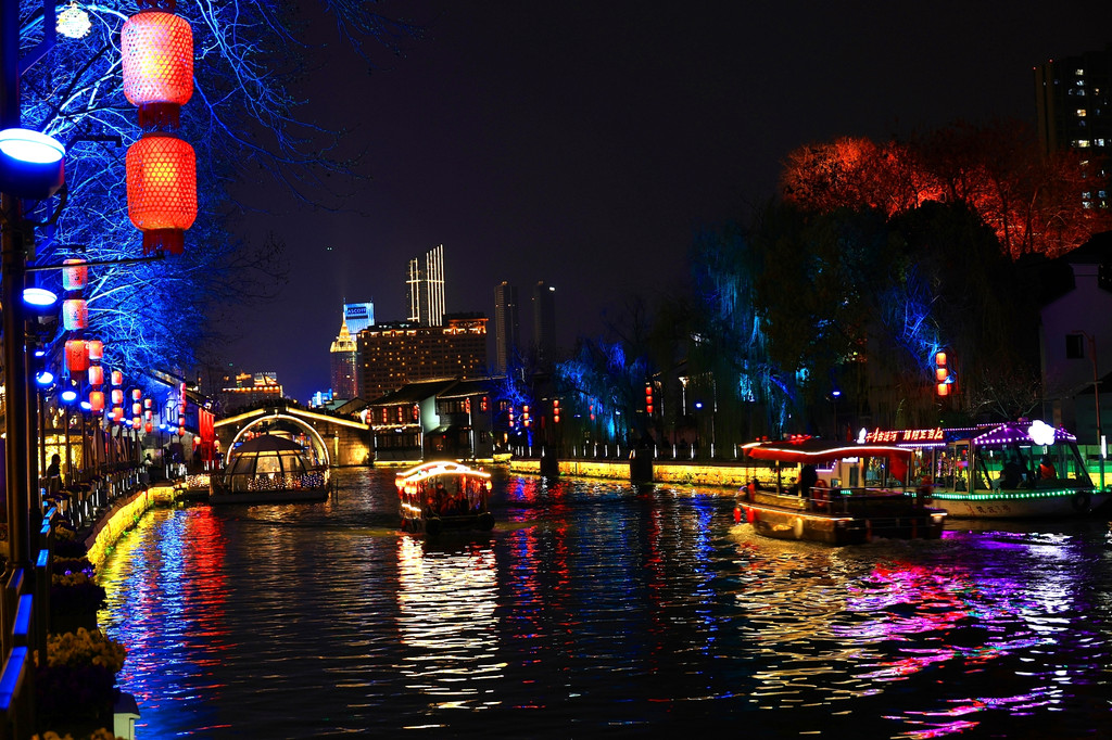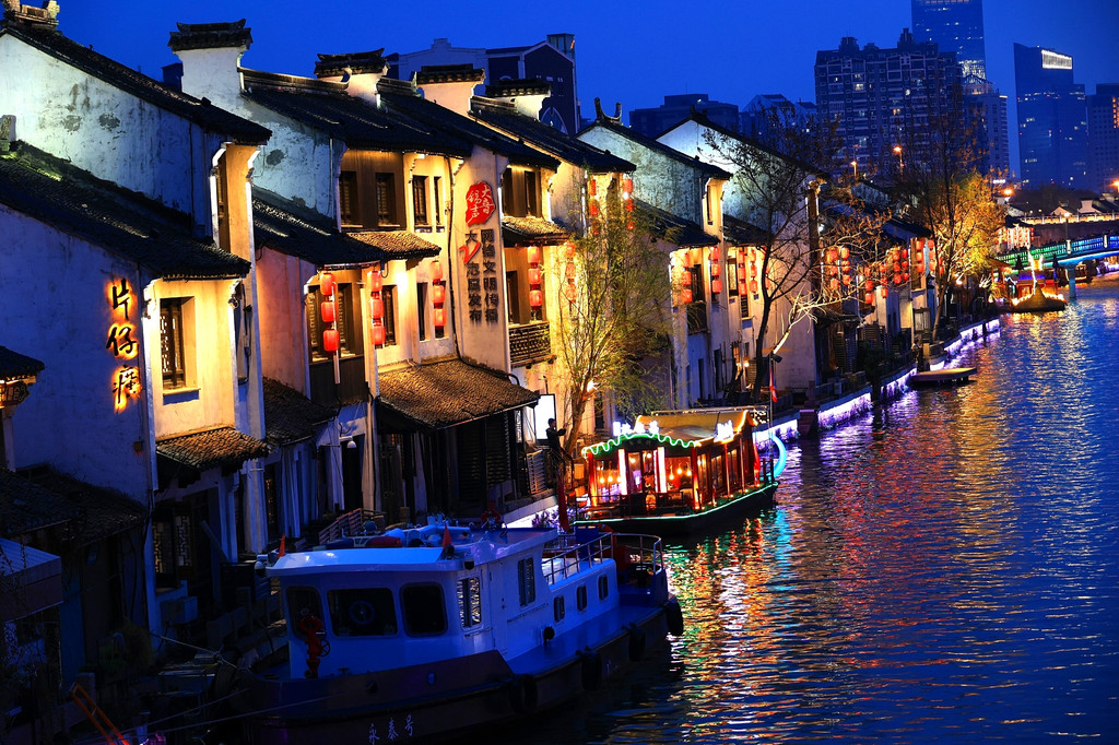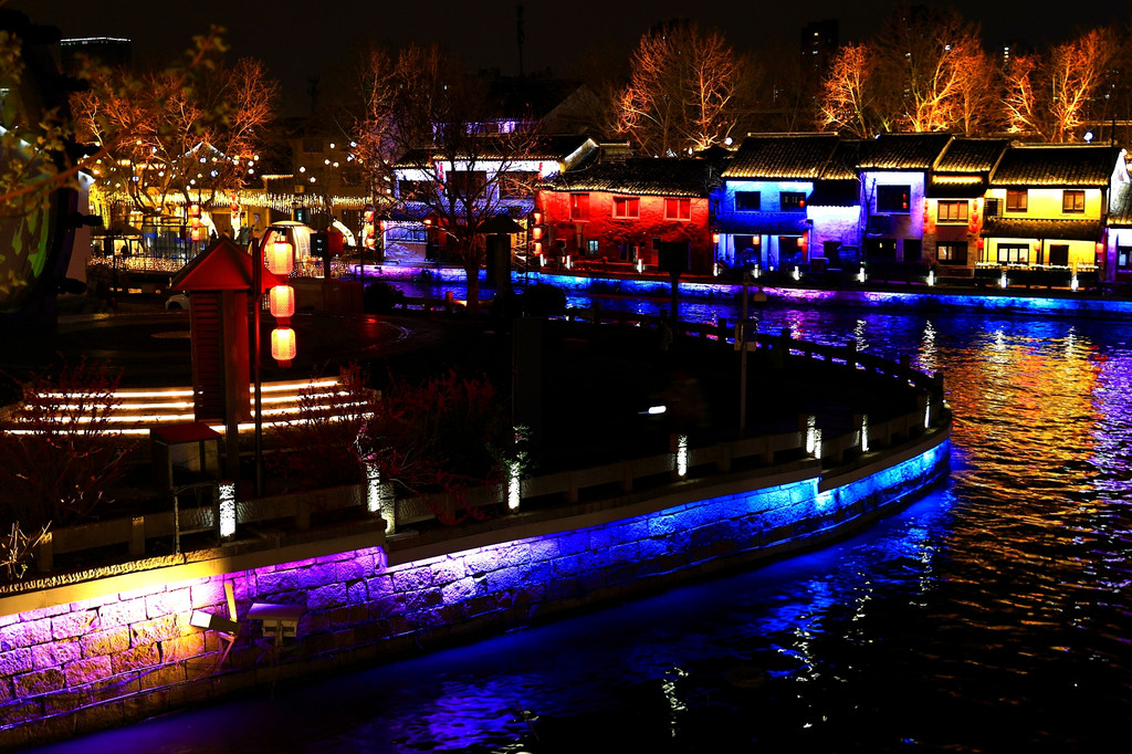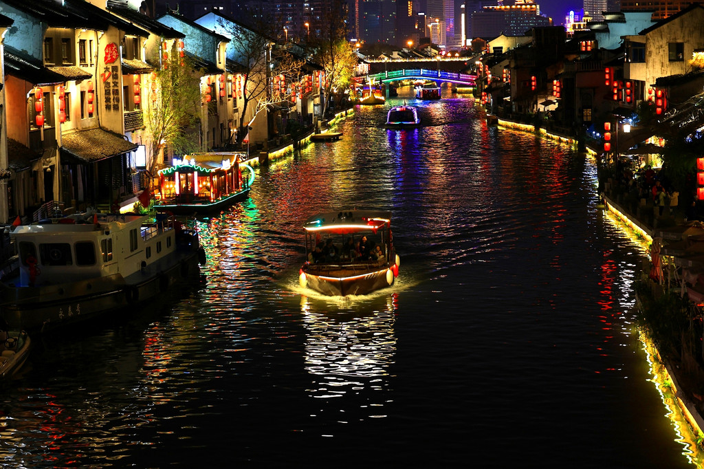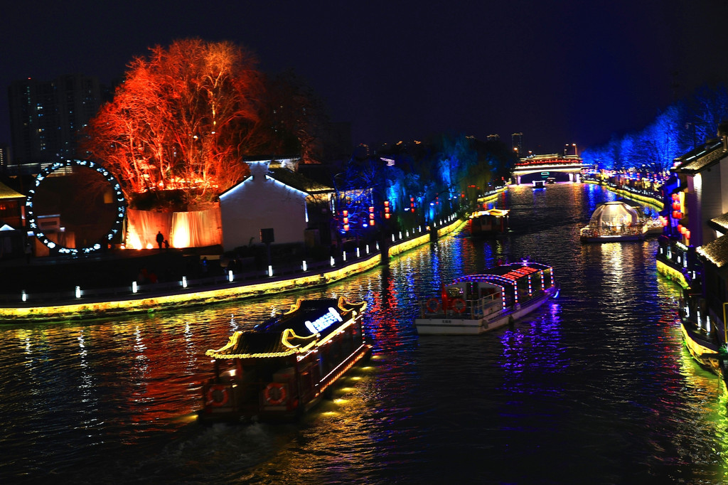 今天是星期六,周末的景区游人如织、熙熙攘攘。当夜幕降临,古运河边粉墙黑瓦的老宅子亮起了灯,一串串红灯笼倒映在运河里,两岸的仿古建筑在灯光加持下,尤其漂亮,吸引着不少游人驻足观赏。