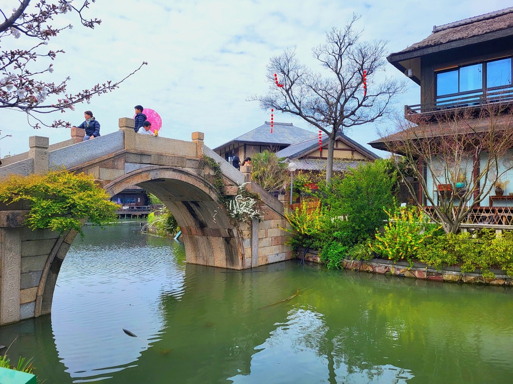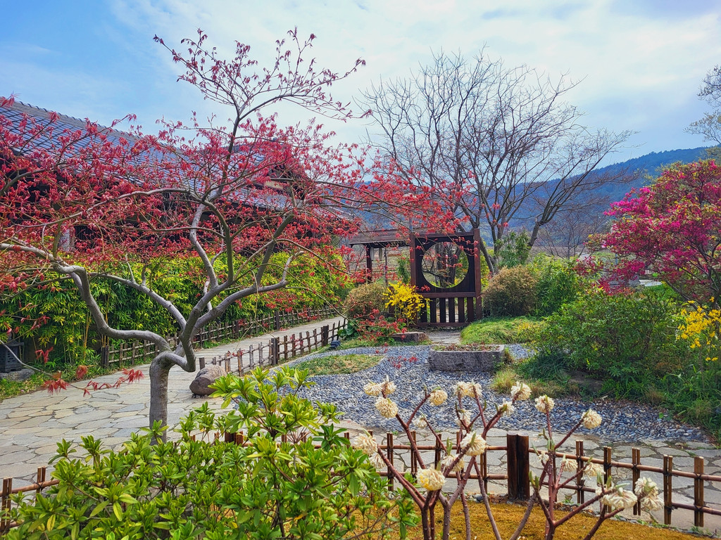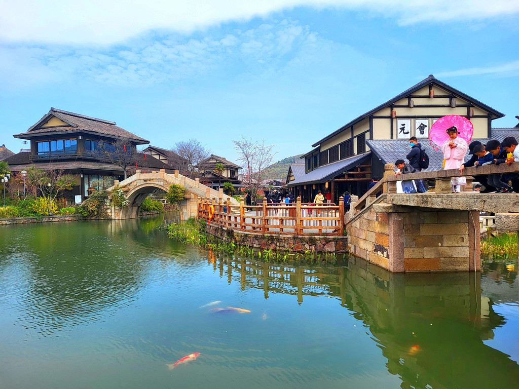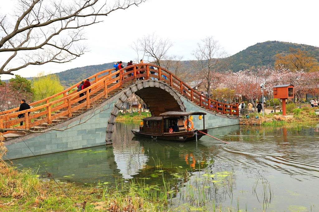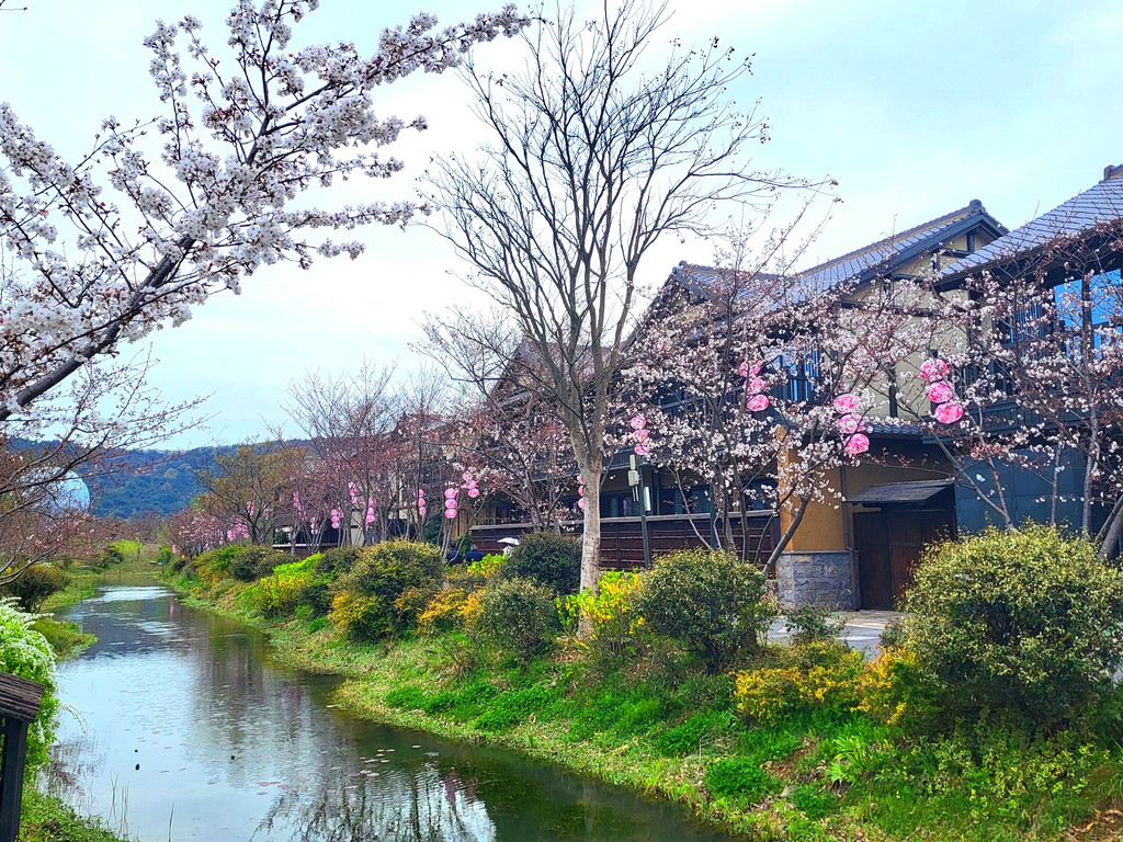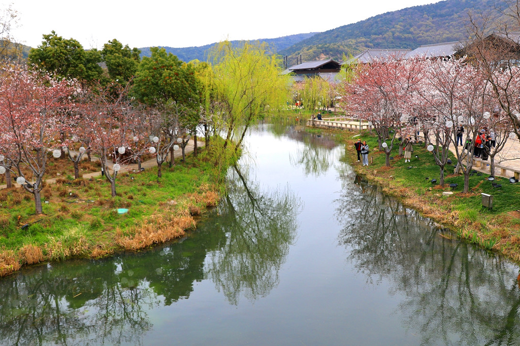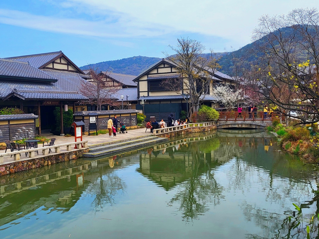 1、拈花湾的樱花虽然没有鼋头渚那么出名,但里面的樱花树也不少,与小桥流水、田园风光和各种建筑等景致相映衬,景色是很靓丽、很吸睛的,也是一个赏樱的好去处。
