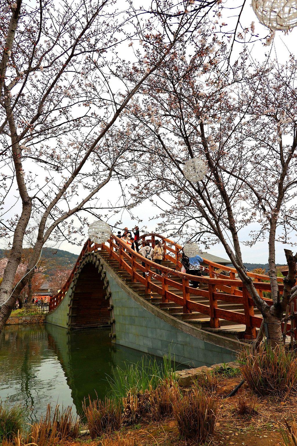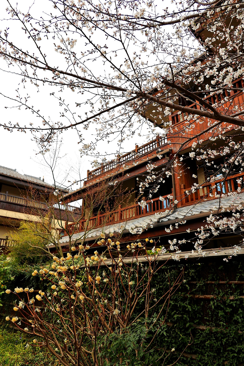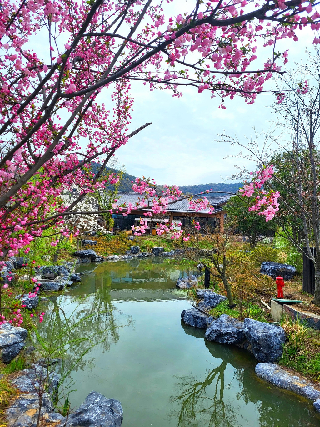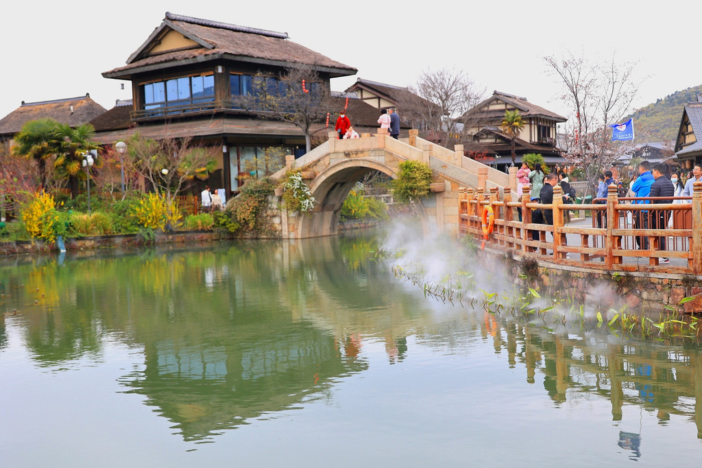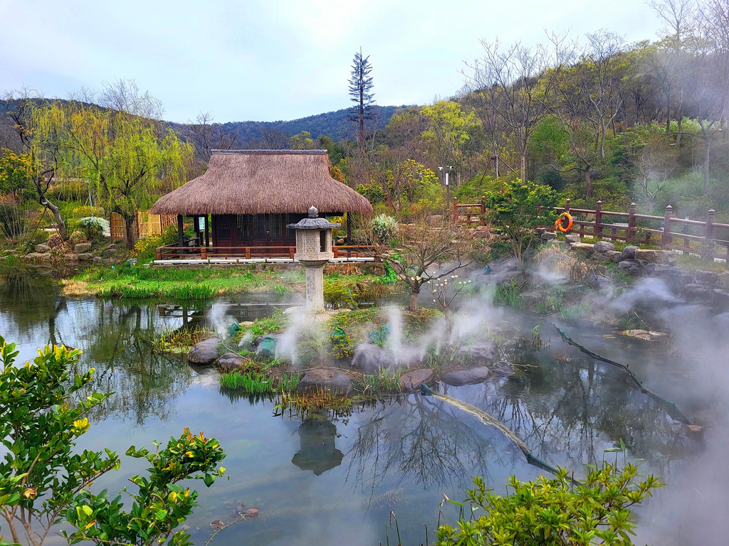 1、拈花湾的樱花虽然没有鼋头渚那么出名,但里面的樱花树也不少,与小桥流水、田园风光和各种建筑等景致相映衬,景色是很靓丽、很吸睛的,也是一个赏樱的好去处。