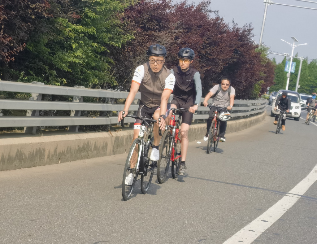 第一天,中午出发,新手上路,一切都让人感到兴奋。领队在前头带路,适当地慢下速度。好天气和湖边的美景,让骑行变得愉快。经过苏州的湖边路,感受到了人间的烟火气。为了更好地欣赏湖边的美景,我们决定沿湖路线,结果多骑了近13公里,晚上8点左右到达第一天的酒店。