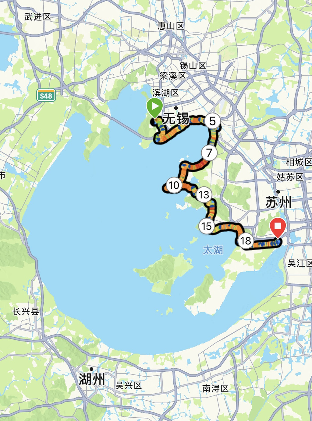 从雪浪山东门停车场出发,目标苏州太湖国家湿地公园北门停车场,距离35km