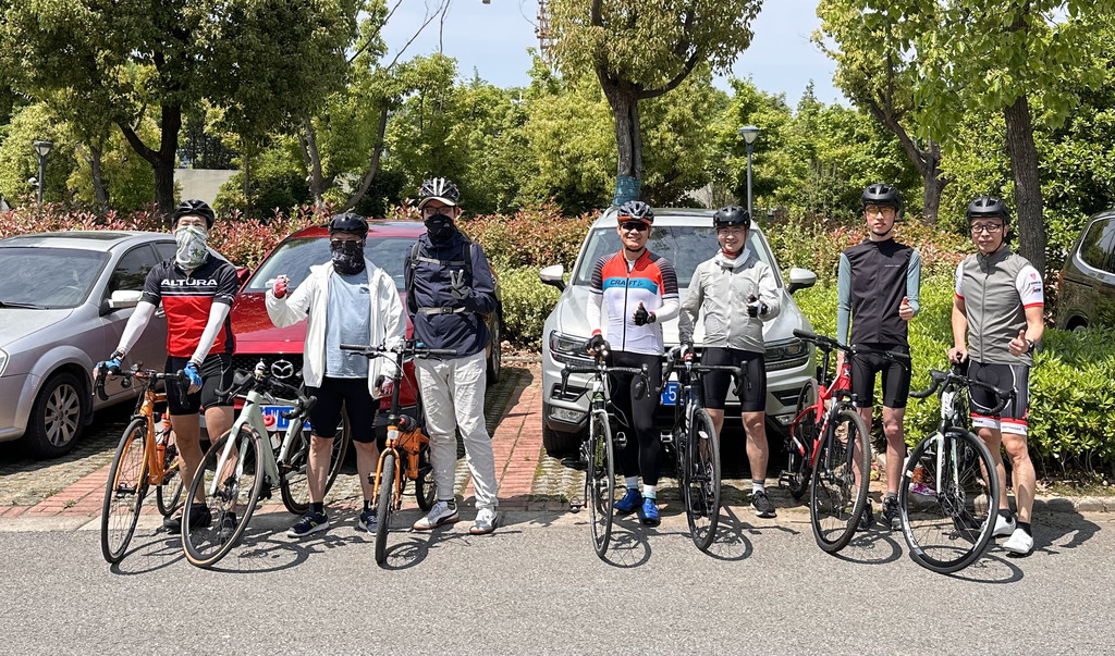 出发前一天的上海是中雨转小雨,一直在小雨中犹豫不决,但第二天天气突然放晴,而且温度还挺低,把自行车和骑行的东西收拾好,就出发了。五一假期的第一天就遇到堵车,不过堵车不堵心,三个半小时后终于到了集合点。出发前的合影照片是必须的。