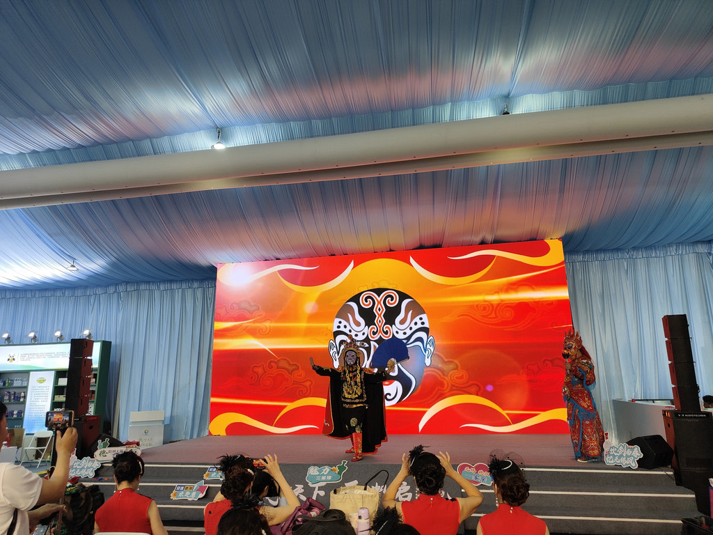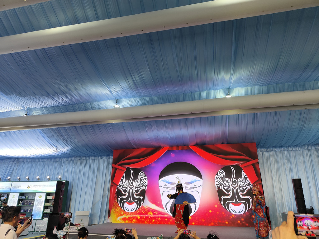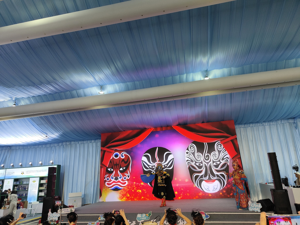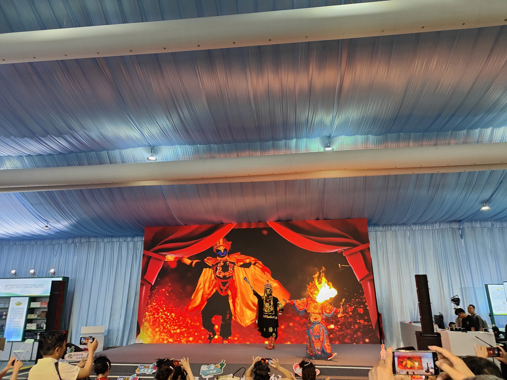 古镇居然还有展销会,“德行天下,阳光启航”,这是德阳城市品牌推广活动,展位还挺多,售卖一些德阳地区的特产。展厅中间还有个舞台,我们闲着也是闲着,倒是欣赏了一出川剧变脸的绝活。可惜我们到得晚了一点,刚刚进来的时候听到一点介绍三星堆的尾声。