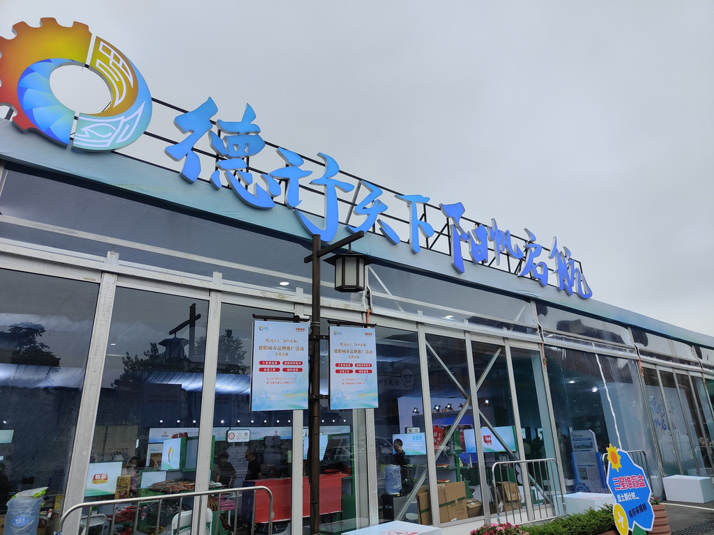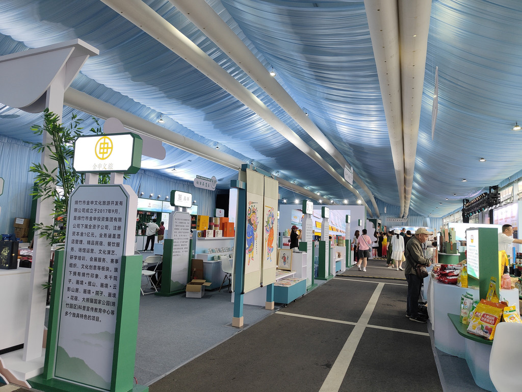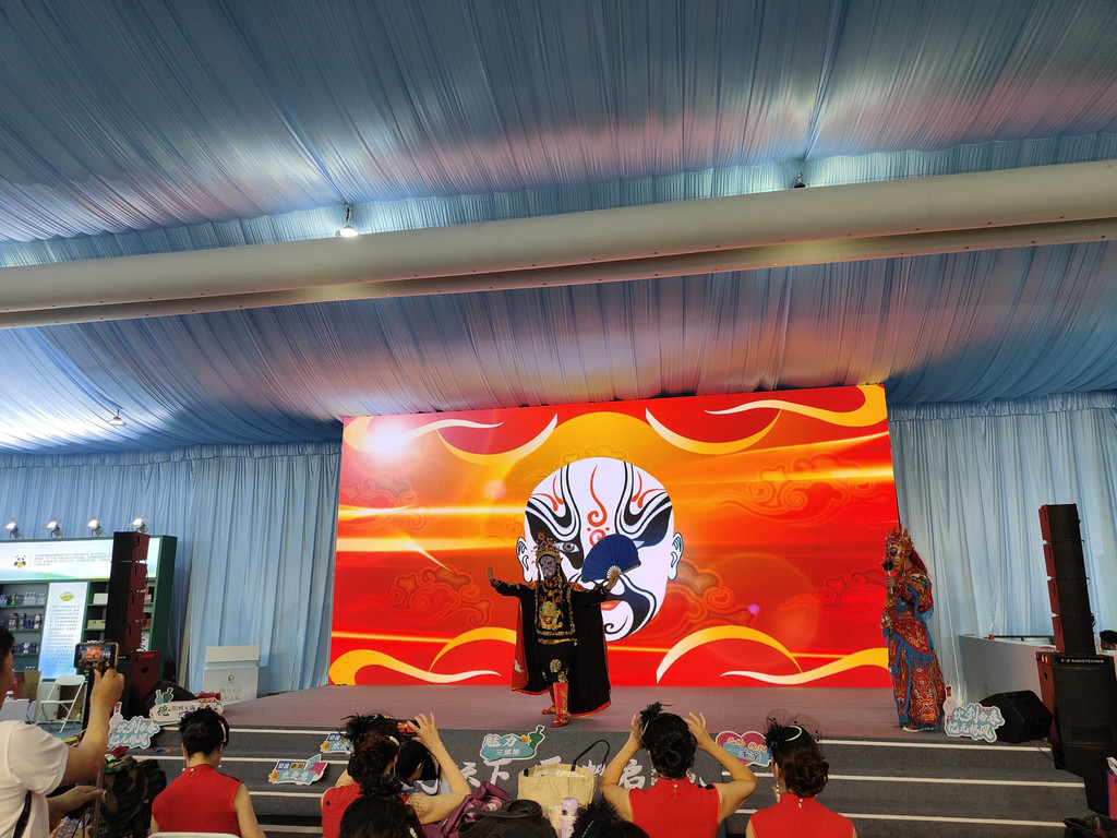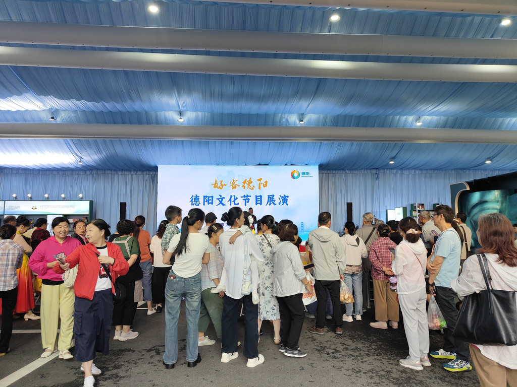 古镇居然还有展销会,“德行天下,阳光启航”,这是德阳城市品牌推广活动,展位还挺多,售卖一些德阳地区的特产。展厅中间还有个舞台,我们闲着也是闲着,倒是欣赏了一出川剧变脸的绝活。可惜我们到得晚了一点,刚刚进来的时候听到一点介绍三星堆的尾声。