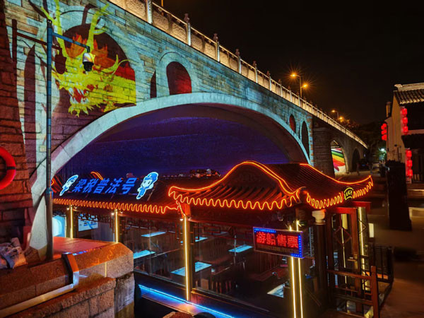 当晚来此,漫步不久就看到了“运河古邑”牌坊。只见霓虹灯闪烁下,牌坊飞檐翘角,古色古香,周边一串串红灯笼高高挂起,仿佛在诉说着这里的千年故事。穿过牌坊,就进入了南长街。街道两旁店铺林立,各种美食的香气扑鼻而来。而食街上还不乏科技元素,其中的一个无人值守的“AI智饮能量站”就位于商街中,很是显眼。