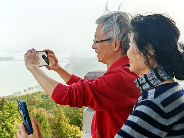 此行二游鼋头渚风景区,我们坐着景区的观光环保车,首先前往鼋头渚风景区中的著名景点:鹿顶山一游。一路上穿林越径,阳光透过树叶的缝隙洒在身上,虽说已是晚秋时节,但也多少带来几丝暖意。