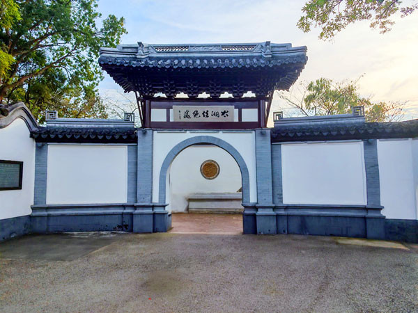 从太湖仙岛返回,登岸后信步沿湖右行来到“太湖佳绝处”牌楼前。进去不远就是藕花深处的景区。景区建于1931年,得名于女词人李清照的“兴尽晚回舟,误入藕花深处”句。在大片湖水的辉映下,蜿蜒小溪,曲桥清流,别有情趣。前有方亭,位于荷花丛中,因而亭上悬“藕花深处”匾额。