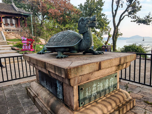 最后来到鼋头渚巨石处,这里是纵观太湖山水组合的最佳处。一脉青峰,从充山逶迤而下,伸入太湖洪涛之中。那块被神化了的渚头巨石,三面湖水拥抱,冲波兀立,显示出一只栩栩如生的神鼋,昂首于碧水之中,雄姿英发。