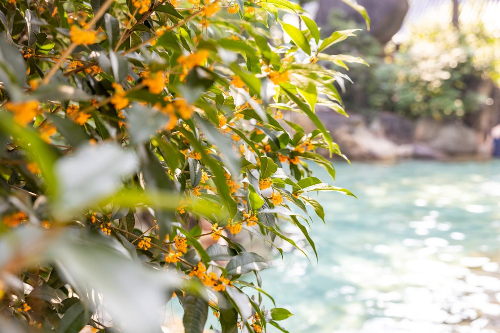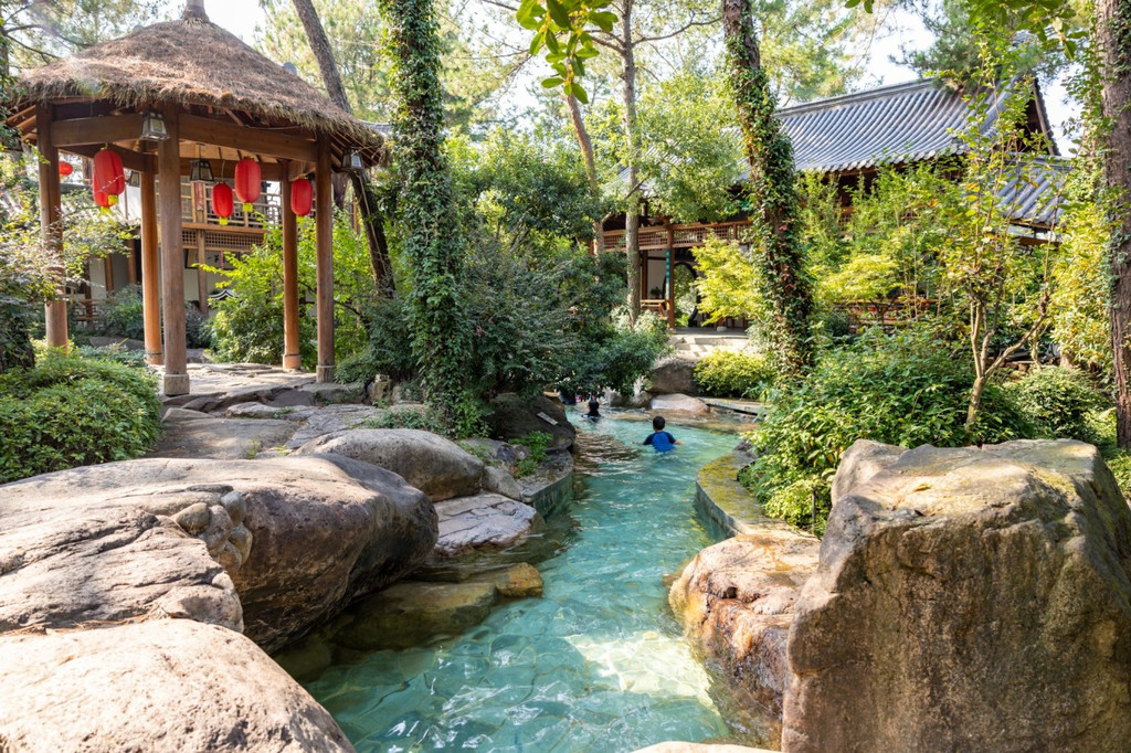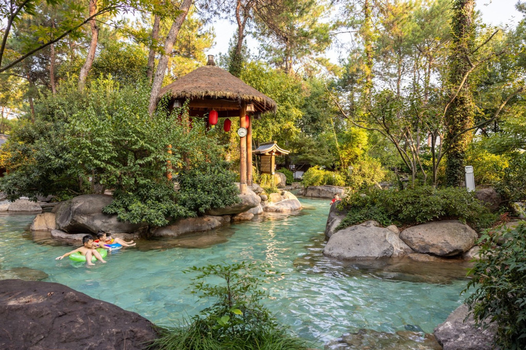 武义温泉好多选择,有牛头山梦温泉、璟园汤、极乐汤、唐风温泉、清水湾沁温泉......吃过饭后选了最近的唐风温泉,整个温泉是目前流行的盛唐风,唐代宫廷园林建筑风格,休息区搬来了大唐街市,泡池都在室外,掩映在郁郁葱葱的树林里,金桂飘香,午后的光纤影影绰绰洒在池子里,波光粼粼水花四溅,恍惚间像步入盛唐的诗句里。