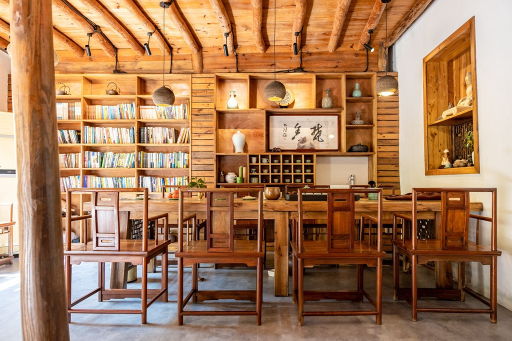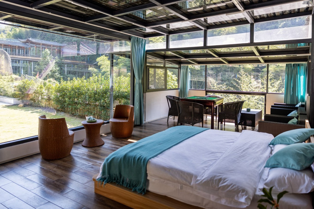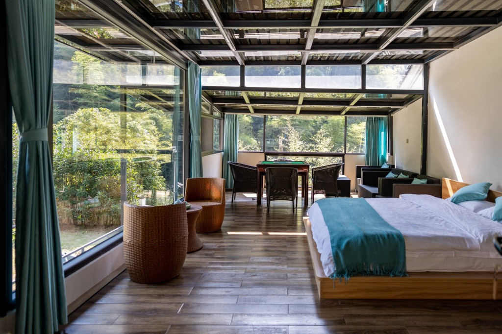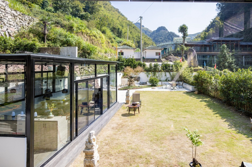 武义梵舍民宿座落于浙江省温泉名城武义中部的省级风景区寿仙谷景区内的一湾绿竹中,周边有山有水、山峰陡峭,梵舍只有4间房,分别是榻榻米房间和大床房,给房间去的名字也很贴合自然“见山”“枕水”“问茶”“听竹”,民宿一层的活动室左边是一间茶室,右边是酒吧和KTV,花园庭院非常适合朋友小聚、团建。