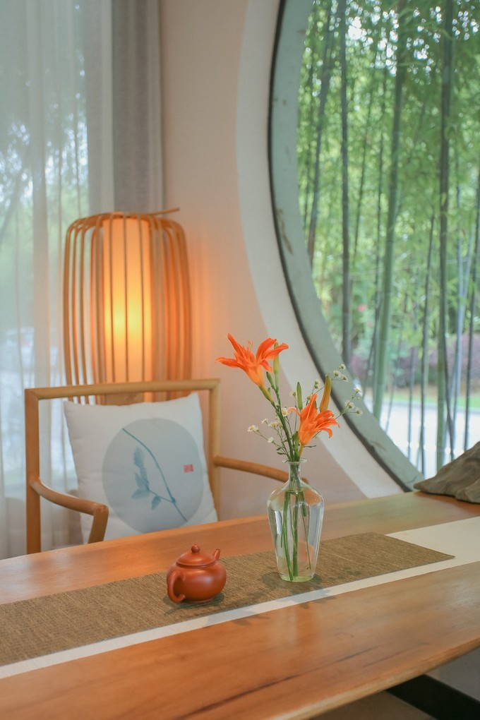 客房内采用实木家具,清浅的木色勾勒出整体空间的雅净氛围,硬朗的木质架构起空间主体轮廓和家具,经由精心的打磨,突出自然的木纹,给人一种柔美、简练之感。