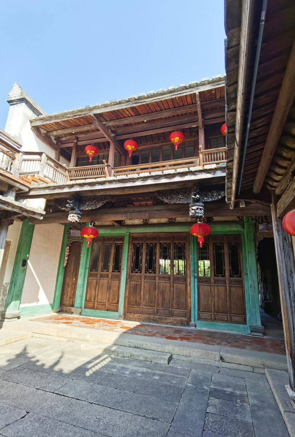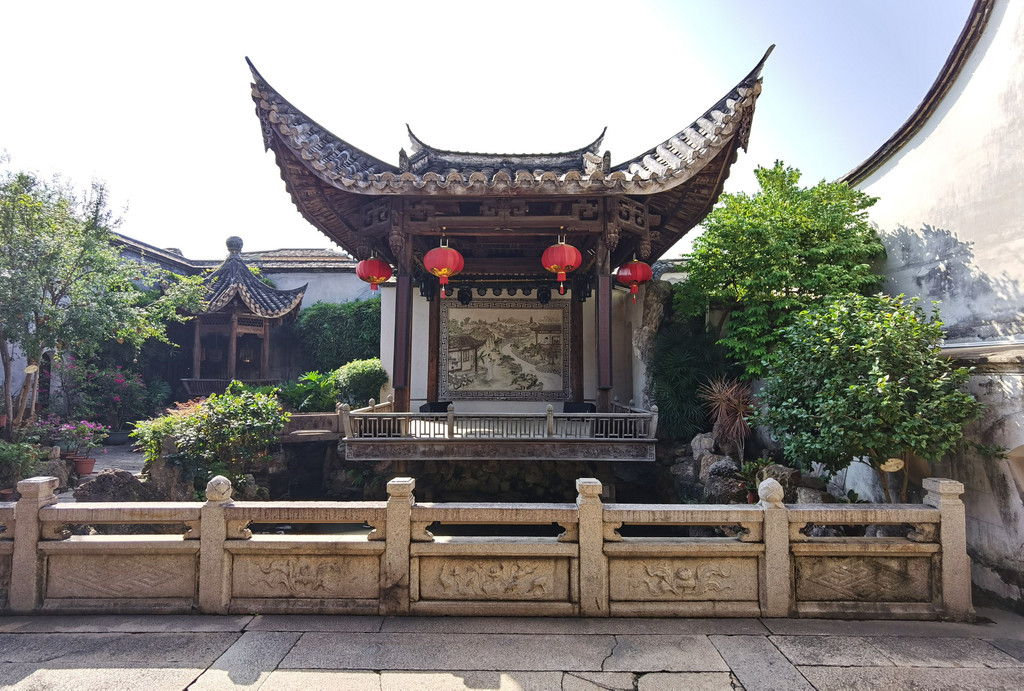 戏台,设计很精致,照片右手边有一走廊用于传递戏折子,左边的小亭子是乐队,戏台后面有隔墙用于换衣