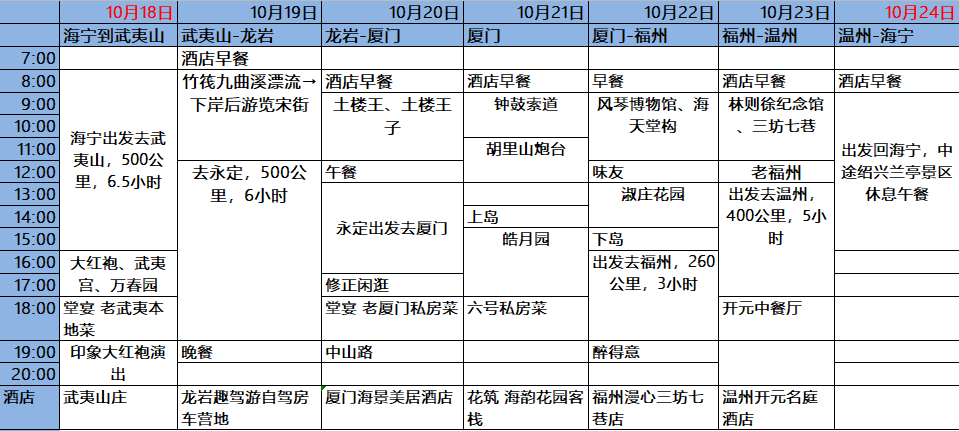 2020年上半年因为疫情影响,没有整体出行计划,近期疫情稳定,想趁着国庆的热度过后,错峰出游,目标福建,包括武夷山、厦门、福州,整体实际行程如下图