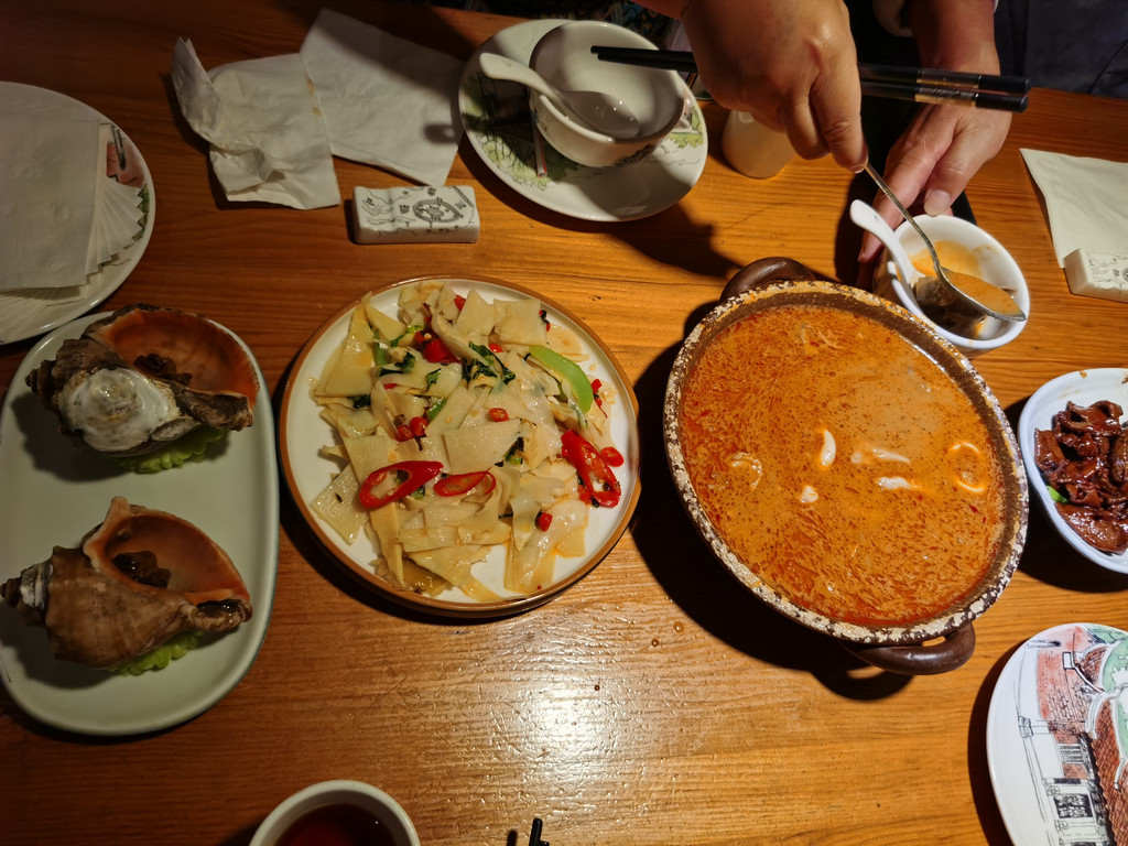 7点酒店早餐,然后7点半步行去武夷宫坐景区公交去竹筏码头,预约的是8点20的竹筏,一个竹筏8个人,8点多到了正好有三人组团;整体1小时40分钟左右;下了竹筏在宋街浏览了武夷山博物馆(里面主要有悬棺的介绍);11点多就出发去永定,一路上路况很好,车很少,同时服务区也都很冷清,没有吃饭的地方,晚上到达永定土楼外的自驾房车营地,在旁边的客家菜馆晚餐后散步去土楼,路程稍远,中途返回休息,帐篷隔音较差,外面溪水声音明显影响休息。