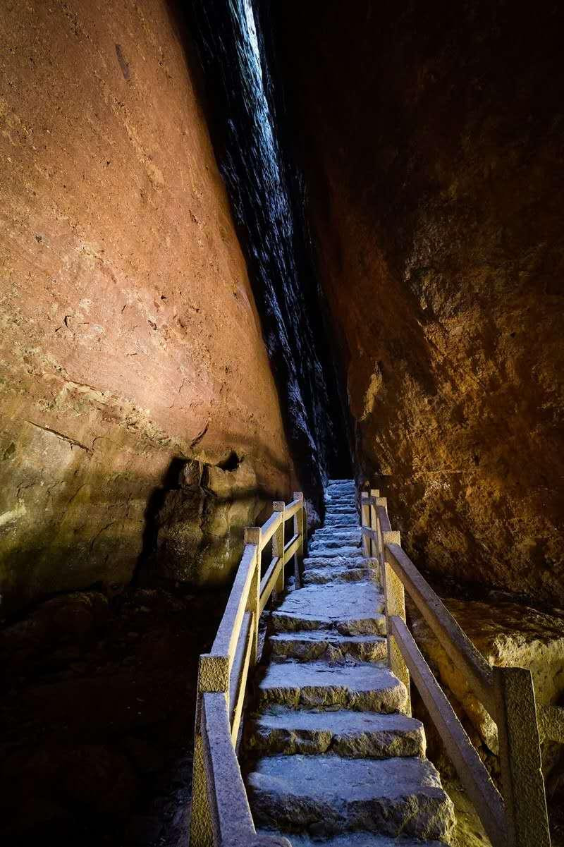 天游峰的楼梯普遍窄且高,有些地方甚至弯下腰降低重心爬,过来人的意见,真的走路不观景,观景不走路。