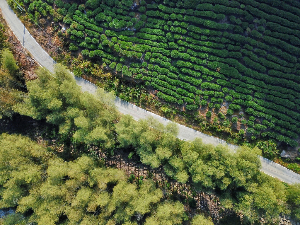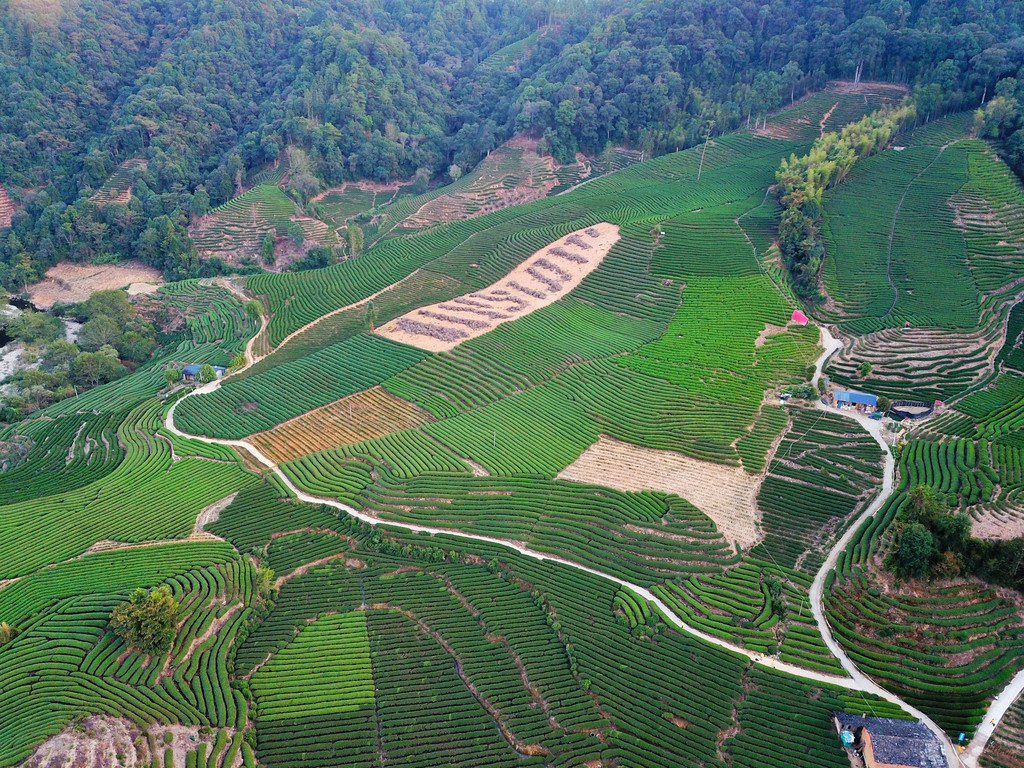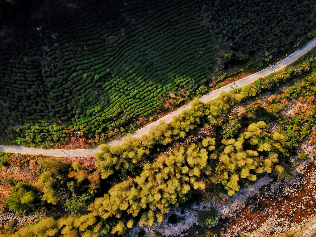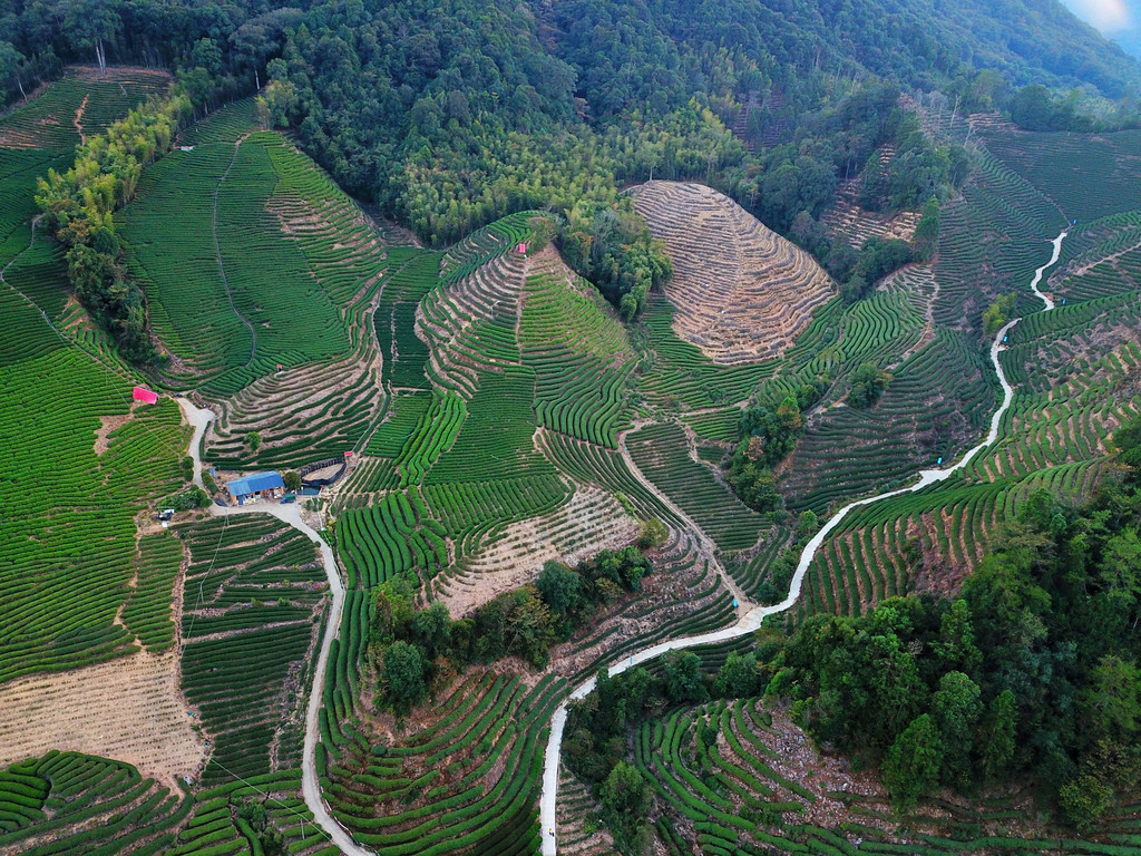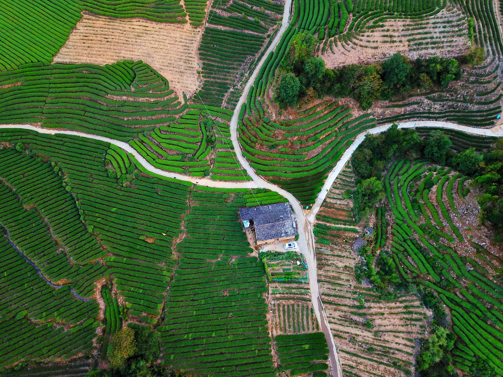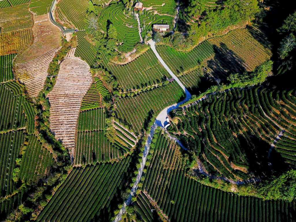 去到的第二个茶园是一处高山茶场,将无人机升上天空俯瞰,惊奇的发现,小路的交错竟然使得这里就像是一颗大茶树,这样的巧合,就如同给这个地方施了魔法,好茶不断!