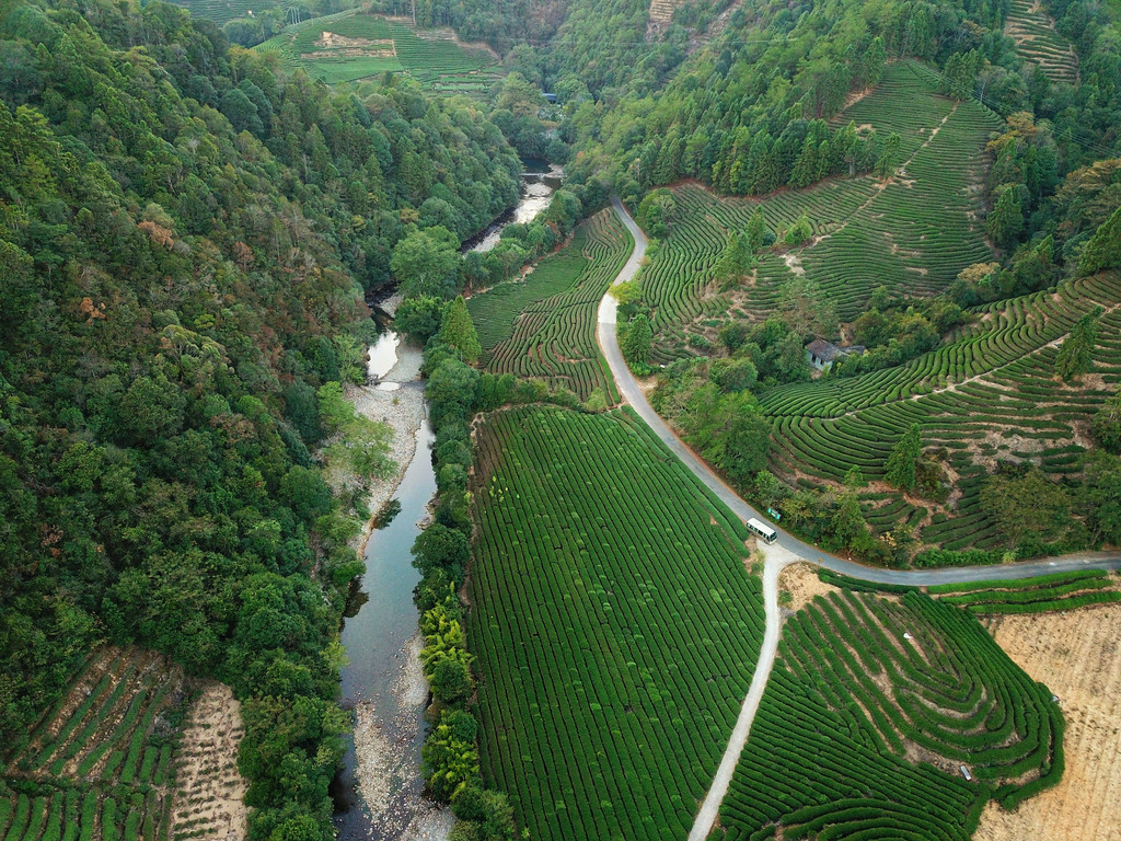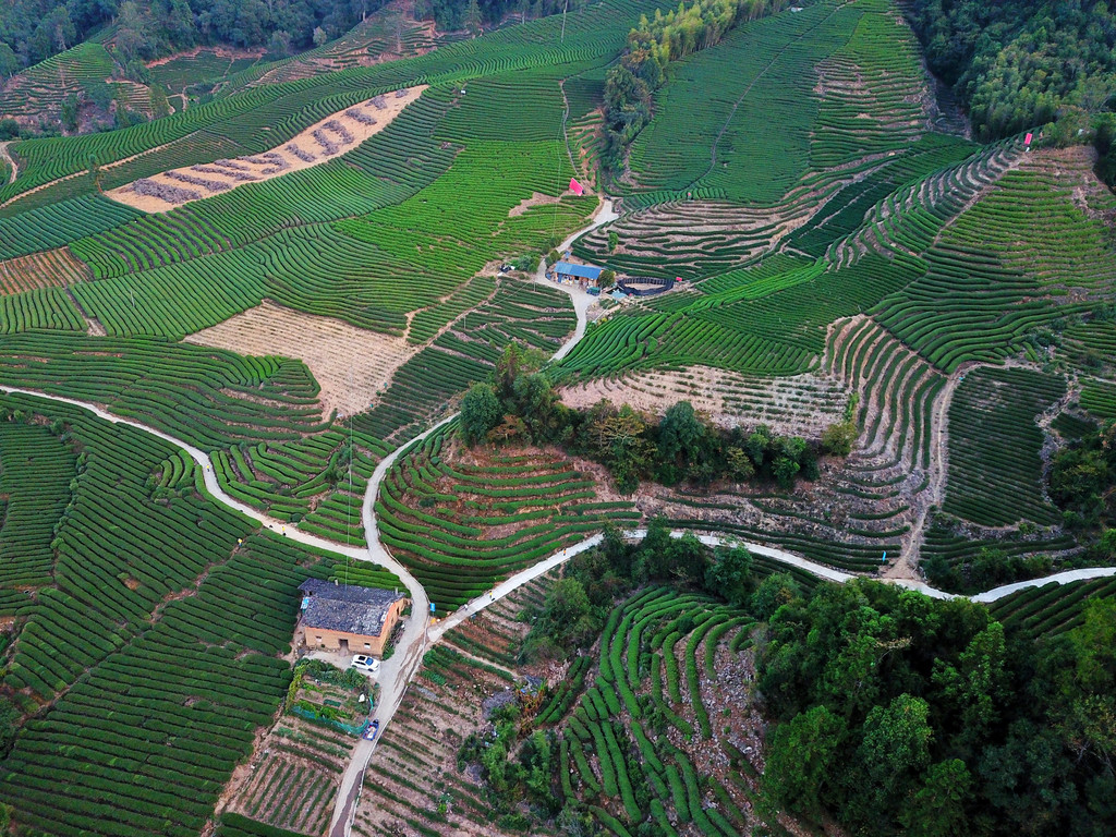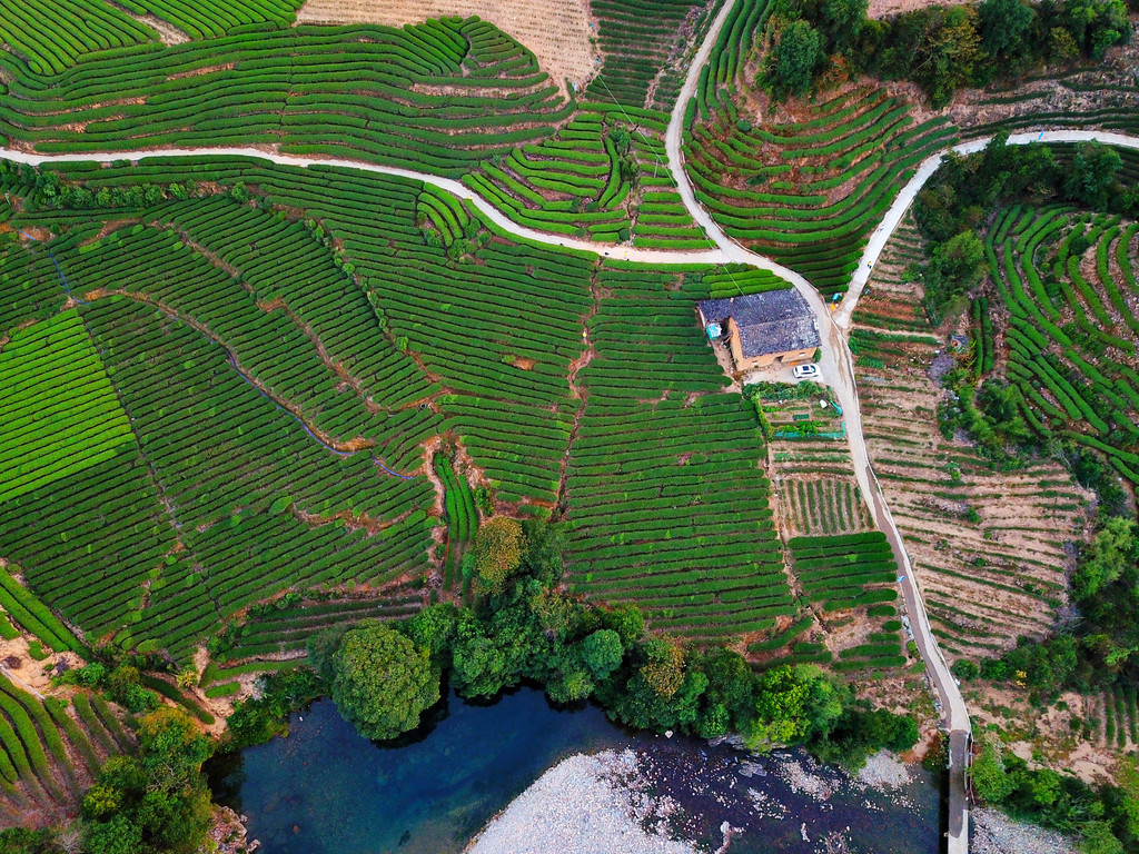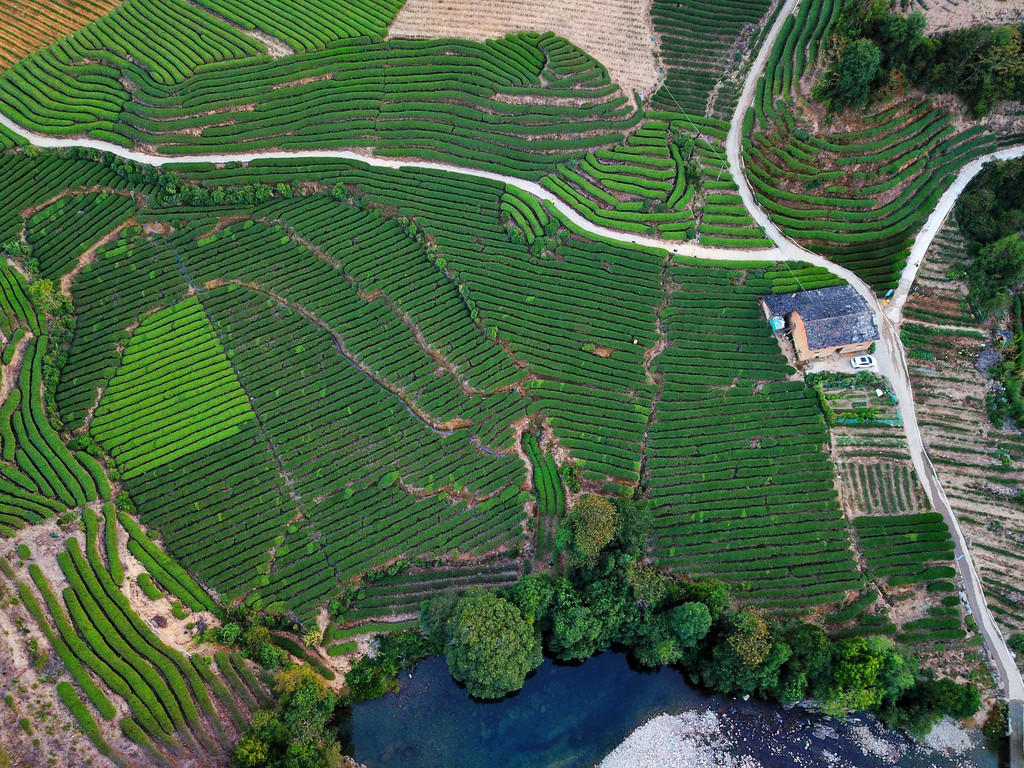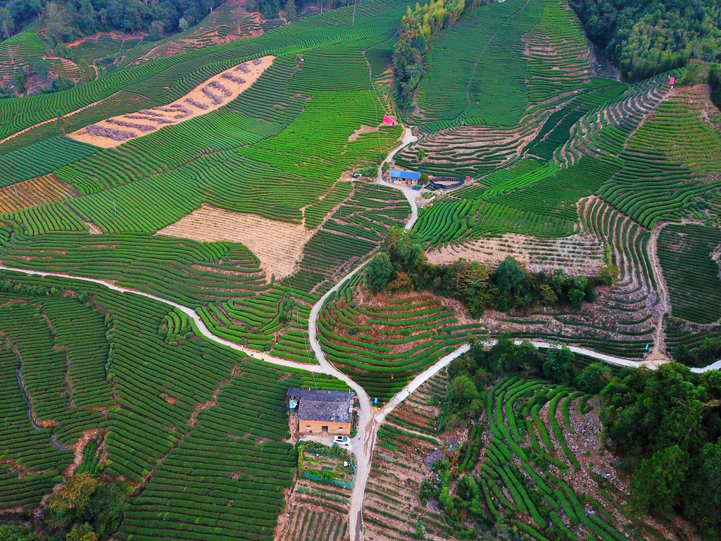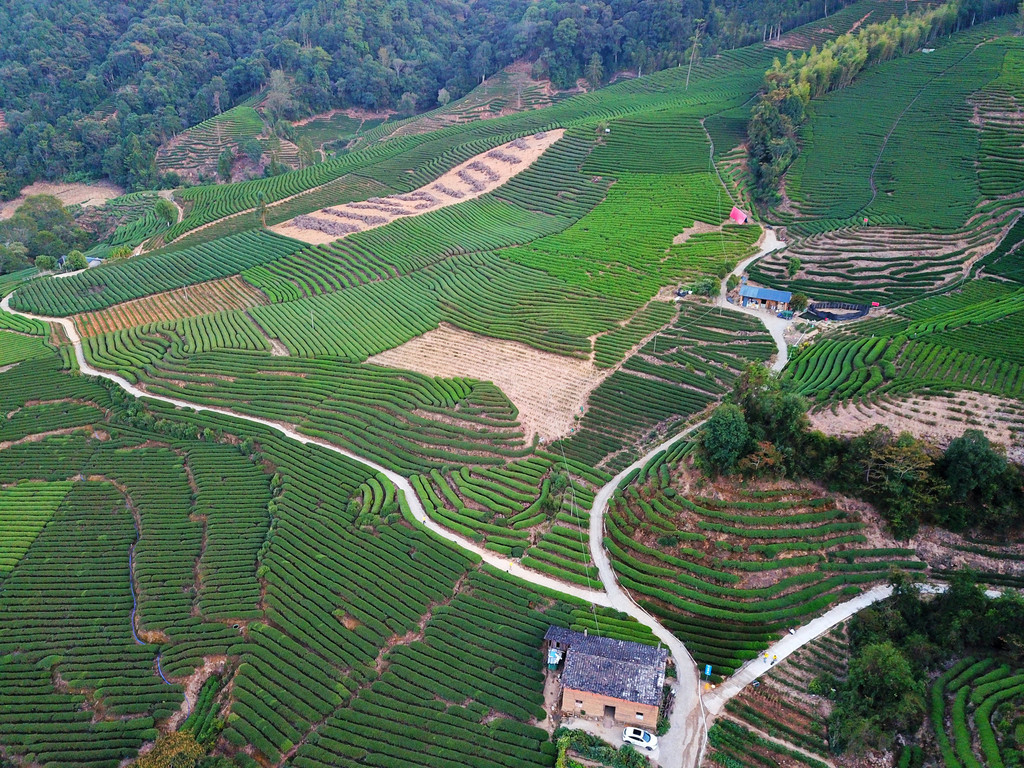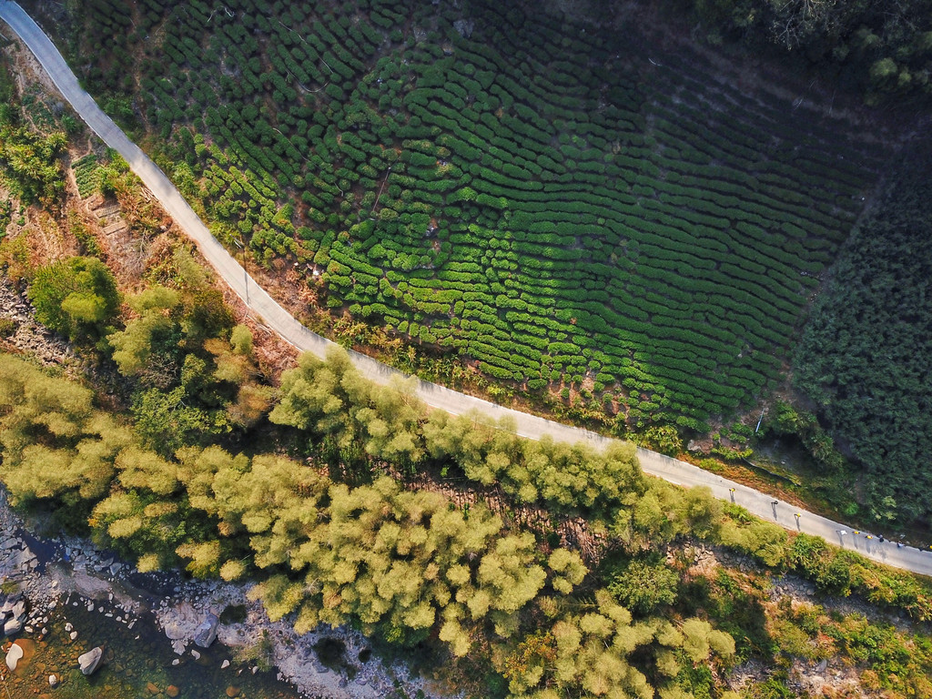 去到的第二个茶园是一处高山茶场,将无人机升上天空俯瞰,惊奇的发现,小路的交错竟然使得这里就像是一颗大茶树,这样的巧合,就如同给这个地方施了魔法,好茶不断!
