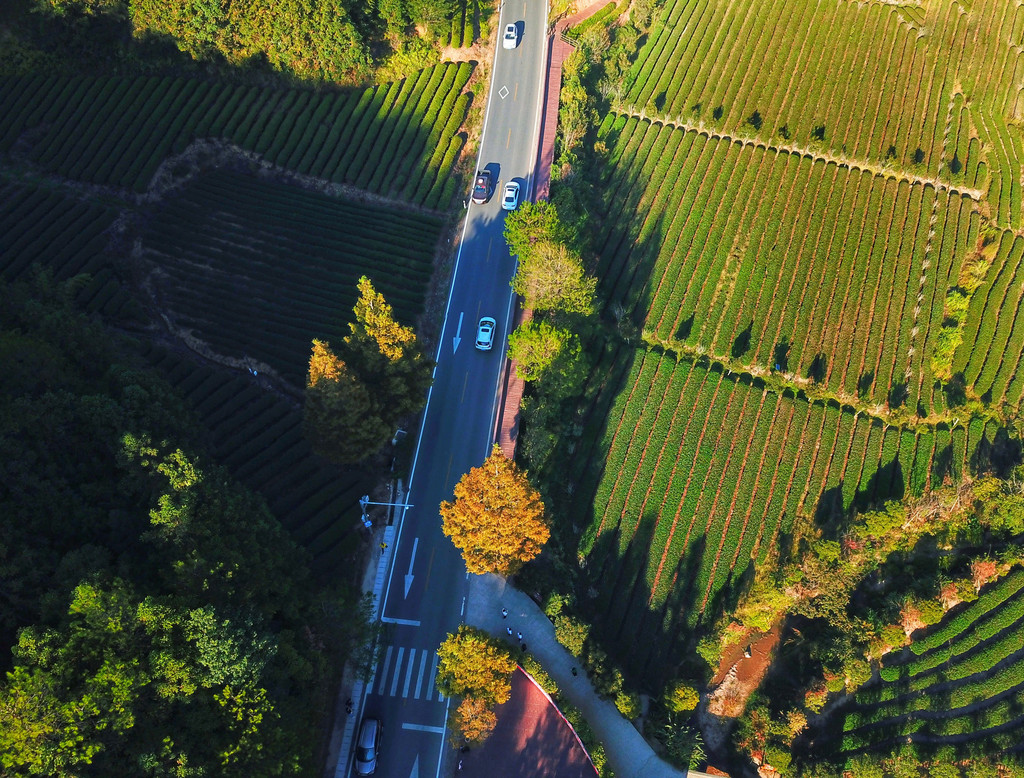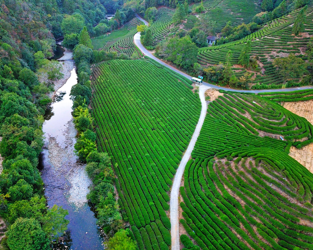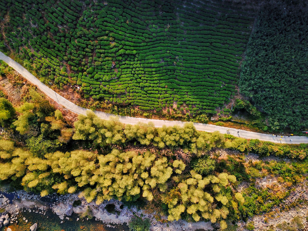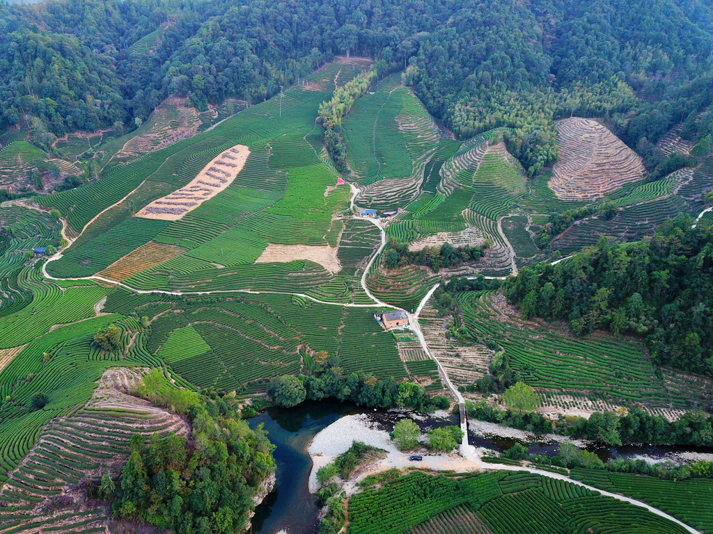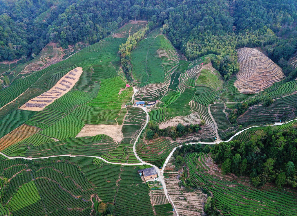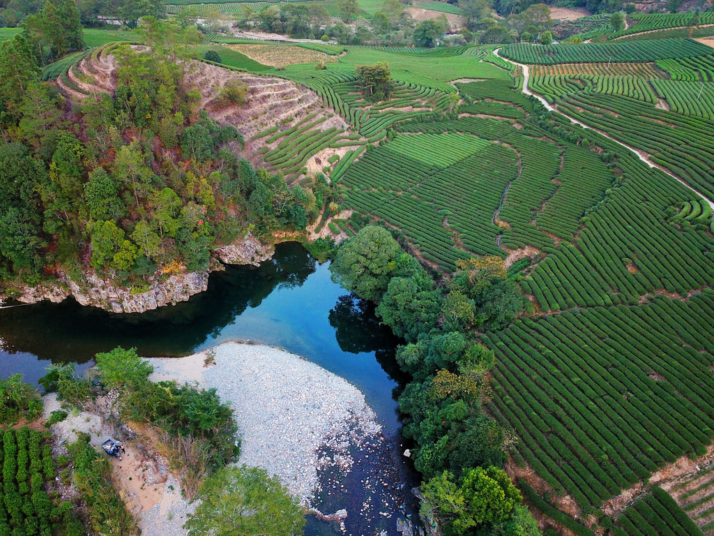去到的第二个茶园是一处高山茶场,将无人机升上天空俯瞰,惊奇的发现,小路的交错竟然使得这里就像是一颗大茶树,这样的巧合,就如同给这个地方施了魔法,好茶不断!