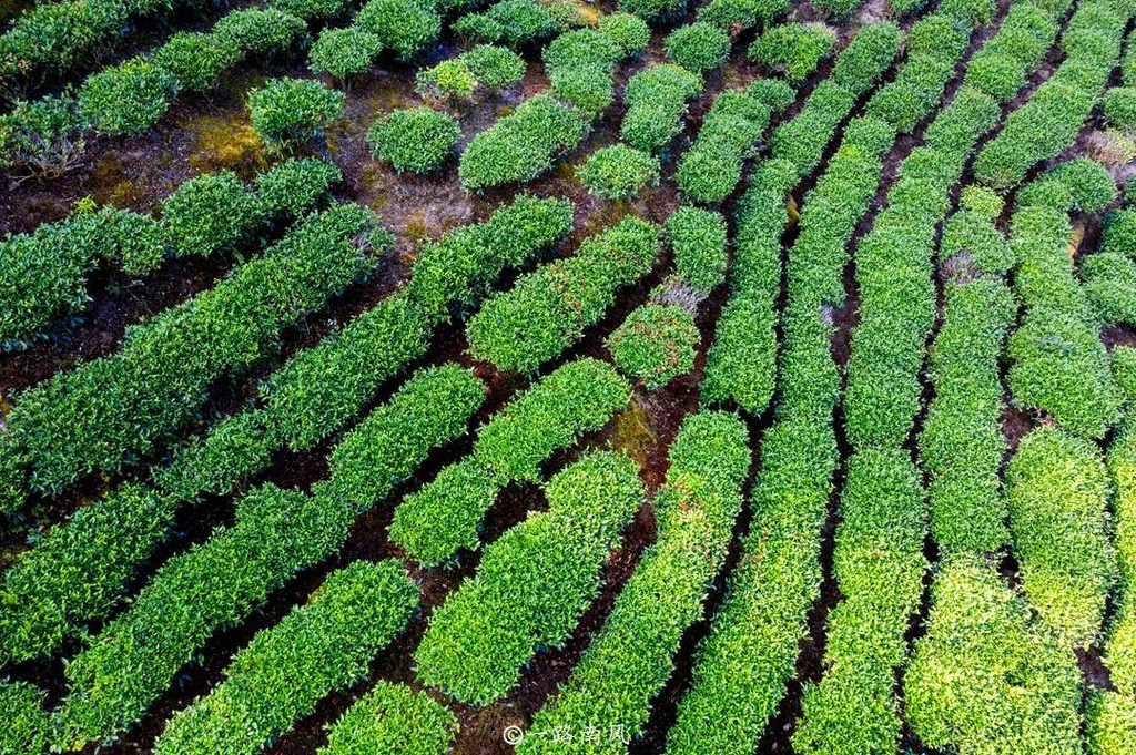 用无人机升空航拍,但见茶园沿着山坡层层叠叠分布,弯曲的小路就像爱丽丝梦游仙境的秘道。