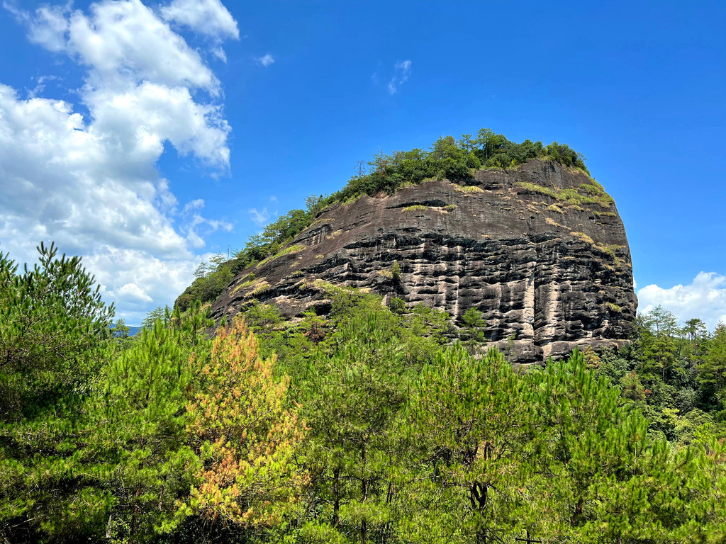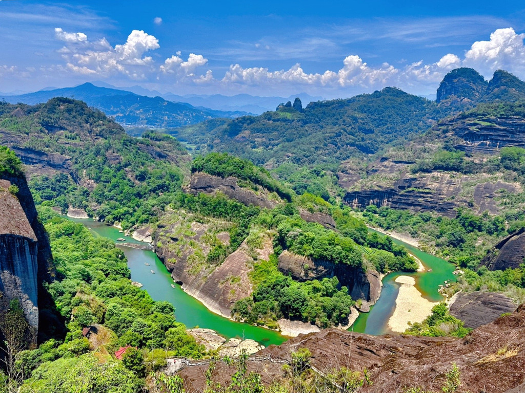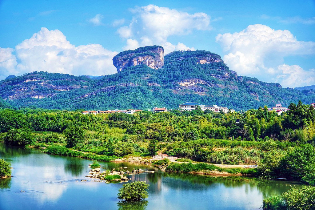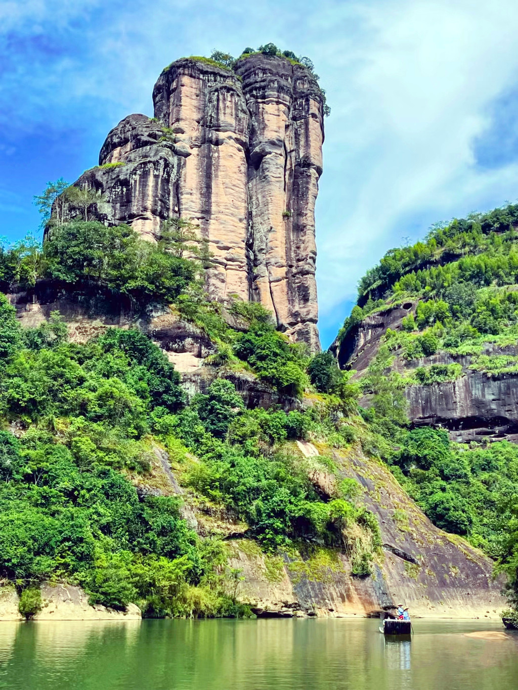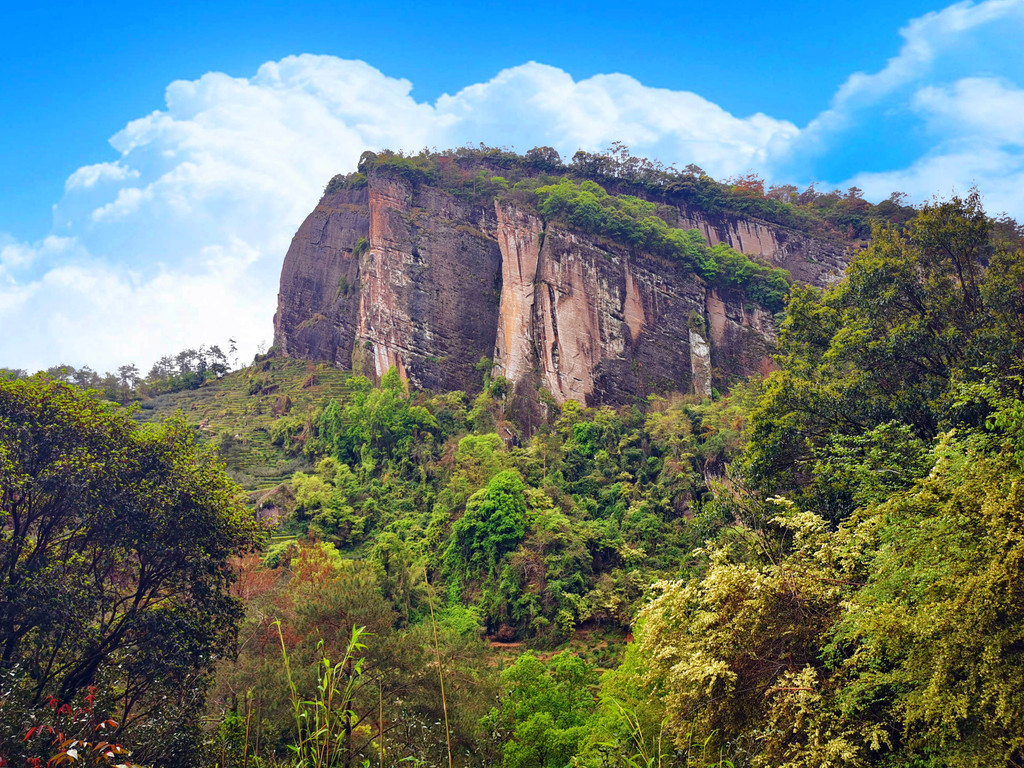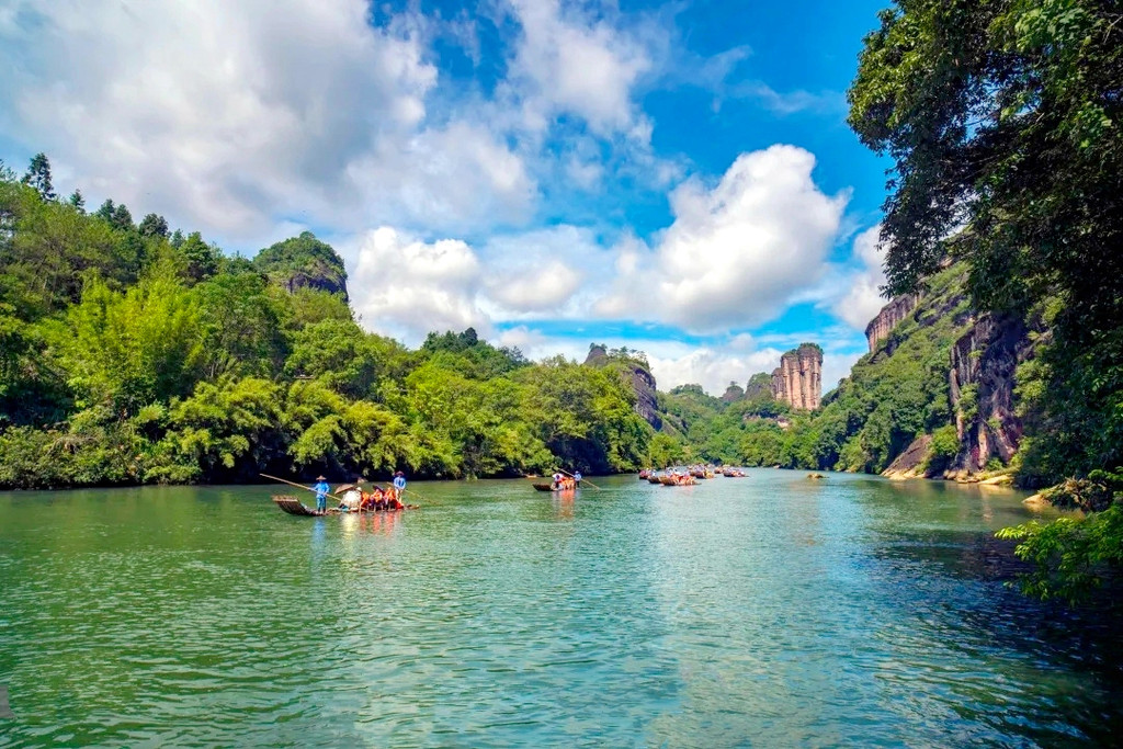 武夷山方圆70平方公里,巧布着"六六奇峰"、"七十二洞"、"九十九岩",每一峰、每一洞、每一岩,众多的清泉、飞瀑、山涧、溪流,将灵秀、奇诡、俏丽演绎得精彩纷呈,碧水丹山无时无处不透出隽秀神奇的魅力。大王峰宛如擎天巨柱,气势磅礴,因长的酷似人戴的纱帽,又被称为纱帽岩,是进入武夷山的第一峰,在武夷三十六峰中享有“仙壑王”之称;玉女峰位于九曲溪二曲溪南,玉女峰突兀挺拔数十丈,武夷山典型的柱状山之一,峰壁有两条垂直节理,将柱状体分成高度递增的三块削岩,玉女峰和大王峰隔溪相望,好似一对脉脉含情的情侣在诉说着她们凄美的爱情故事,天游峰独出群峰,山巅四周有诸名峰拱卫,三面有九曲溪环绕,武夷山全景尽收眼底,故有“武夷第一峰”之称,武夷之水精华在九曲溪,被誉为武夷山的灵魂,九曲溪澄碧清澈,曲曲弯弯,如玉带盘绕群峰,山回溪转,折复绕山,山溪相环结成“曲曲山回转,峰峰水抱流”的九曲之胜,船夫起杆,一叶竹筏画中游,两岸千峰尽收眼帘,翠岚倒影也尽显于碧波之中。
