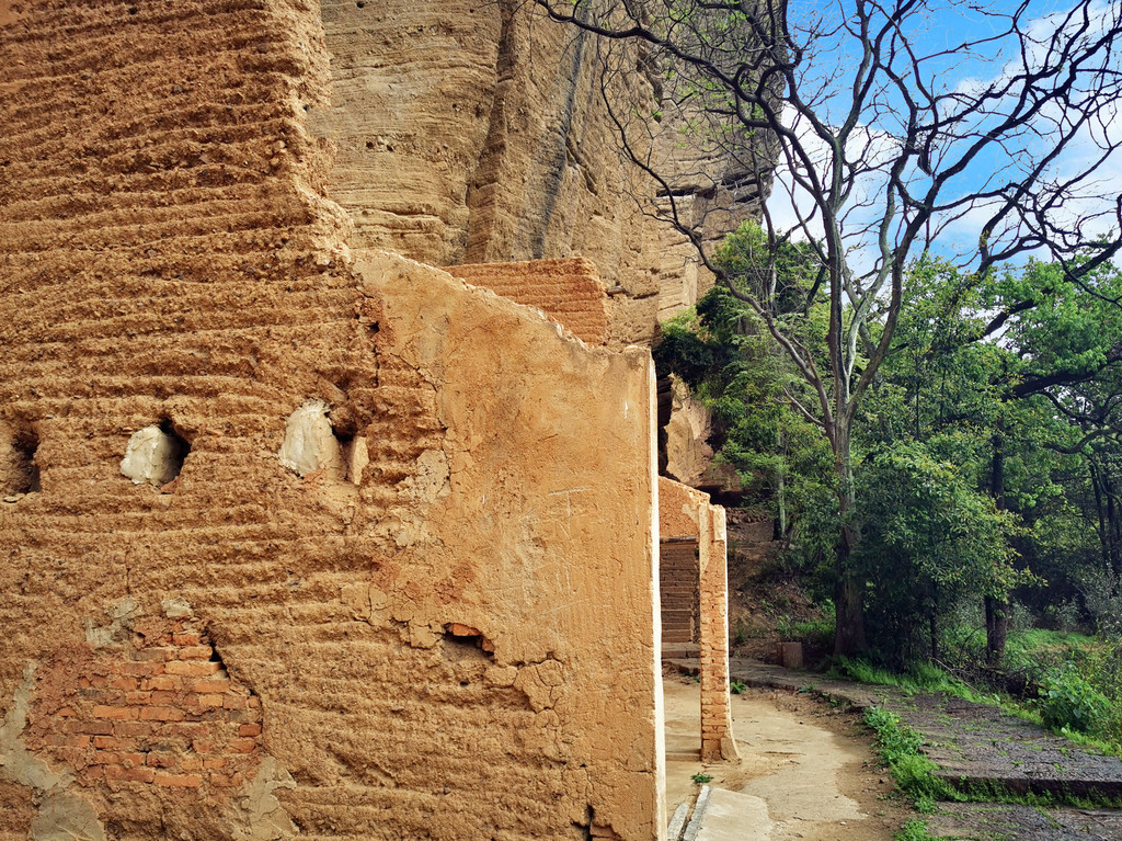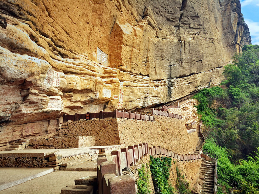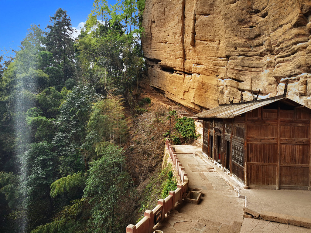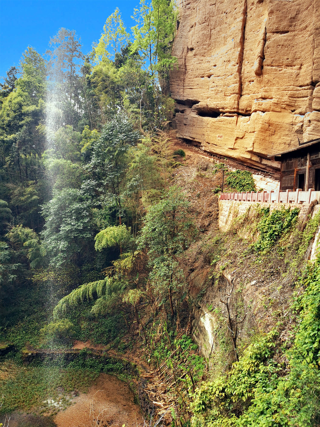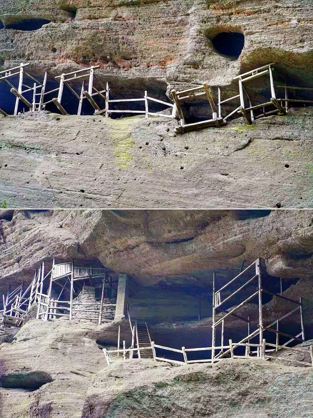 古崖居,抬头仰望间会发现眼前那高耸如刀切般的山崖上密密麻麻有许多神秘的悬空建筑,有点类似武夷山的山崖悬棺,史上曾有人穴居于此躲避太平军战乱,据专家考证,这些洞穴的洞口很窄,洞内面积却非常的大,可同时容纳三百多人居住,最先进入洞穴的人从山顶用绳索垂吊至洞内,然后在洞内搭起一些木结构装置,这些用整根木头搭建的木构架,一半嵌于崖体内,一半则悬于半空中,这种用古法榫卯连接的木结构,就是“天车架”,原理与现代的吊机一样,既可以运物也可以运人,可以说是最早的人力电梯。如今历尽风吹雨打,这些天车架依然牢固,透过洞口还能清晰可见洞内建筑,或临崖、或深藏,犹如燕巢附崖,体现了武夷山工匠的智慧与胆识。
