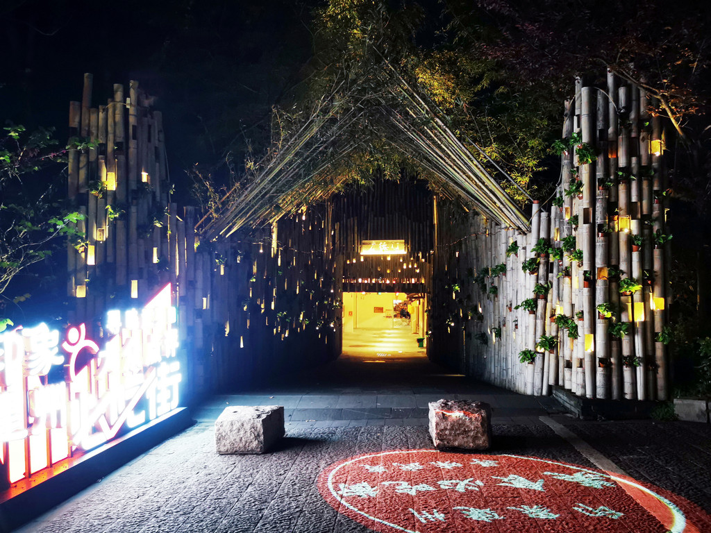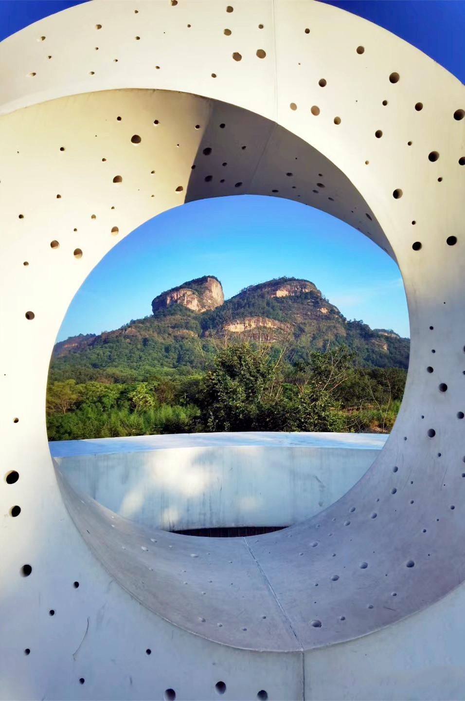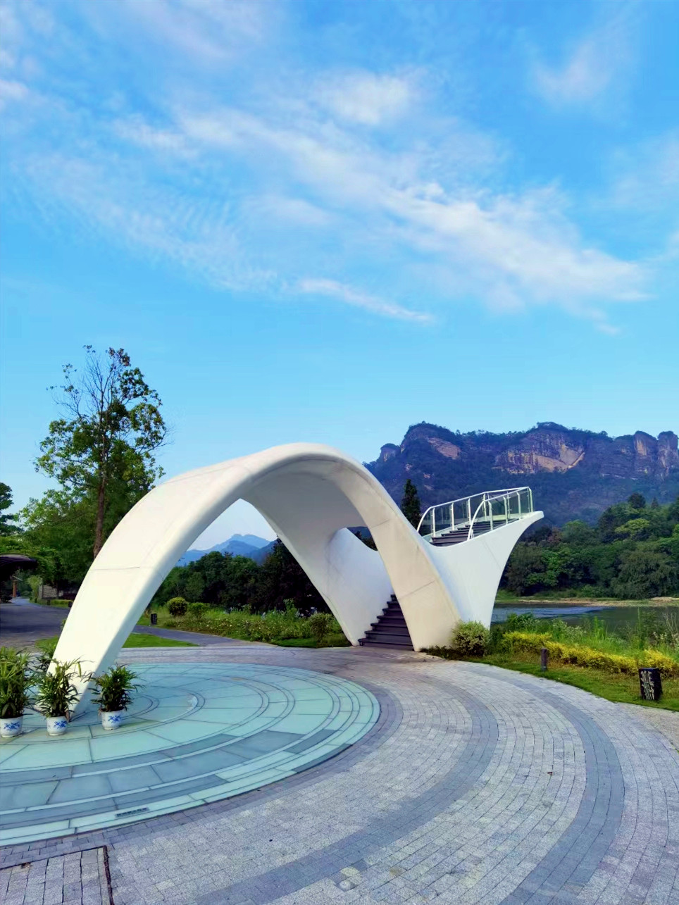 “九曲泛舟”设计灵感来源于九曲溪上造型轻盈优美的竹筏,在溪水之滨翠竹林处设计高低两座观景台,分别朝向三仰峰和崇阳溪,高可远望三仰峰,低可近探崇阳溪,旁边矗立着两根撑排杆,两侧还设有喷雾装置,营造了云雾缭绕的梦幻之感。