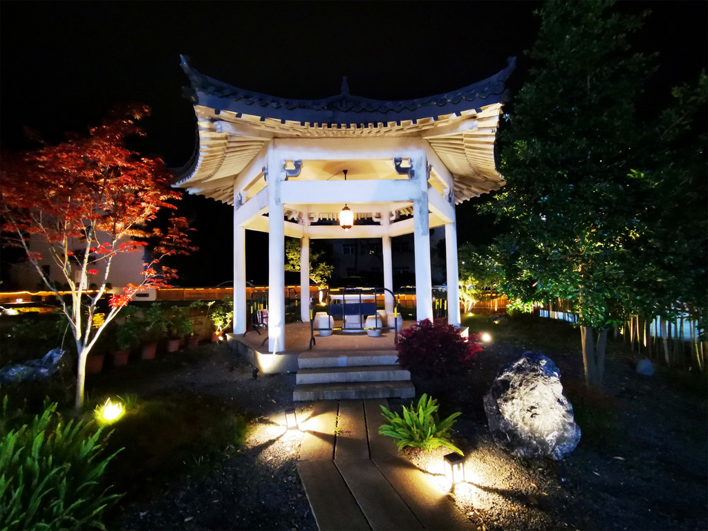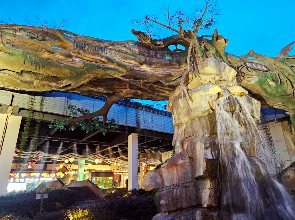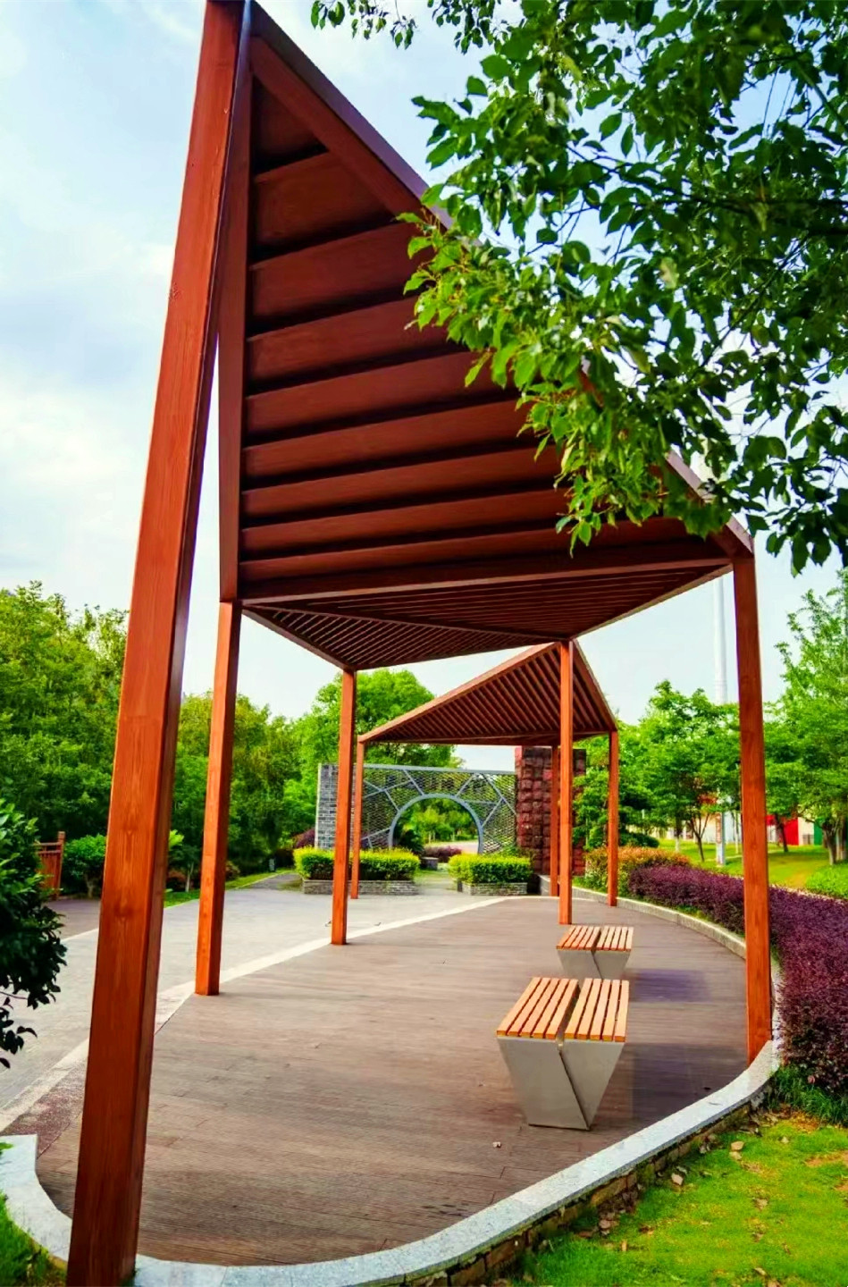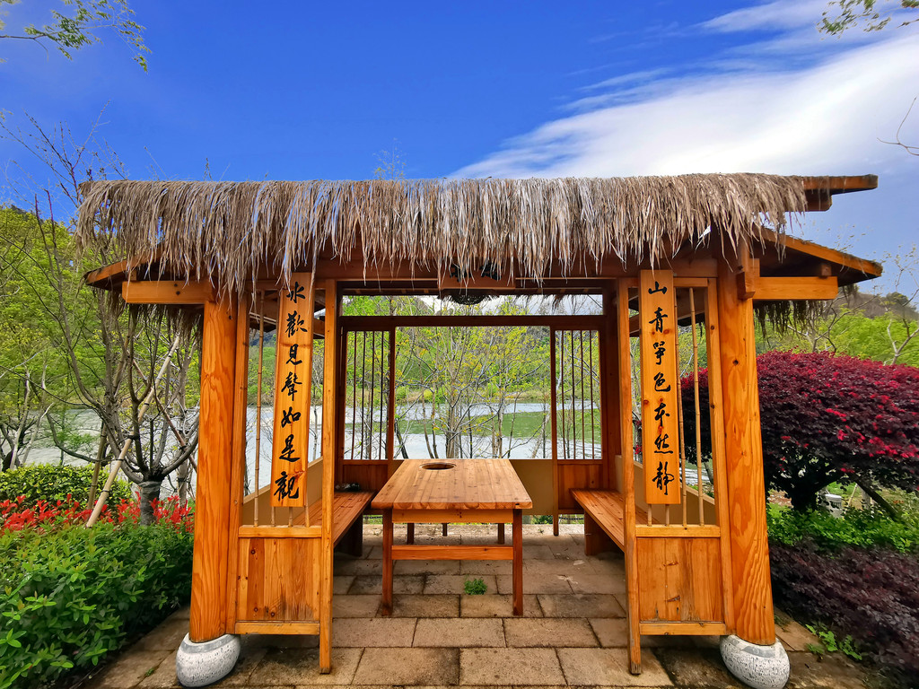 “九曲泛舟”设计灵感来源于九曲溪上造型轻盈优美的竹筏,在溪水之滨翠竹林处设计高低两座观景台,分别朝向三仰峰和崇阳溪,高可远望三仰峰,低可近探崇阳溪,旁边矗立着两根撑排杆,两侧还设有喷雾装置,营造了云雾缭绕的梦幻之感。