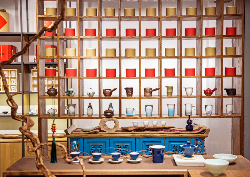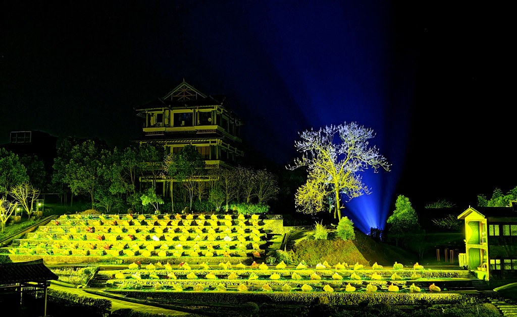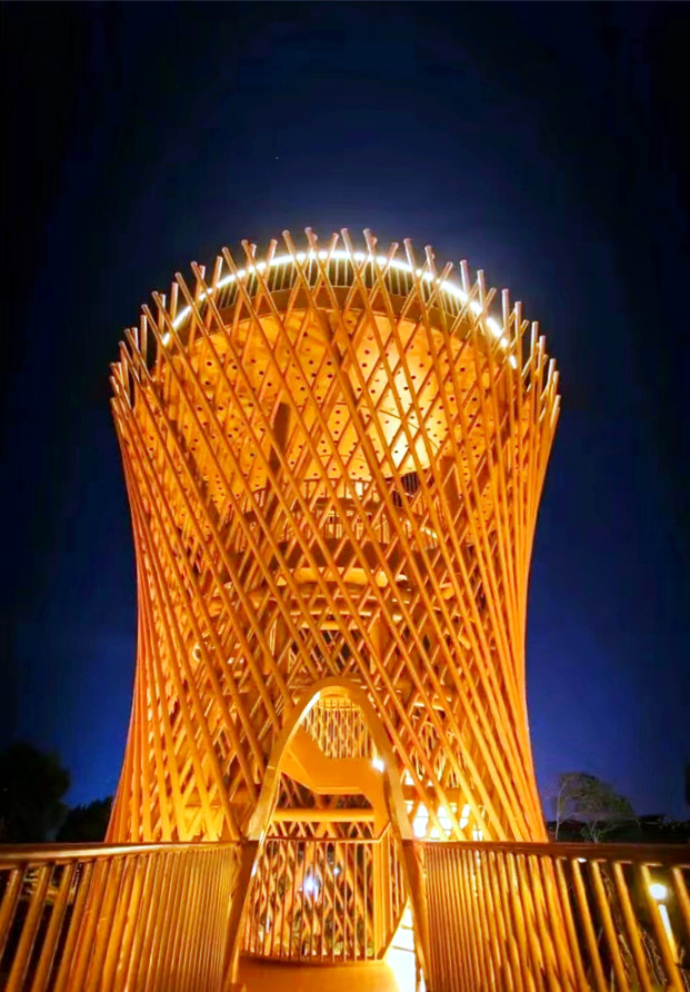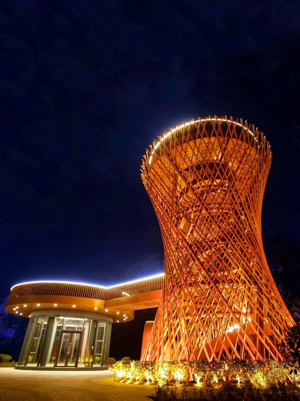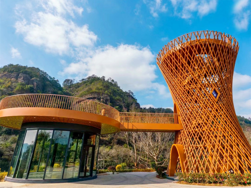 “福茶飘香” 以烘茶焙笼为原型,层层交织,同色系的旋梯,隐藏在焙笼之中,旁边通过连桥相接的延展平台,如同一个巨大平整的摇青匾,下方还有个透明的玻璃房茶室,如同水晶茶杯,玻璃立面透过树间光影,在阳光下熠熠生辉,夜间洁白的光圈在顶端点亮,如同袅袅茶烟从焙笼中升起,仿佛置身于缥缈仙境。