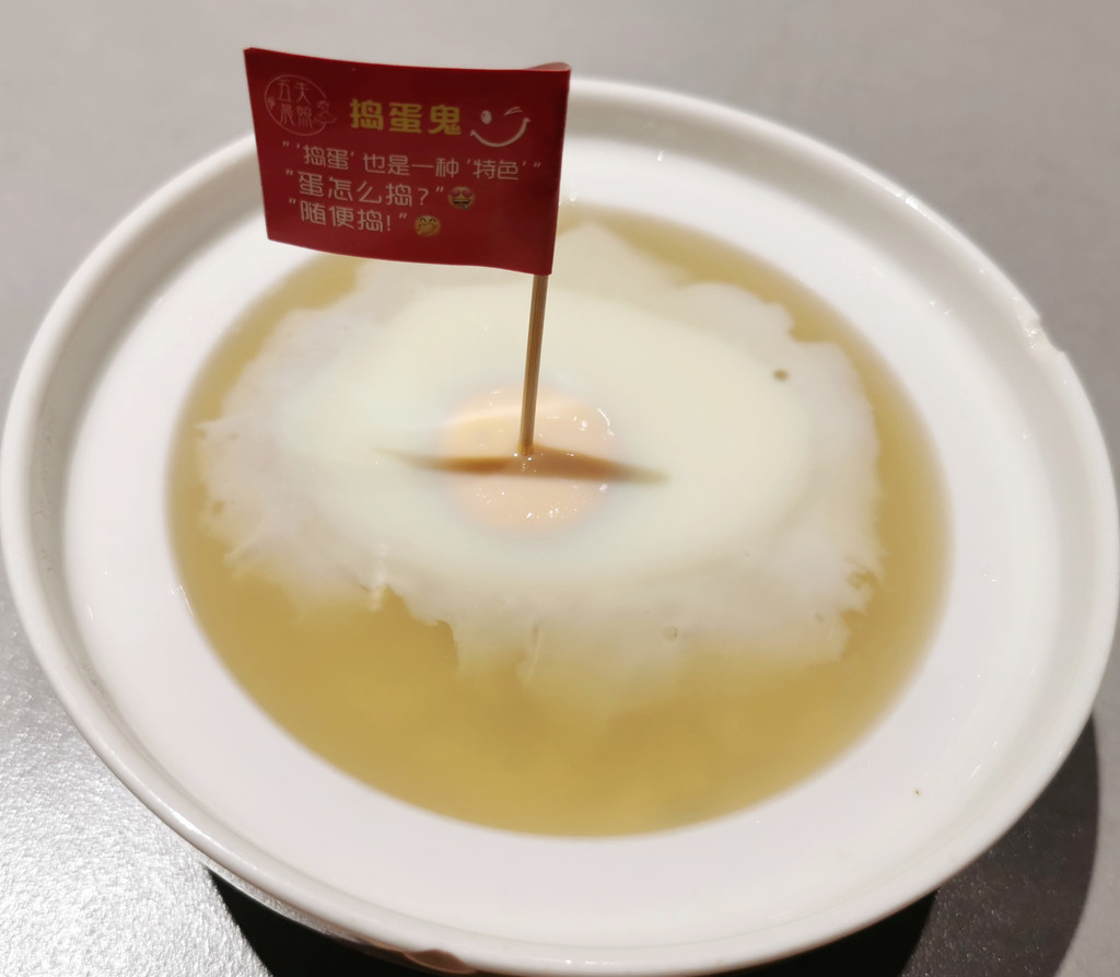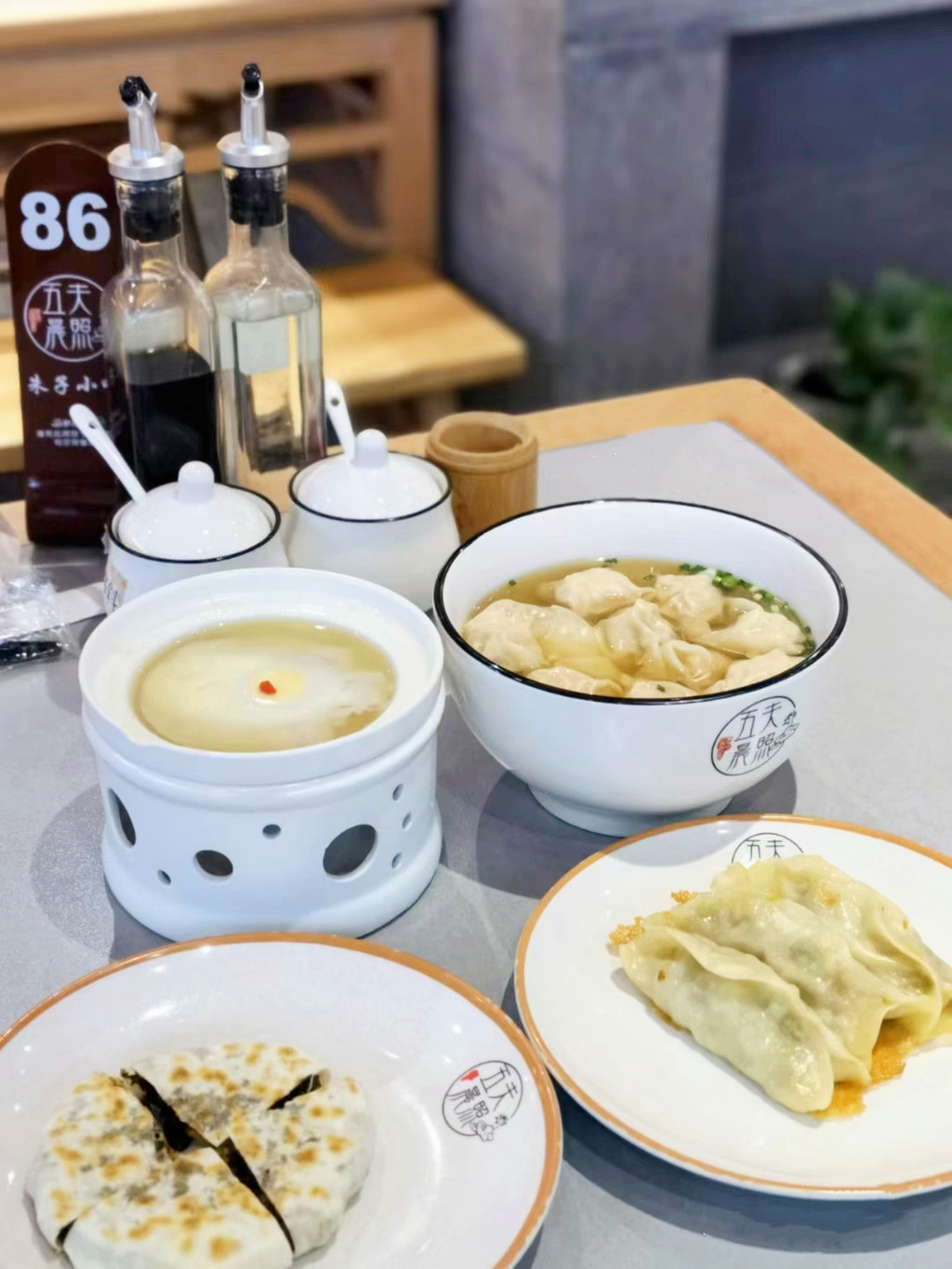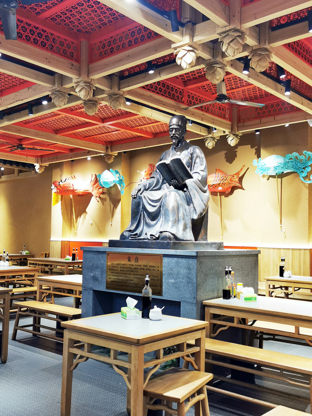 喝完茶却也不饿,辉哥开车把我们送到岚谷婆媳隔壁的五夫晨照朱子小吃,听说也是到武夷山必吃的店,莲子炖蛋得过金奖还上过央视,门头不大,但里面非常开阔,设计风格古色古香,正中间还有一尊朱熹的雕塑,和岚谷婆媳一样的自助取餐,五夫大扁肉个头圆滚滚,肉馅很饱满,莲子炖蛋上还插个有趣的小红旗,名曰”捣蛋鬼“,说是要把鸡蛋捣碎和莲子一起吃味道很惊艳,梅干菜饼和煎饺并非现煎出锅有点干硬,儿时猪油拌粉油香味很浓。
