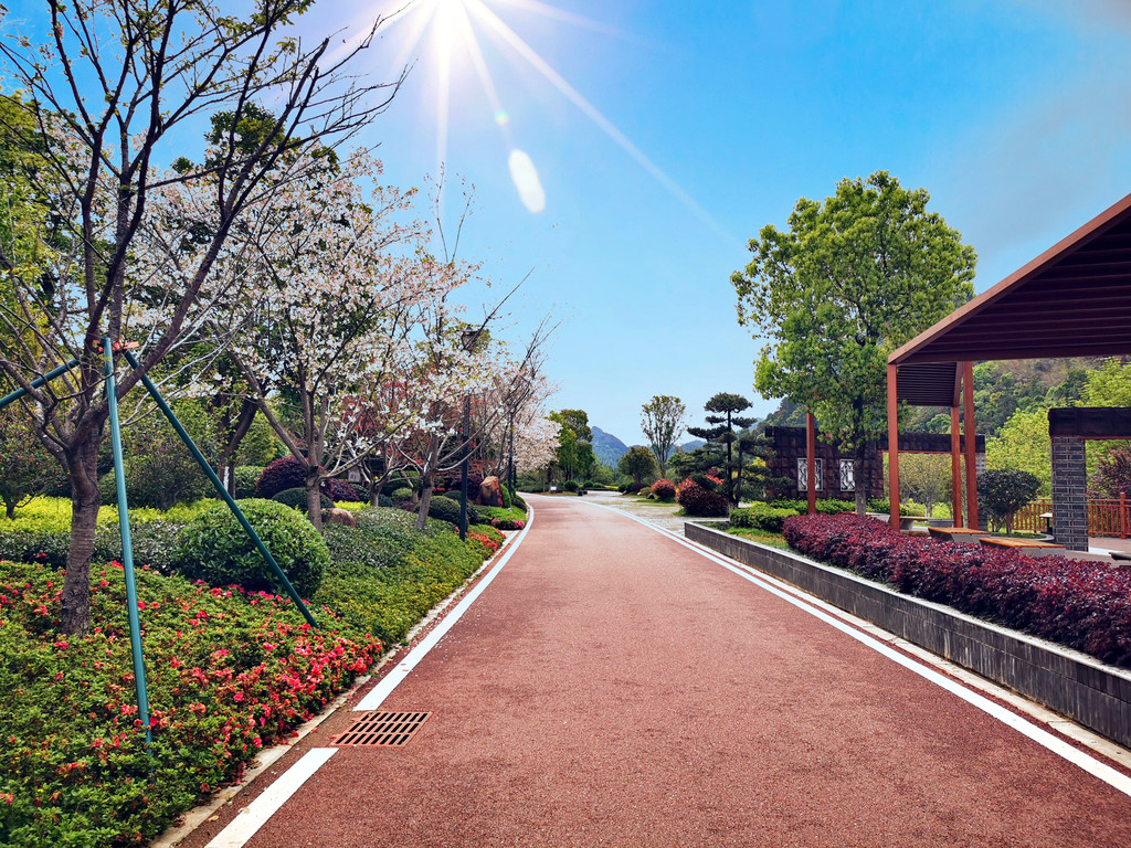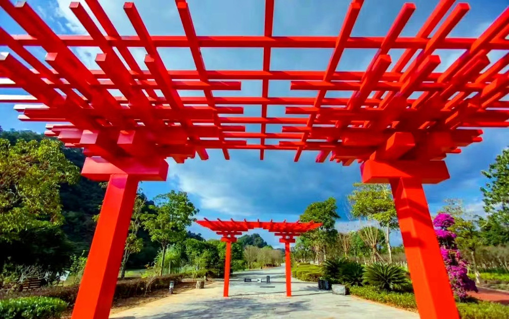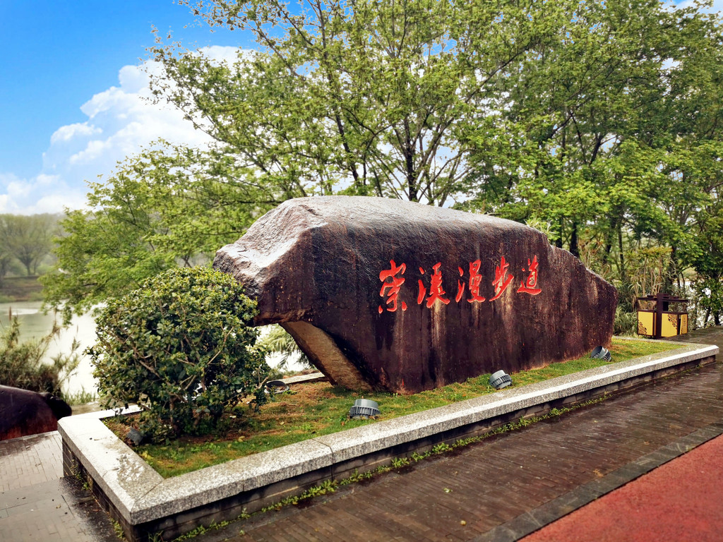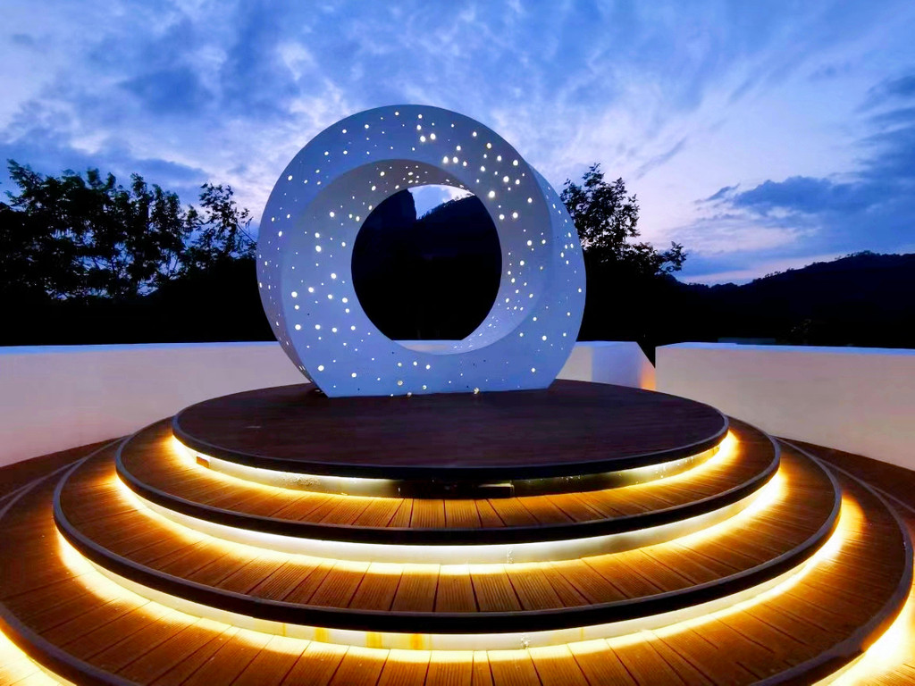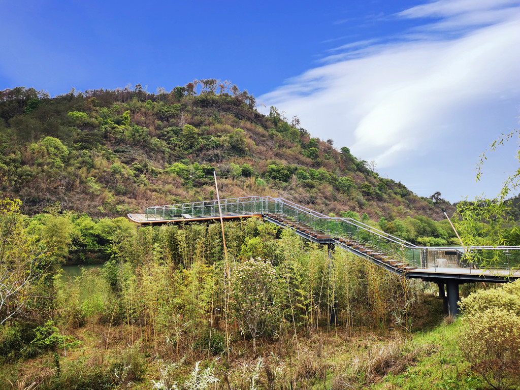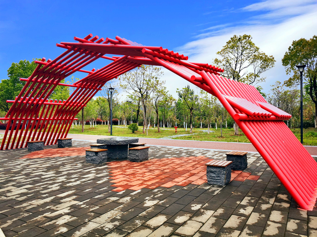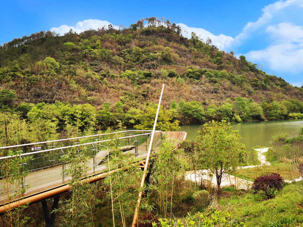 “玉潭白鹇”以国家二级保护动物珍稀鸟类白鹇为创作灵感,一端为尾,一端为首,端尾处于花坛之中,仿佛是从其中涌出的一股白泉,端首立在空中,人被托举至半空,仿佛坐在白鹇上,用它的视角欣赏着崇阳溪。