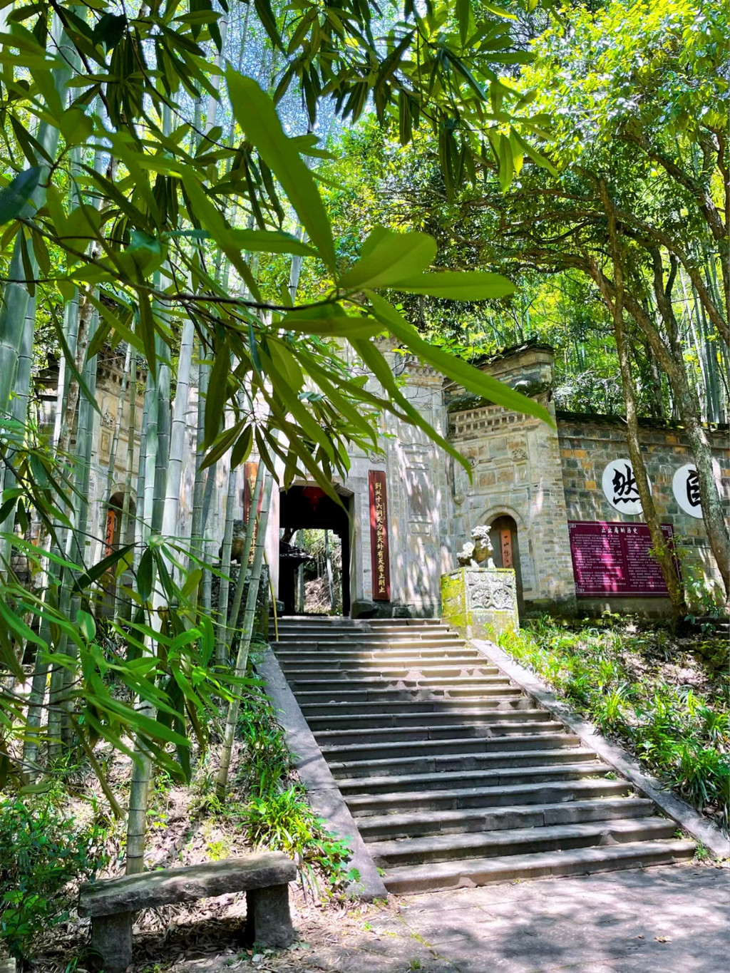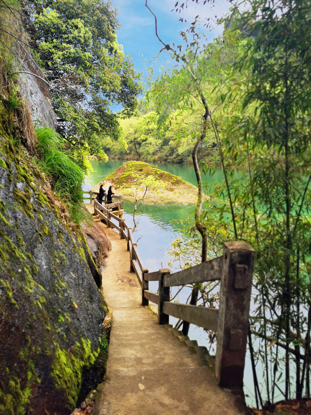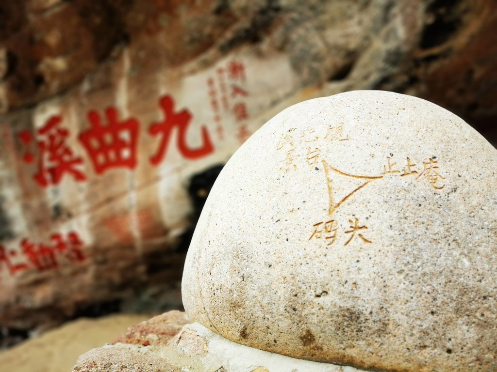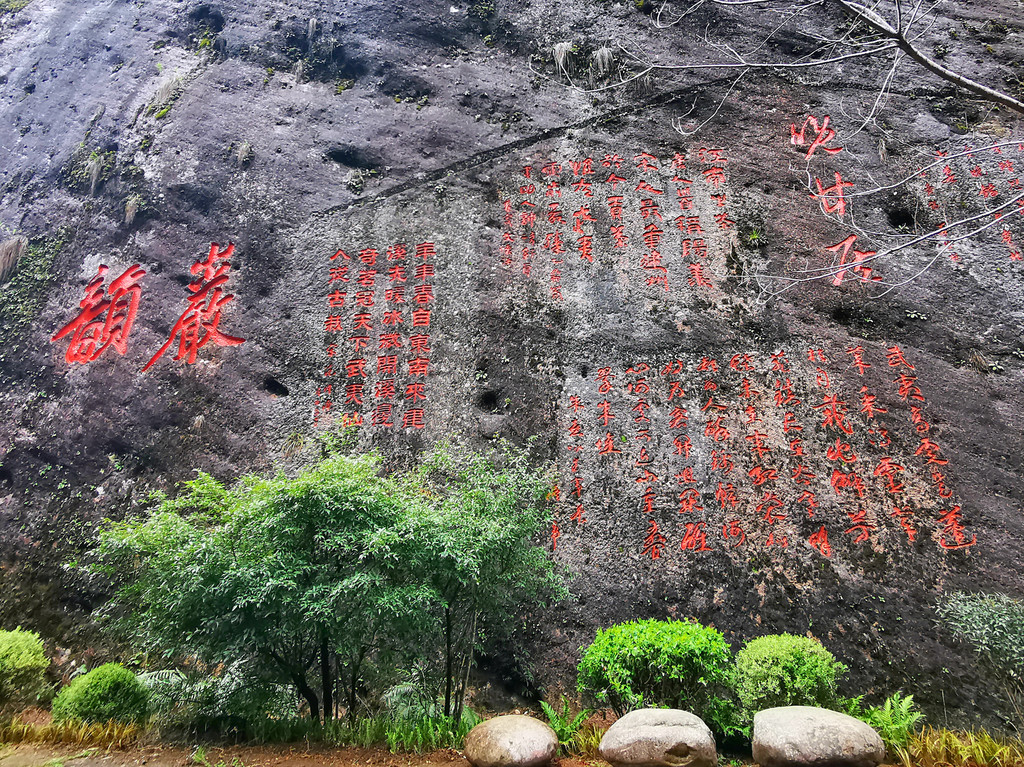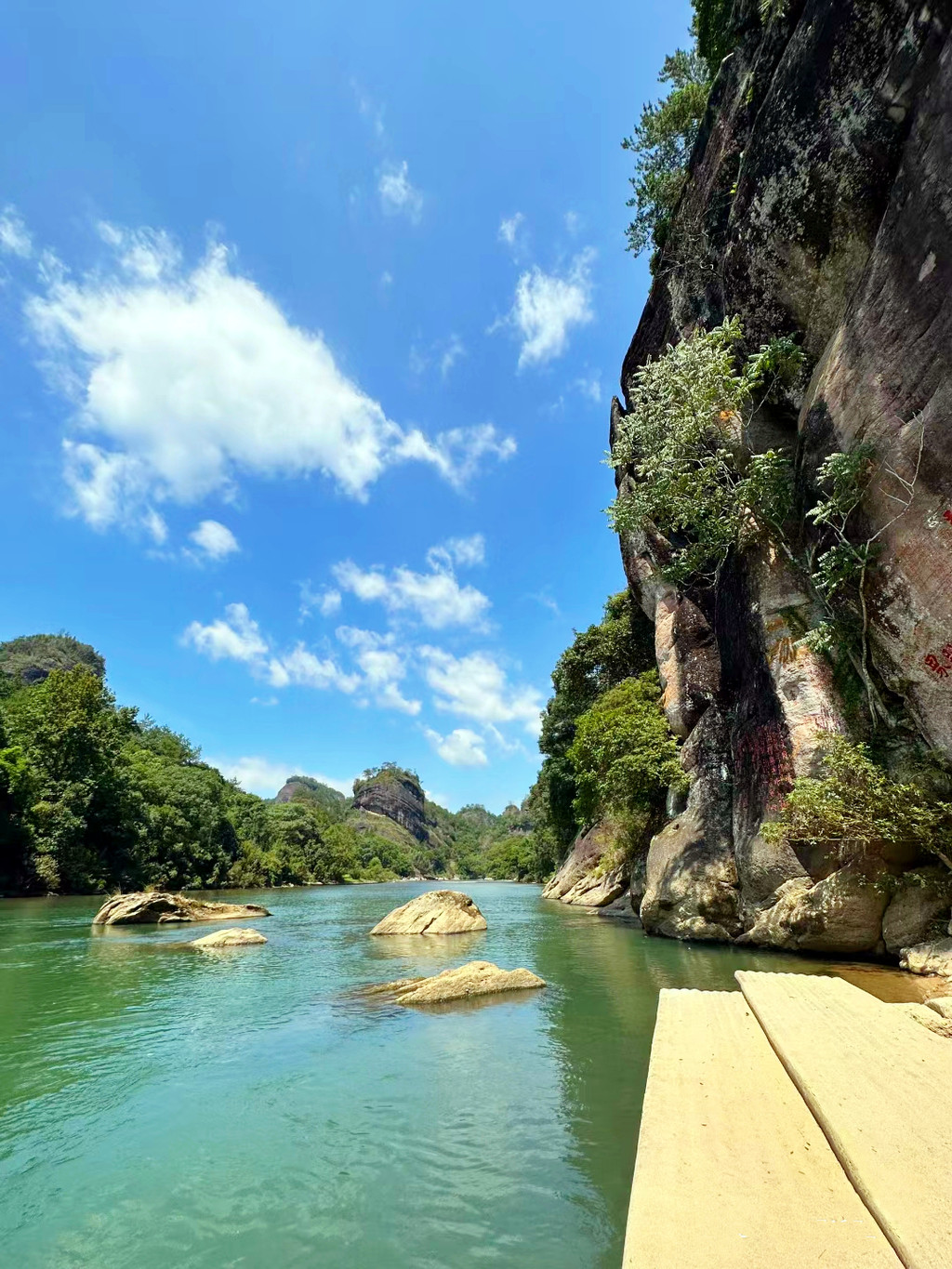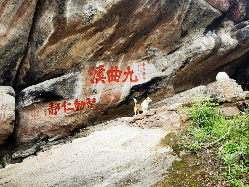 既没有登顶天游峰,也没有从众竹筏游,不走寻常路的我独独偏爱走步道,从民宿走到南门,沿着一曲溪北岸行走,武夷宫、宋街、观鱼台、止止庵、水光石……周围翠竹环绕,一路都是平缓的石阶,武夷宫始建于唐天宝年间,至今已有1000多年历史,是武夷山最古老的宫院,历代王朝曾在此祭祀武夷神君,是宋代全国六大名观之一,宫内有两株千年桂树,龙盘蛇曲,被称为“桂花王”,古色古香的仿宋古街长300米,店铺林立却难有看点,还是带上面包去观鱼台喂喂九曲溪的鱼,溪水清澈见底,鱼戏水中,大大小小的溪鱼被喂得脑满肠肥,这里也是陆上欣赏玉女峰的绝佳取景处,曲径通幽,转弯后终于惊现掩于竹林中的止止庵,止止庵清幽宁静,始建于晋朝,距今已有1700多年,是中国道教南宗祖庭,位列道教36洞天之第十六洞天,几经毁损又修葺扩建……山门撰联:“到此十六洞天方知天外有天当止则止,仰其百千仙道始悟道非可道应行便行”,门上的对联也甚是有趣,“一山恁么可爱,多人到此茫然”,庵内有一树龄140年左右的苦槠树,中间朽空,在止止庵重新开放的2015年,有一绿竹从树根中间破土而出,笔直穿过朽空的树干冲天而上,这一“胸有成竹”奇观,验证了武夷山儒释道三教合一、三源归流的文化观象。跨过止止庵右侧石桥,不远处就是水光石崖刻处,岩壁高约数丈,临溪而立,密密麻麻刻满历代名人的石刻,随手一拍,极为壮观,正巧有只秋田犬站在高处遥望,不经意间成为了画面的主角。