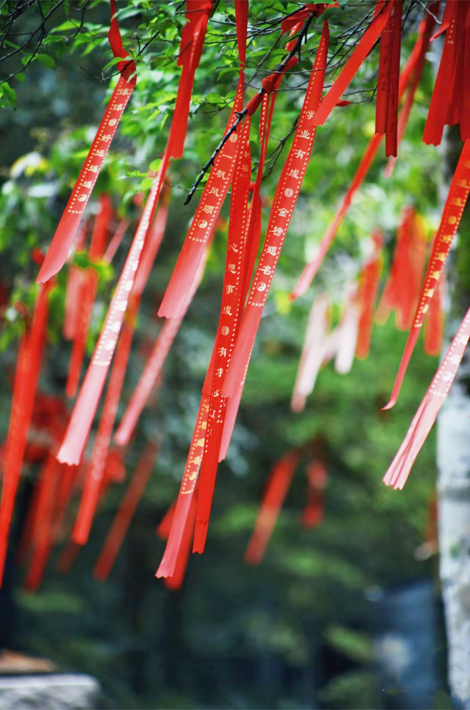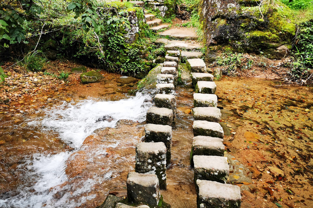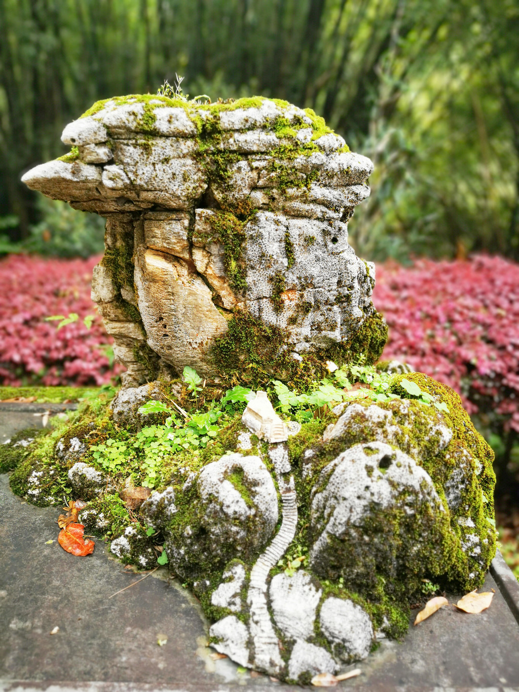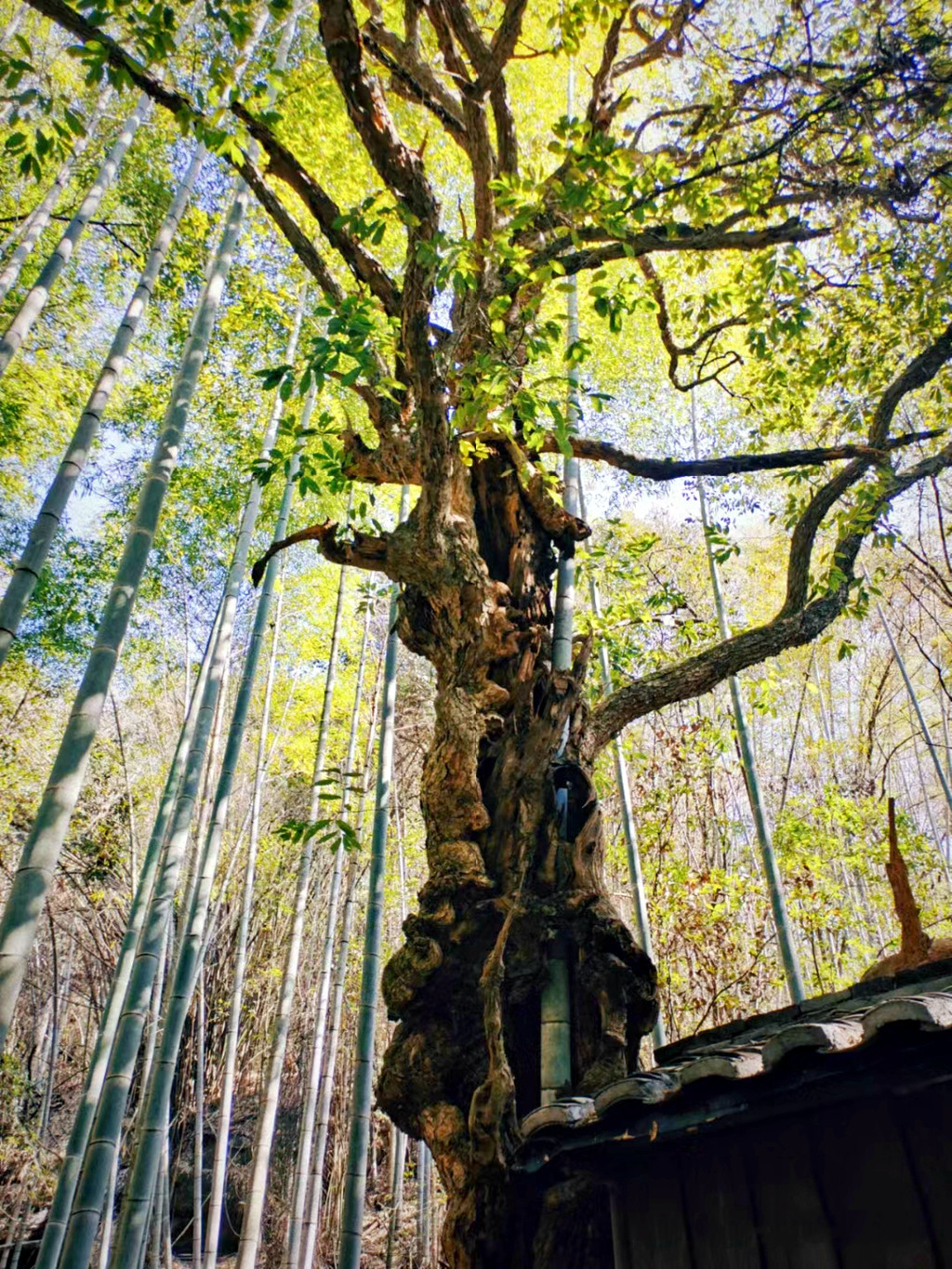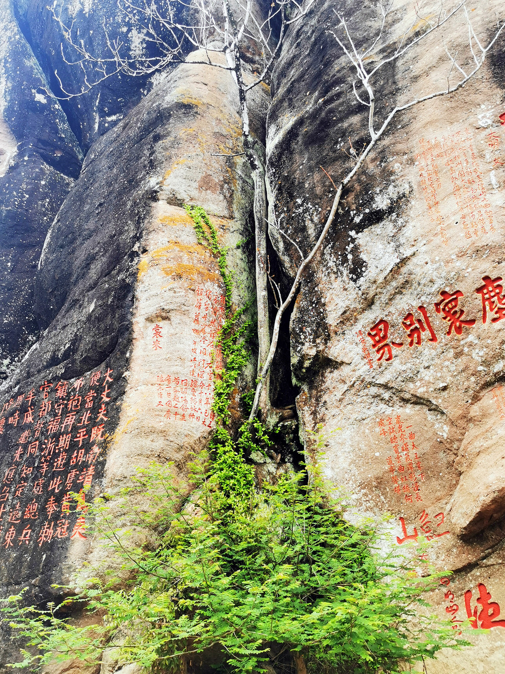既没有登顶天游峰,也没有从众竹筏游,不走寻常路的我独独偏爱走步道,从民宿走到南门,沿着一曲溪北岸行走,武夷宫、宋街、观鱼台、止止庵、水光石……周围翠竹环绕,一路都是平缓的石阶,武夷宫始建于唐天宝年间,至今已有1000多年历史,是武夷山最古老的宫院,历代王朝曾在此祭祀武夷神君,是宋代全国六大名观之一,宫内有两株千年桂树,龙盘蛇曲,被称为“桂花王”,古色古香的仿宋古街长300米,店铺林立却难有看点,还是带上面包去观鱼台喂喂九曲溪的鱼,溪水清澈见底,鱼戏水中,大大小小的溪鱼被喂得脑满肠肥,这里也是陆上欣赏玉女峰的绝佳取景处,曲径通幽,转弯后终于惊现掩于竹林中的止止庵,止止庵清幽宁静,始建于晋朝,距今已有1700多年,是中国道教南宗祖庭,位列道教36洞天之第十六洞天,几经毁损又修葺扩建……山门撰联:“到此十六洞天方知天外有天当止则止,仰其百千仙道始悟道非可道应行便行”,门上的对联也甚是有趣,“一山恁么可爱,多人到此茫然”,庵内有一树龄140年左右的苦槠树,中间朽空,在止止庵重新开放的2015年,有一绿竹从树根中间破土而出,笔直穿过朽空的树干冲天而上,这一“胸有成竹”奇观,验证了武夷山儒释道三教合一、三源归流的文化观象。跨过止止庵右侧石桥,不远处就是水光石崖刻处,岩壁高约数丈,临溪而立,密密麻麻刻满历代名人的石刻,随手一拍,极为壮观,正巧有只秋田犬站在高处遥望,不经意间成为了画面的主角。