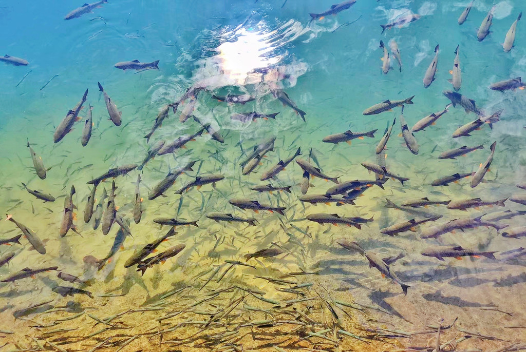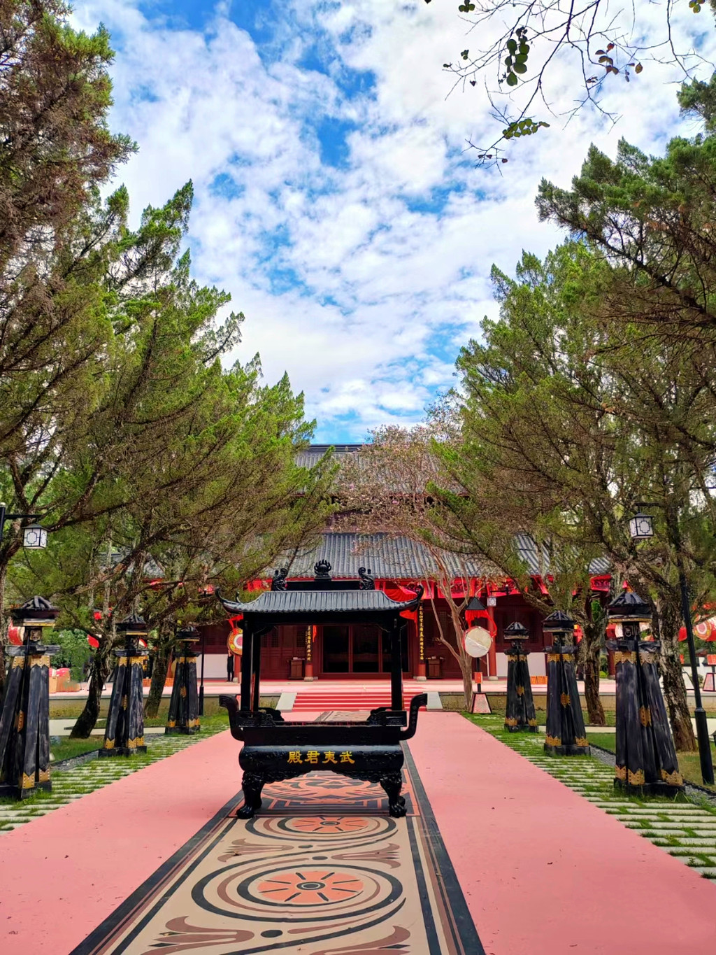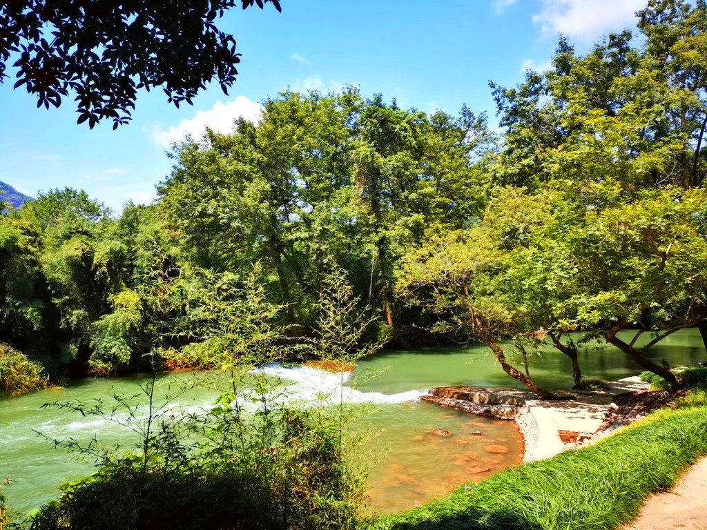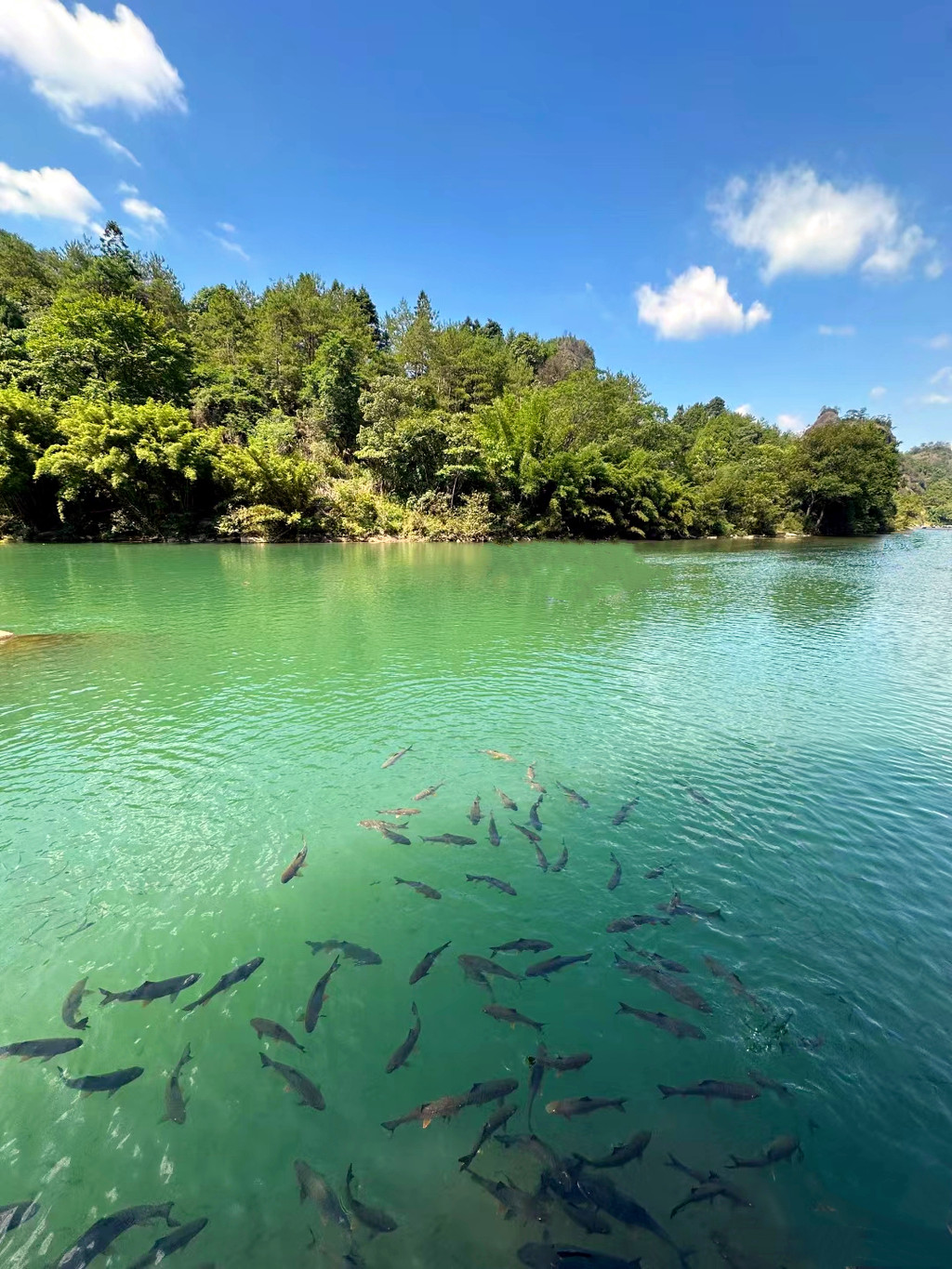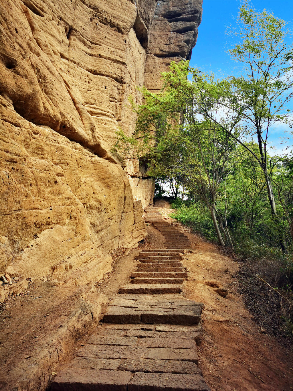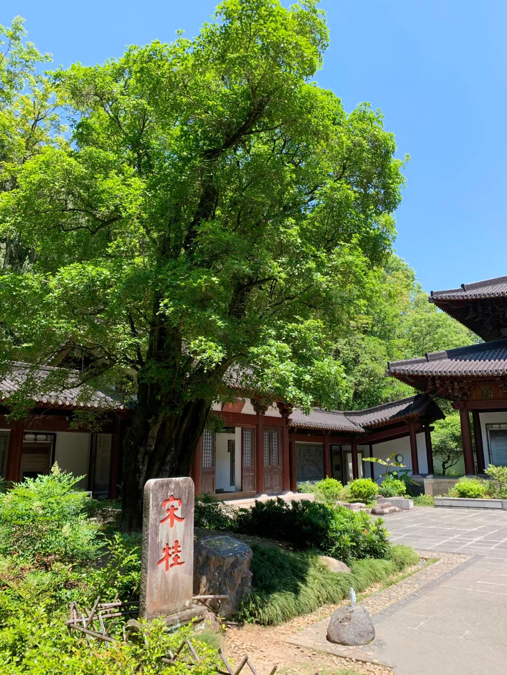 既没有登顶天游峰,也没有从众竹筏游,不走寻常路的我独独偏爱走步道,从民宿走到南门,沿着一曲溪北岸行走,武夷宫、宋街、观鱼台、止止庵、水光石……周围翠竹环绕,一路都是平缓的石阶,武夷宫始建于唐天宝年间,至今已有1000多年历史,是武夷山最古老的宫院,历代王朝曾在此祭祀武夷神君,是宋代全国六大名观之一,宫内有两株千年桂树,龙盘蛇曲,被称为“桂花王”,古色古香的仿宋古街长300米,店铺林立却难有看点,还是带上面包去观鱼台喂喂九曲溪的鱼,溪水清澈见底,鱼戏水中,大大小小的溪鱼被喂得脑满肠肥,这里也是陆上欣赏玉女峰的绝佳取景处,曲径通幽,转弯后终于惊现掩于竹林中的止止庵,止止庵清幽宁静,始建于晋朝,距今已有1700多年,是中国道教南宗祖庭,位列道教36洞天之第十六洞天,几经毁损又修葺扩建……山门撰联:“到此十六洞天方知天外有天当止则止,仰其百千仙道始悟道非可道应行便行”,门上的对联也甚是有趣,“一山恁么可爱,多人到此茫然”,庵内有一树龄140年左右的苦槠树,中间朽空,在止止庵重新开放的2015年,有一绿竹从树根中间破土而出,笔直穿过朽空的树干冲天而上,这一“胸有成竹”奇观,验证了武夷山儒释道三教合一、三源归流的文化观象。跨过止止庵右侧石桥,不远处就是水光石崖刻处,岩壁高约数丈,临溪而立,密密麻麻刻满历代名人的石刻,随手一拍,极为壮观,正巧有只秋田犬站在高处遥望,不经意间成为了画面的主角。
