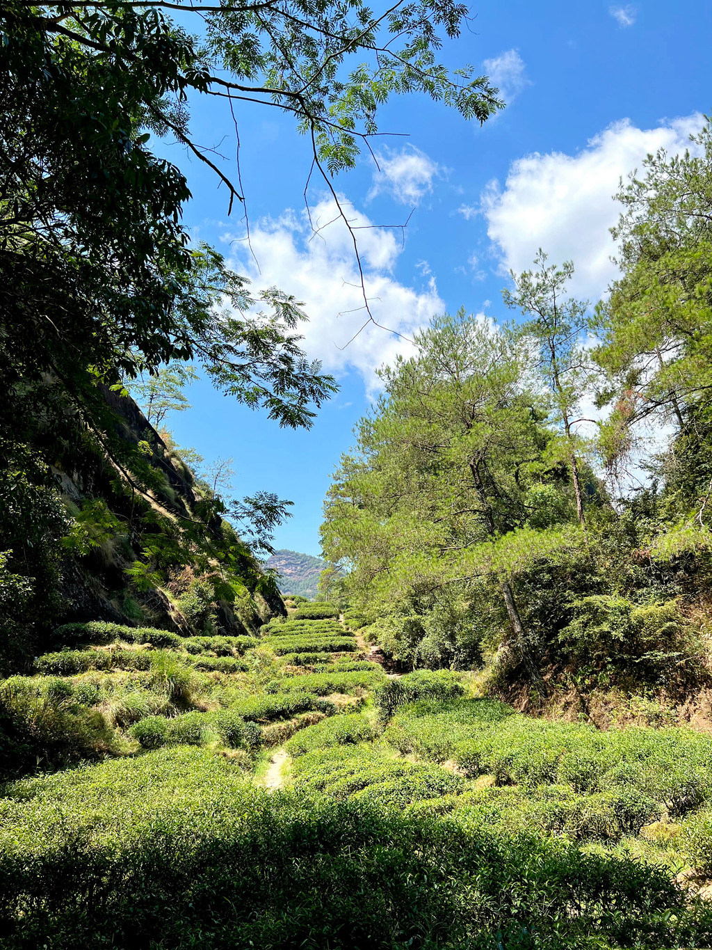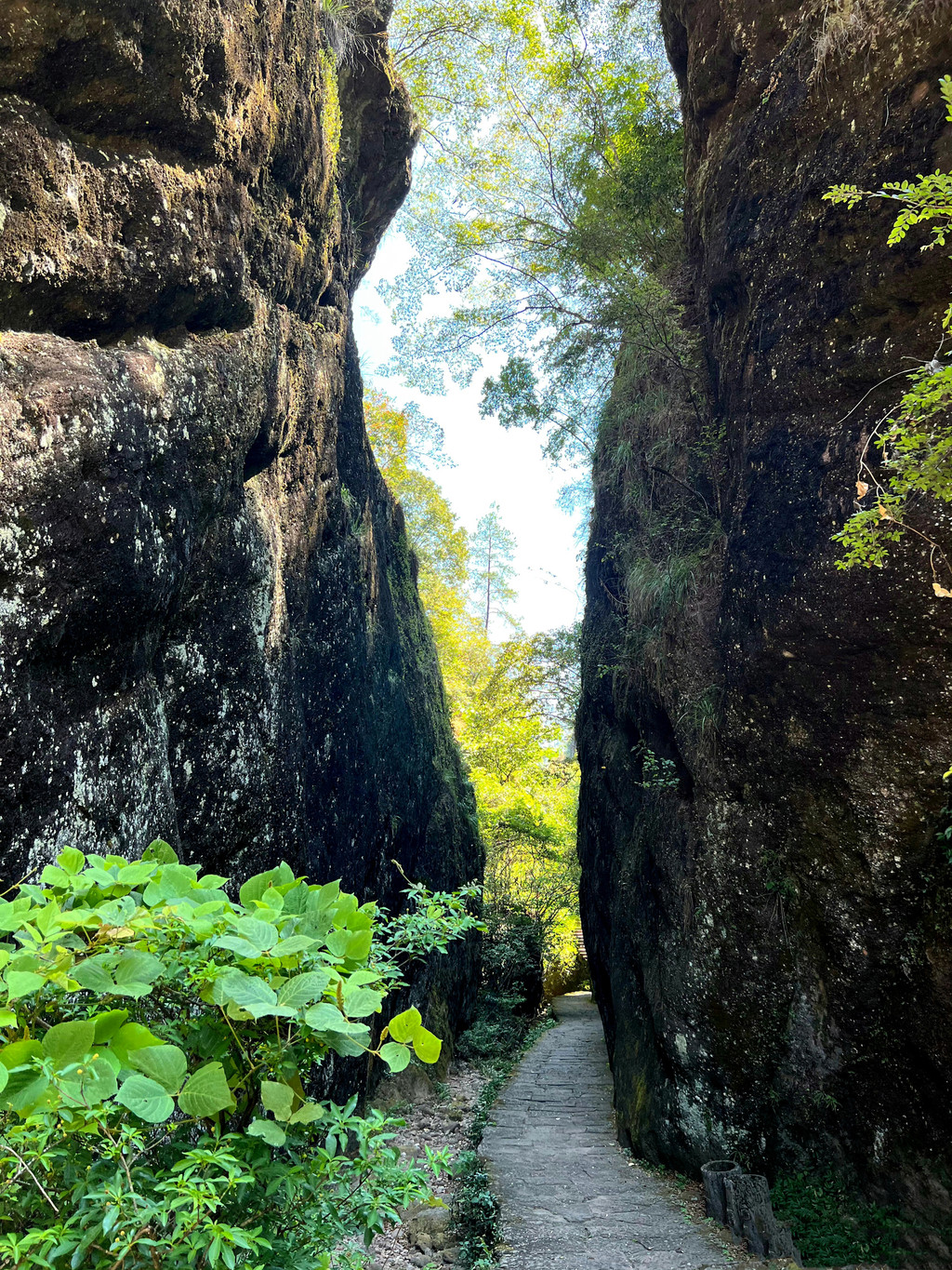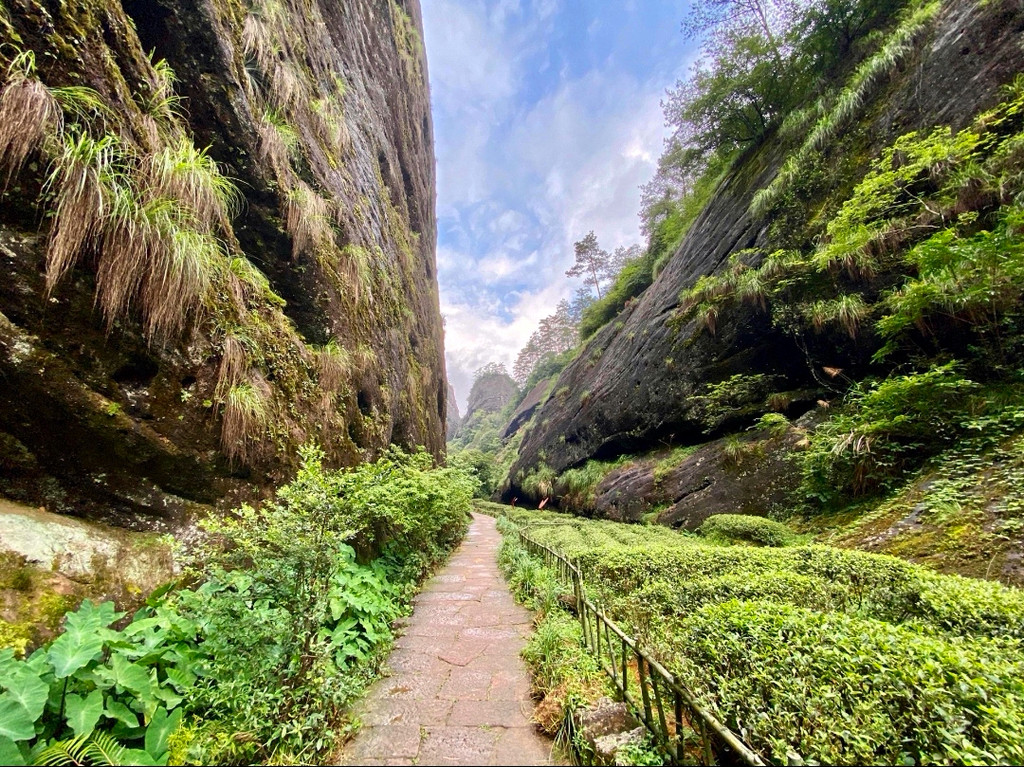 探访大红袍母树后,缓步行走于岩骨花香漫游道,风景绝美,人也相对更少,可以真切感受到武夷岩茶的岩韵由来,走过倒水坑和流香涧,曲径通幽处是慧苑禅寺,再远观鹰嘴岩、仰望天车架古崖居,最后到终点水帘洞看白龙戏水,一路走来幽静惬意,山涧溪流清风,鸟语花香,武夷山最好最核心的茶叶产区都在这条路周边散布,因此也被本地人称为“最贵最浪漫的路”。