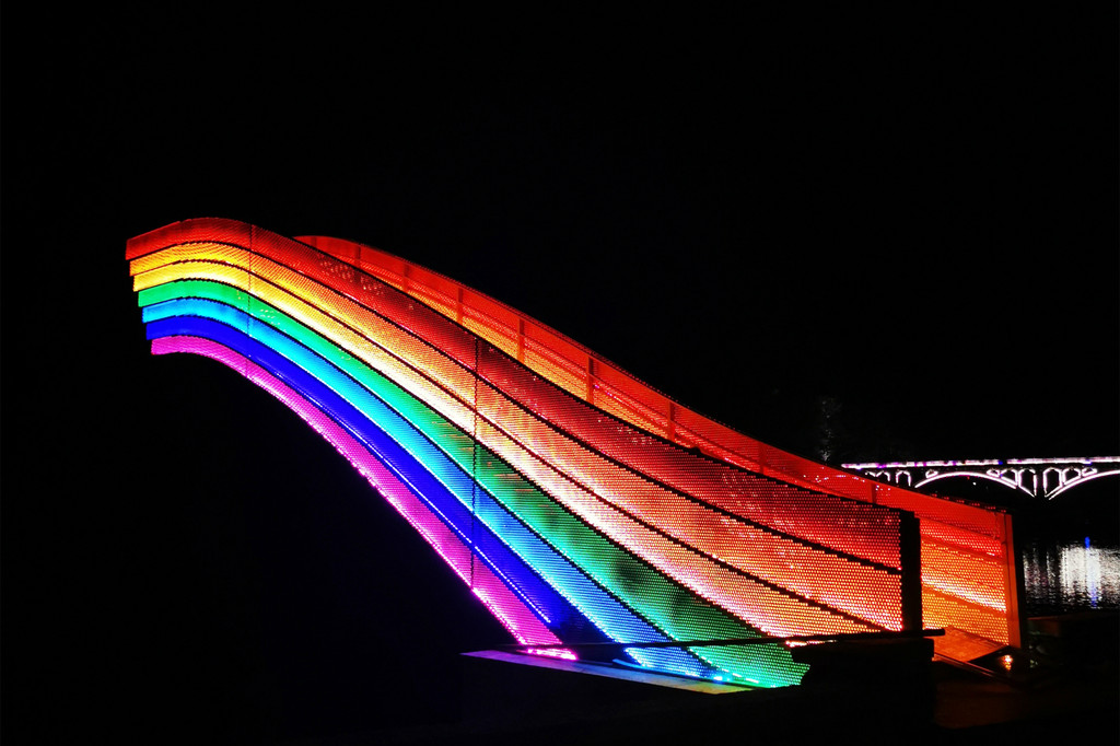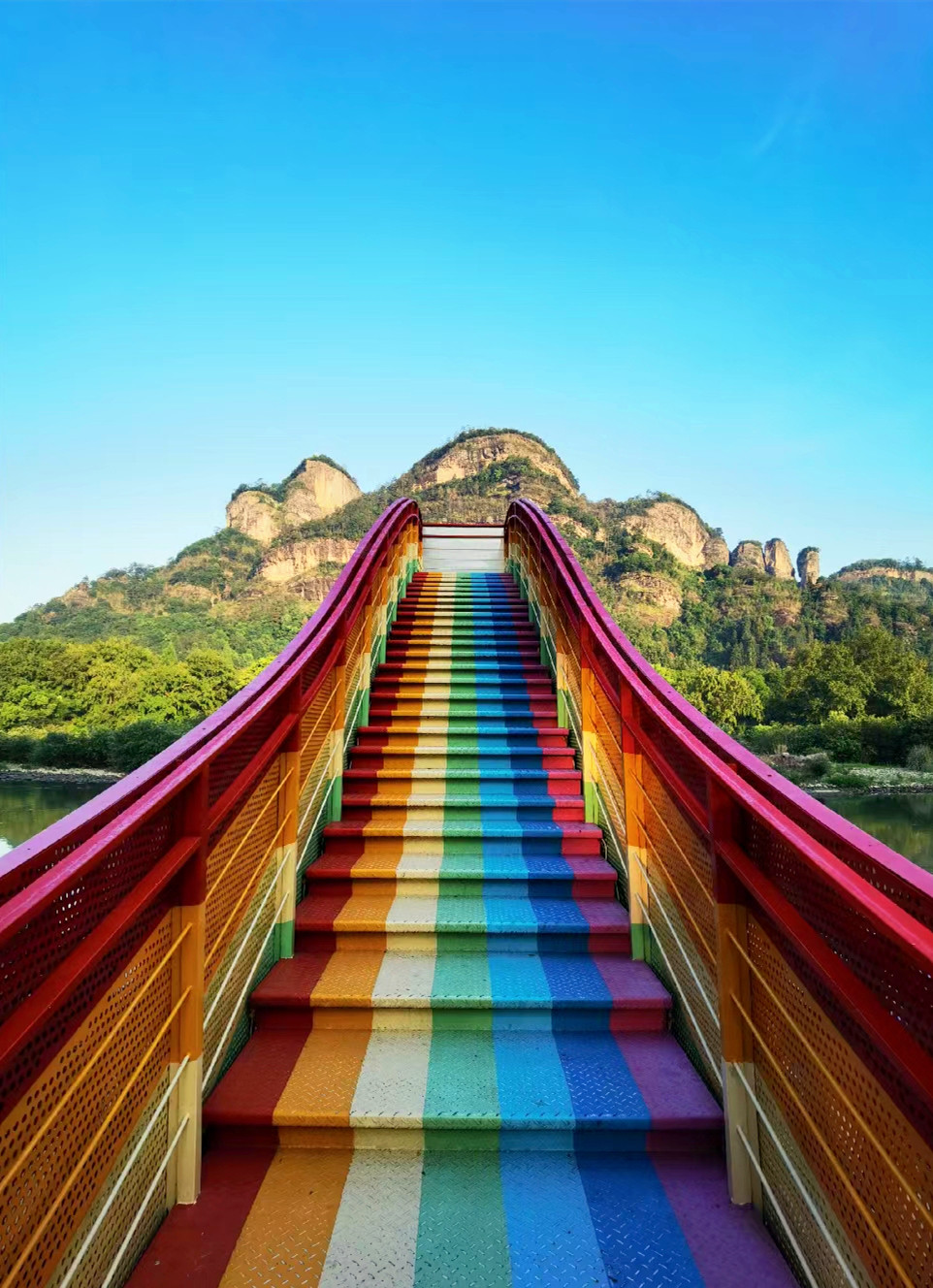 “虹桥飞渡”设计灵感源自幔亭峰美丽的传说:“武夷君与皇太姥等十三仙人,在峰顶张幔为亭,结彩为屋,大宴乡人,应召而来的男女二千多人,循虹桥鱼贯而上”。平台以半道彩虹为造型,探出崇阳溪,向幔亭峰挑出,特别是晚上成为夜空中最亮的桥,人们通过彩色台阶拾阶而上,犹如循着彩虹走向幔亭峰,亲身体验美丽的传说。
