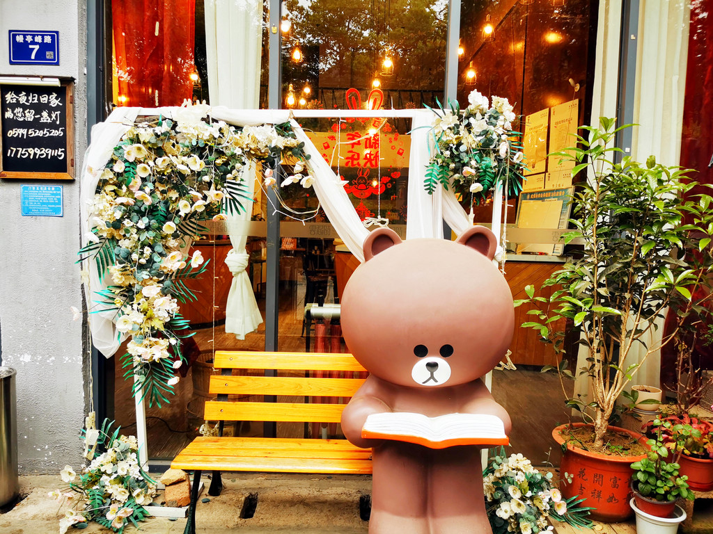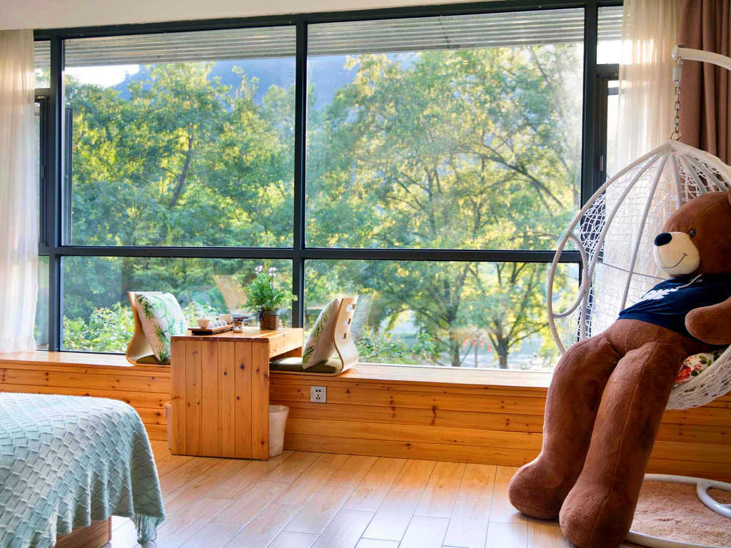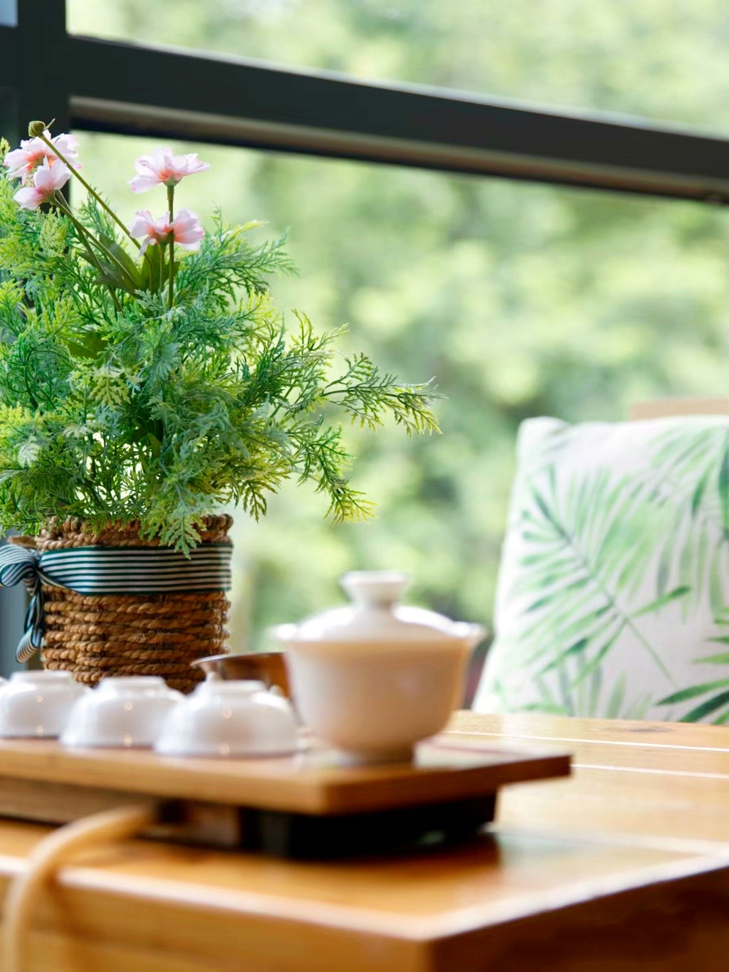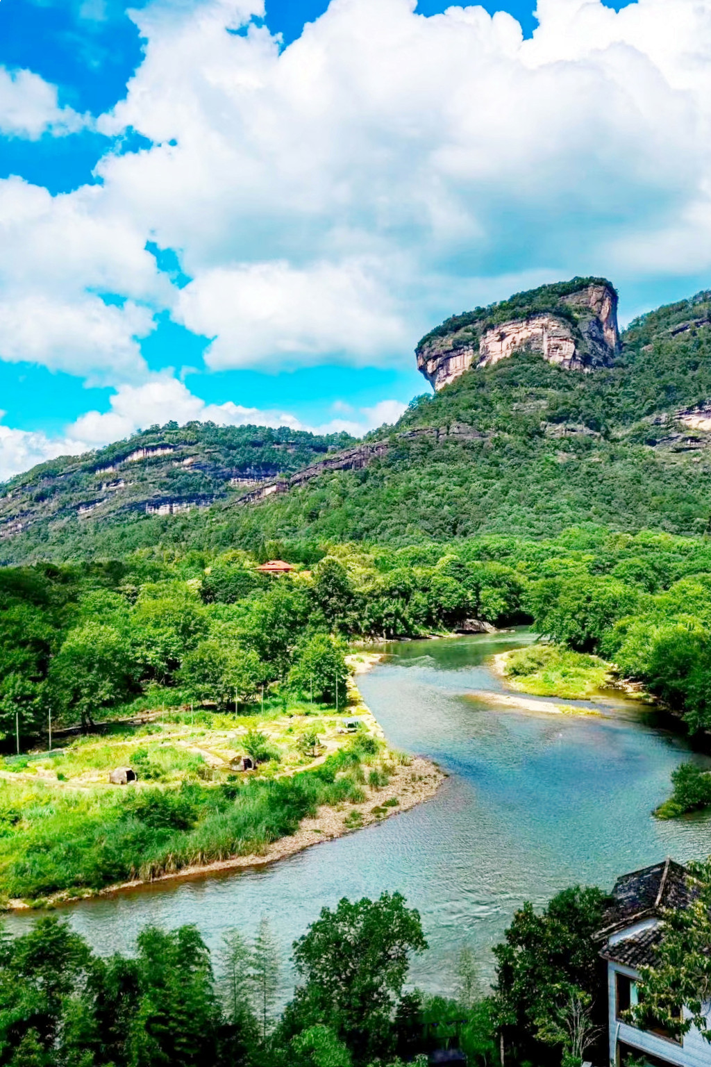 从黄山搭乘高铁抵达武夷山北站仅需一小时,民宿贴心安排了司机前来接站,直奔三姑度假区,这里距离景区南门很近,我们预订的旧街五号云起时位置绝佳,景观无敌,门前就是崇阳溪,拉开窗帘大王峰便映入眼帘,步行不远即可抵达印象大红袍剧场。听闻“云起时”这个名字,我想民宿老板一定是个很浪漫的人,风景正当时去看天边云卷云舒,云起时人间皆是浪漫……民宿入口处的门是铁艺爬藤架,夏天的藤蔓郁郁葱葱,形成了一个藤蔓欢迎门,走进去就是布朗熊大公仔拍照点,和周围的花花草草非常搭配,感觉走进了一个小花园,穿过花园小径进入民宿大堂,文艺复古,每一个恰到好处的小摆件、简约舒适的图书角和复古典雅的茶室,每层楼的楼道里都放置了烘茶的设备,让人好奇驻足,筐里的残茶烘干后楼道里散发出淡淡的茶香,相比香水这一缕茶香更沁人心脾,办理入住就收到了精致的伴手礼,有旅游地图、茶包零食等,夜里还会提供免费的暖心甜汤,每天都有安排免费茶艺品茗和植物拓染体验,喝着茶香四溢的大红袍听茶艺师侃侃而谈武夷山的茶文化,采摘落叶落花把武夷山的植物拓印保存带回家,将大山留在一方绢帕。房内空间宽敞,超大采光落地玻璃窗,长长的木塌,小巧精致的茶桌,搭两个榻榻米椅,配上暖柔轻软的靠枕,整个下午或晚上,久久的待着懒着赖着,泡茶品茗听音乐刷手机甚至打个盹儿,消磨着享受着挥霍着,一任光阴,在无所事事浑然不觉中分秒流逝......