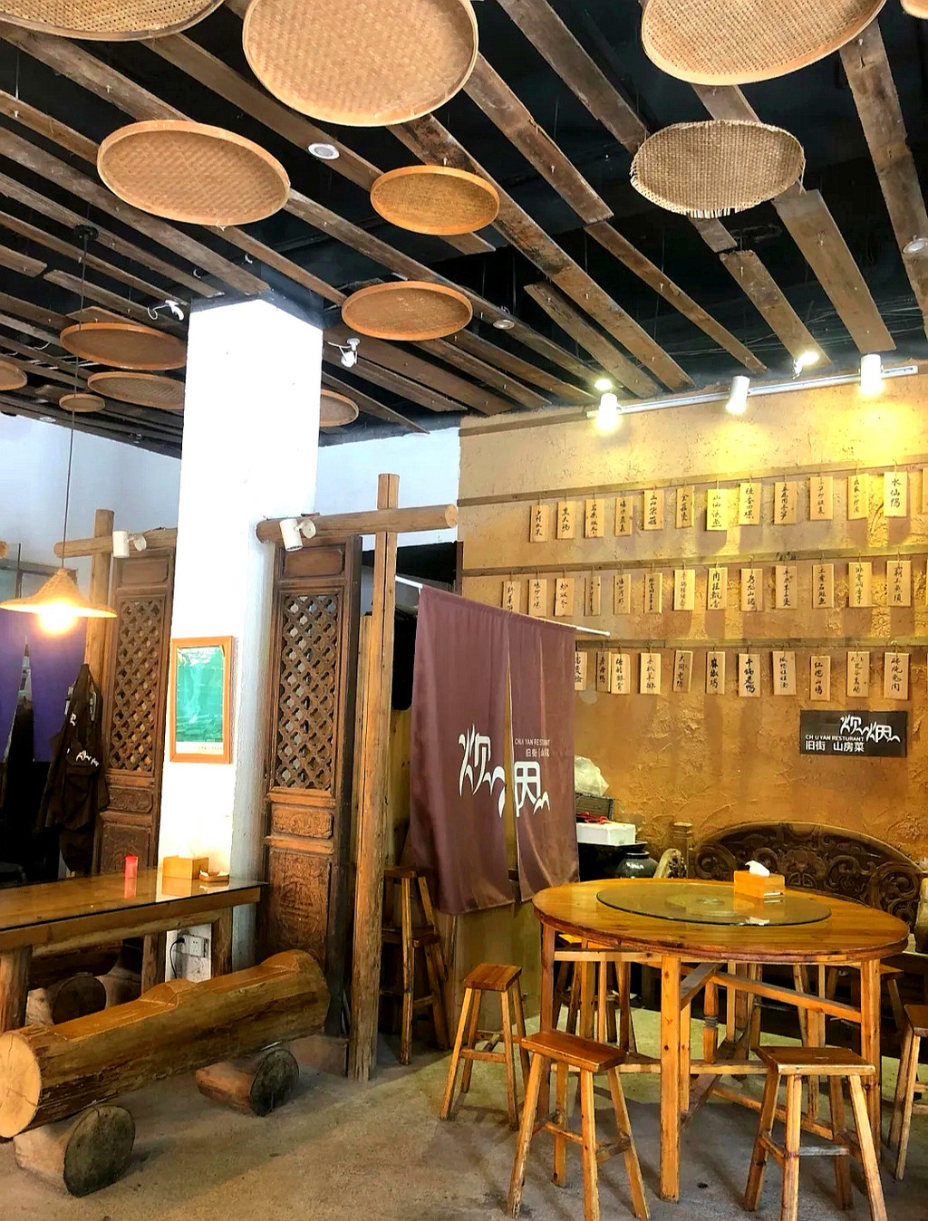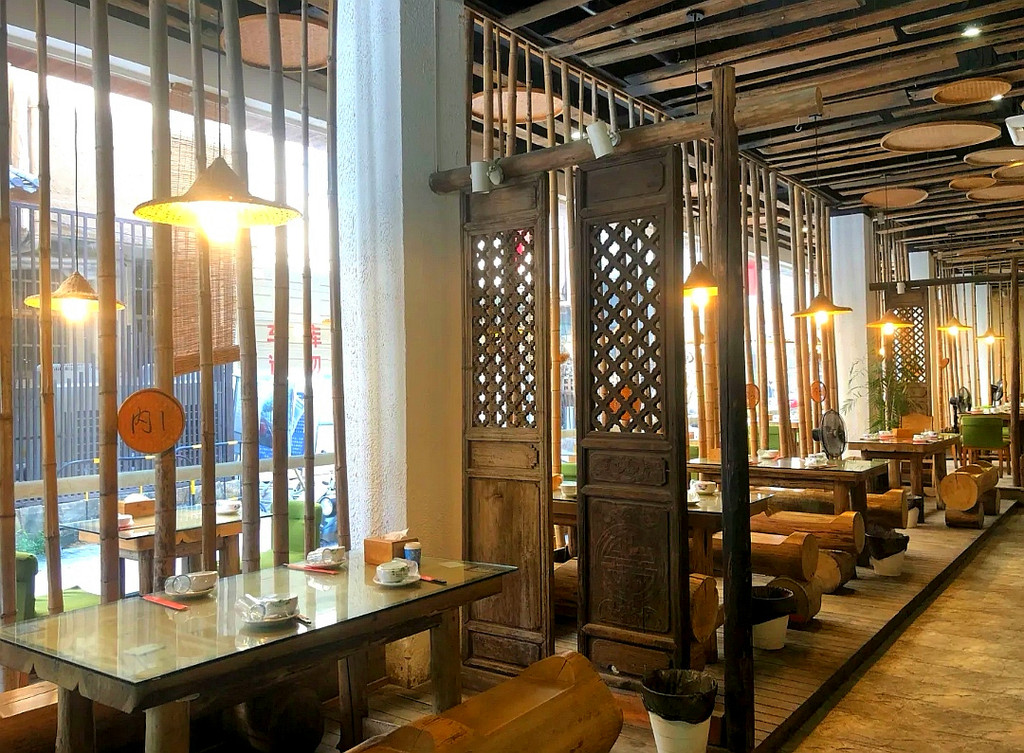 民宿后街就是一整条美食街,几天时间可以一家家慢慢吃过来,中午先去楼下民宿同系列的主题餐厅——炊烟山房,本地网红店铺之一,装修淳朴自然,全竹木格调,菜品都很有当地风味,连配茶都好喝,熏鹅是武夷山特色,由茶叶、桂叶、糯米和鹅肉一起熏制而成,素有“无鹅不成席”的说法,没吃过熏鹅,就不算来过武夷山,口感微辣香嫩入味,以茶入肴是武夷山一大特色,肉桂飘香茶香和孜然味道融合得很好,高温油炸后茶叶的清香完全被激发出来并且融入了肉中,里面的茶叶香香脆脆的,炸过的里脊肉也很香,苋菜芋子汤做法很特别,汤鲜芋糯,小笋酸菜鲜嫩酸爽超级下饭。