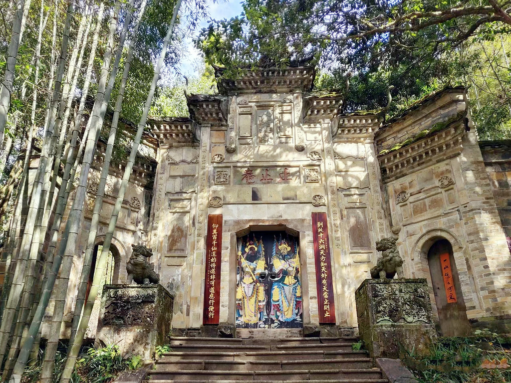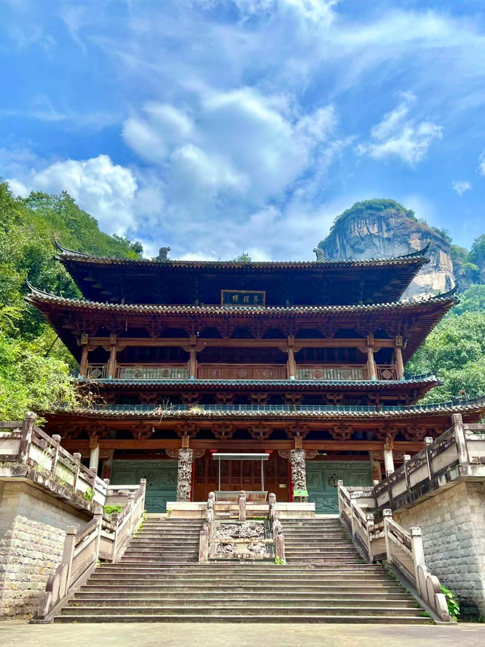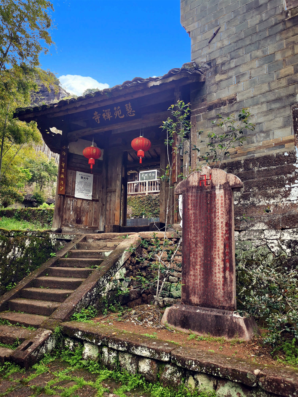 慧苑禅寺,又名法华寺,始建于宋代,明末清初重建,民居院落布局,青灯古佛,幽幽山谷,甚至没有山墙,一盏破败山门,聊胜于无。相传南宋思想家朱熹曾在寺中留宿,殿内抱柱的一幅对联写道:"客至莫嫌茶当酒,山居偏隅竹为邻。"这是武夷山最负盛名的对联之一,迄今仍为人们所喜爱。