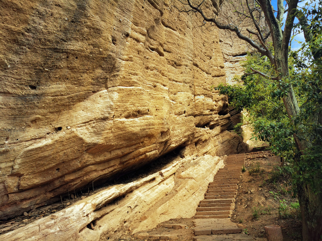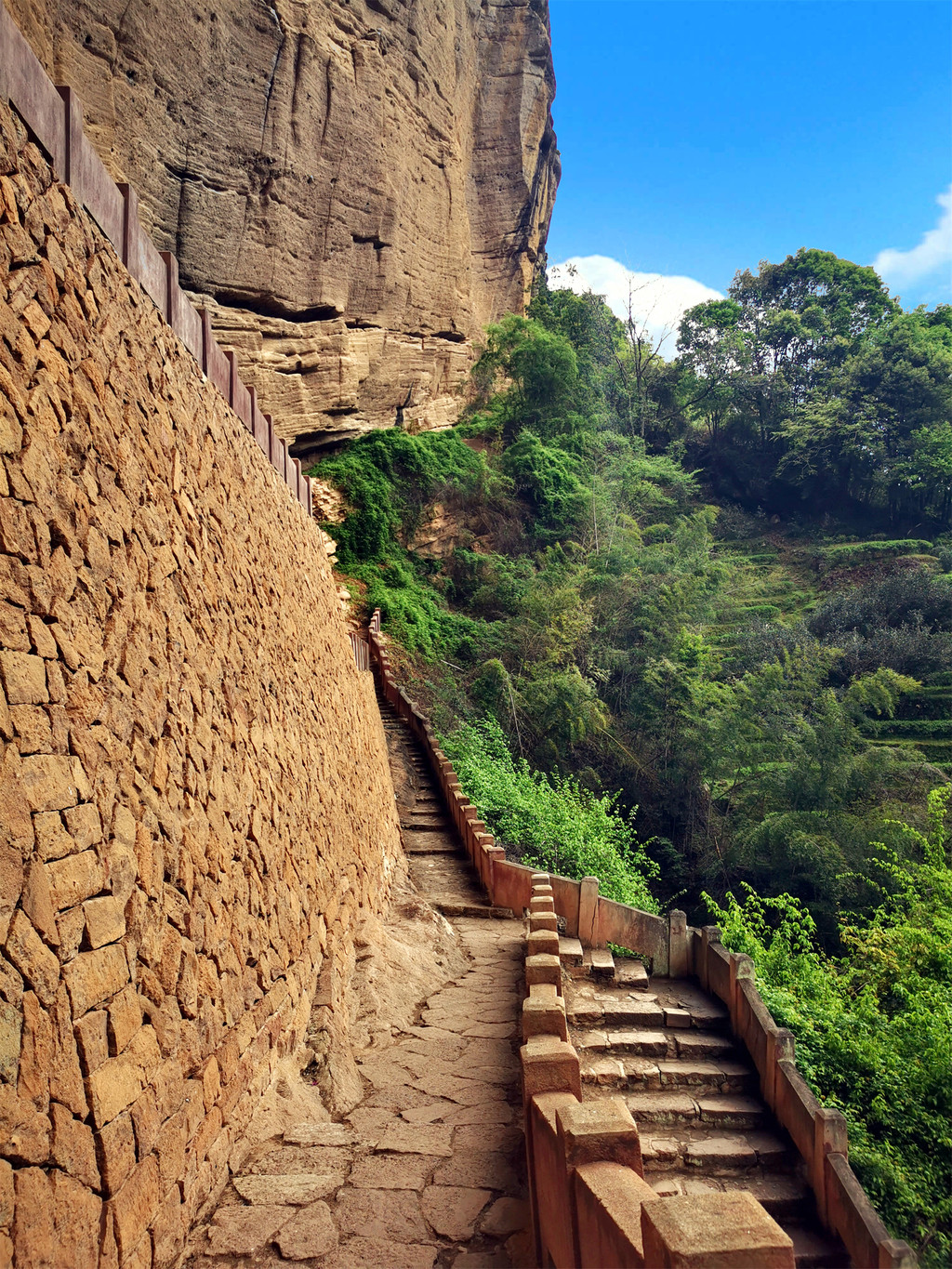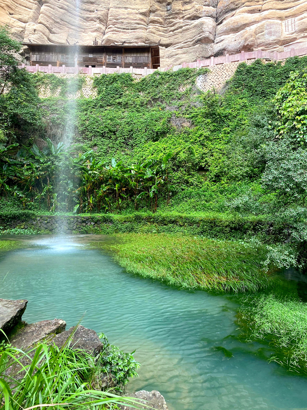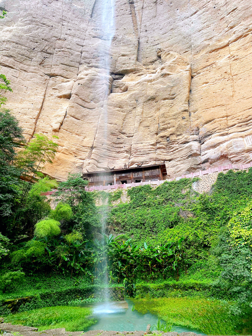 漫游道体力消耗不大,倒是终点水帘洞,需拾级而上攀爬至高处才能发现武夷山的鬼斧神工,水帘洞是武夷山最大洞穴,七十二洞之一,素有“山中最胜”之称,有一线小飞瀑自霞滨岩顶飞泻而下,微风吹动,化为水珠,洞顶危岩斜覆,洞穴深藏于收敛的岩腰之内,洞口斜向大敞可容千人,洞顶凉爽遮阳,进洞之后,仿佛是走进了山的怀抱,岩壁的透光别有一番意趣,岩石之间的缝隙都仿佛在诉说着什么,沿崖建有奉祀宋朝大儒刘子翚、朱熹、刘珙的三贤祠和奉祀孔子、老子、释迦牟尼的三教堂和清微洞真观三座遗址,岩壁上摩崖石刻比比皆是,“活源”两字最为著名,相传“活源”取自朱熹《观书有感》一诗:“半庙方塘一鉴开,天光云影共徘徊;问渠哪得清如许,为有源头活水来。”