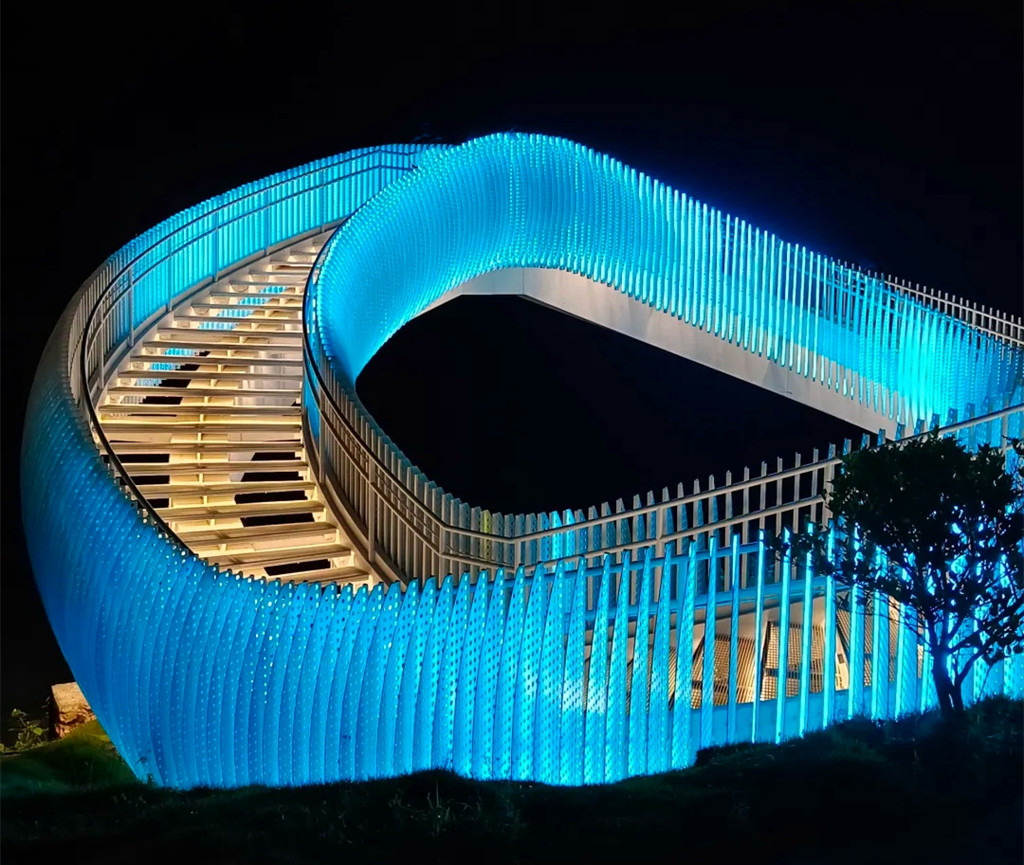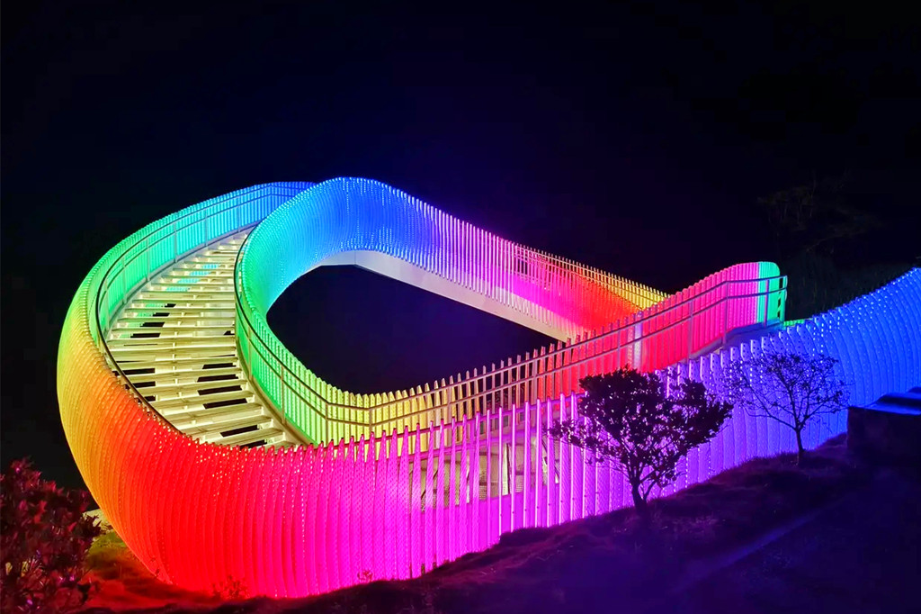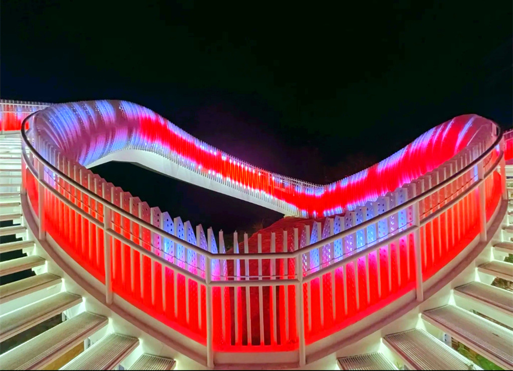 “瑞彩祥云”设计灵感来源于武夷山著名的云雾景观,通过优美的曲线造型以及白色朦胧的穿孔板围栏,平台宛如祥云一般氤氲在崇阳溪上,环绕一圈,一步一景,既可远眺大王峰与狮子峰,也可近看溪水潺潺,夜色降临,上下跳跃的霓虹,又仿佛化作了七彩祥云。